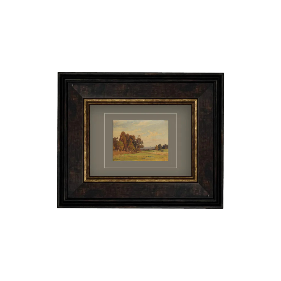 Hayfield offers a peaceful look at open fields bordered by trees, with distant hills softened under a light sky. The scene is warm and balanced, with gentle movement in the brushwork that gives it a lived-in feel. Framed in a deep, classic profile with a neutral mat, itβs a timeless piece that works well layered or hung on its own.