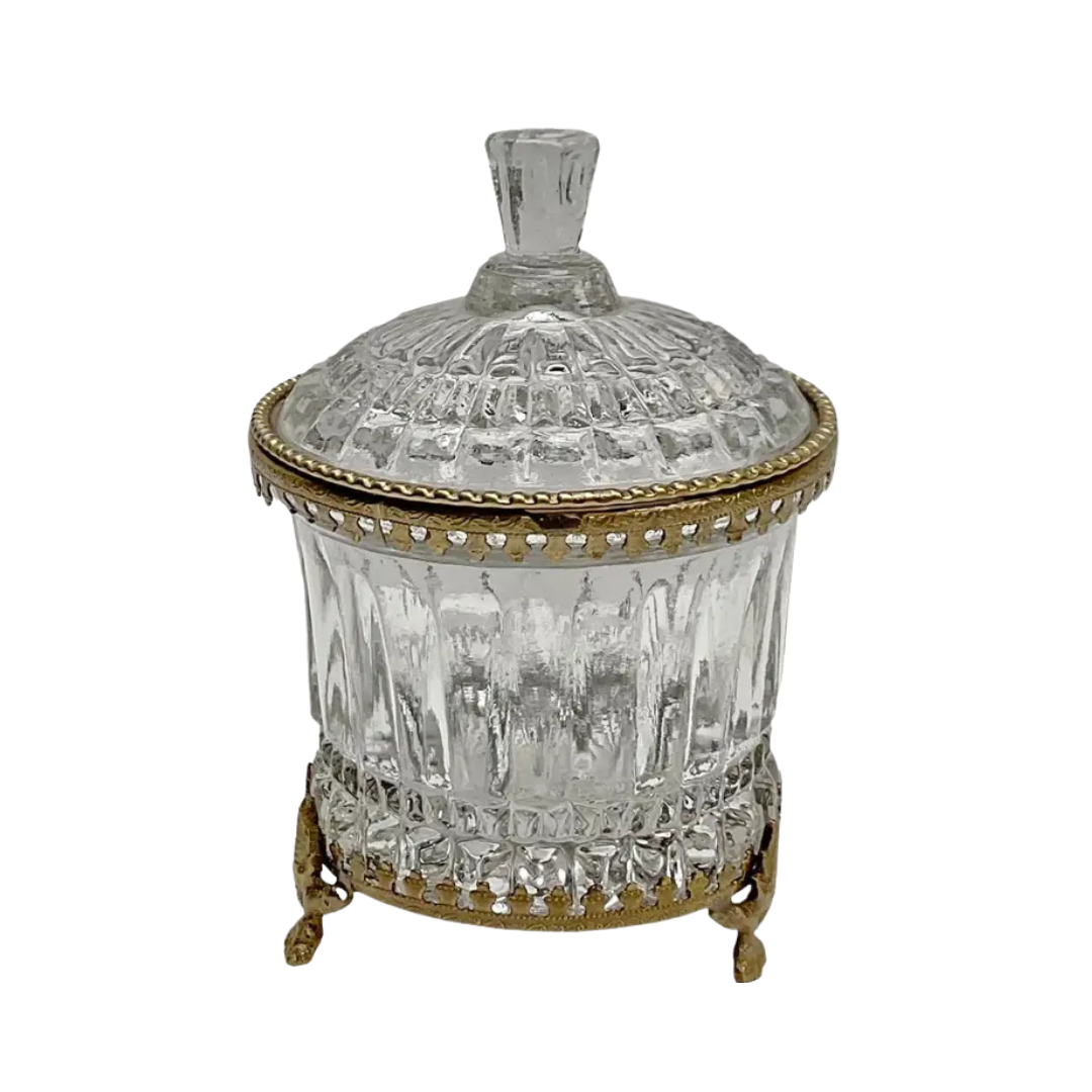 The Petite Vanity Jar showcases intricate antique golden detailing paired with beautifully embossed glass, creating a refined and luminous accent piece. Its versatile, compact size allows seamless integration into any vanity collection or as an elegant addition to a side table, enhancing your decor with subtle sophistication.