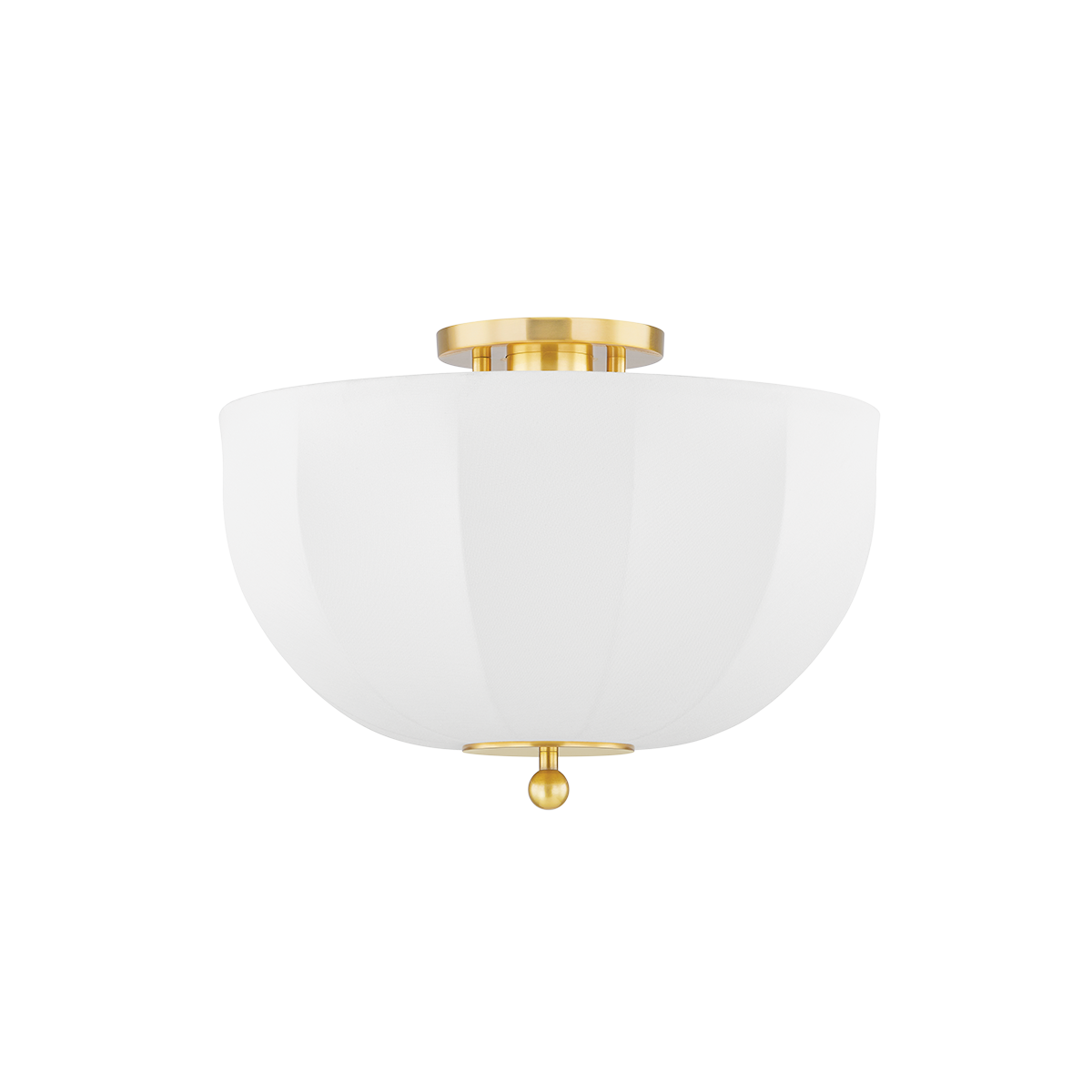 Inspired by mid-century Danish design, the Maggie light boasts a charming umbrella shape that allows light to flow through the shade and softly glow around it. Aged Brass accents on the finials add a sophisticated touch to this functional fixture.