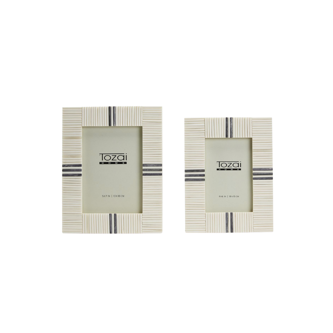 This photo frame is expertly crafted from 100% bone, with each piece hand-cut and arranged symmetrically to create a sculptural, graphic design. Accented with subtle blue details, it adds a refined touch to a variety of decor styles. Available in two sizes, 4" x 6" and 5" x 7", this frame combines artisanal craftsmanship with elegant design, making it a distinguished choice for showcasing your cherished photographs.