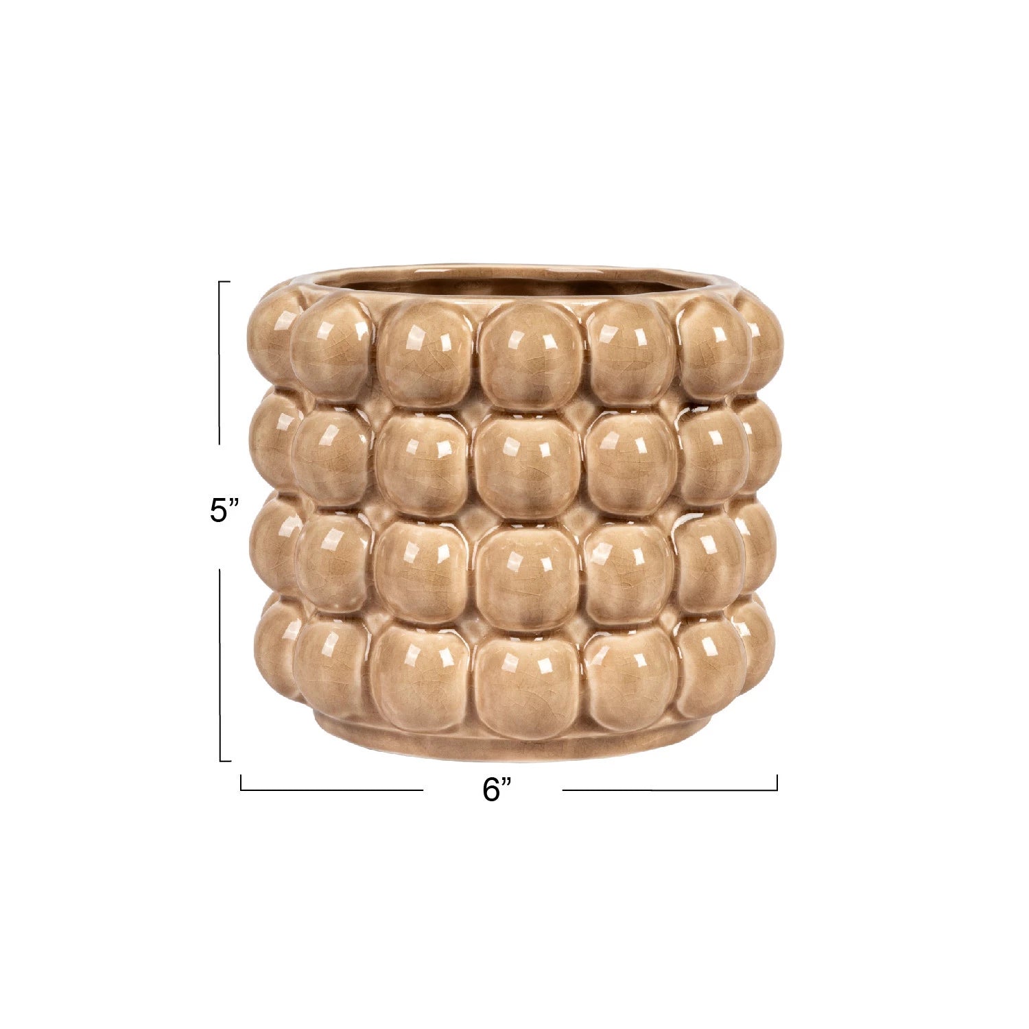 This tan stoneware planter features a durable, high-quality construction with a glossy finish and a distinctive textured surface of raised dots. Its elegant design adds subtle visual interest while providing a sturdy home for your plants, making it a refined choice to elevate any interior space.