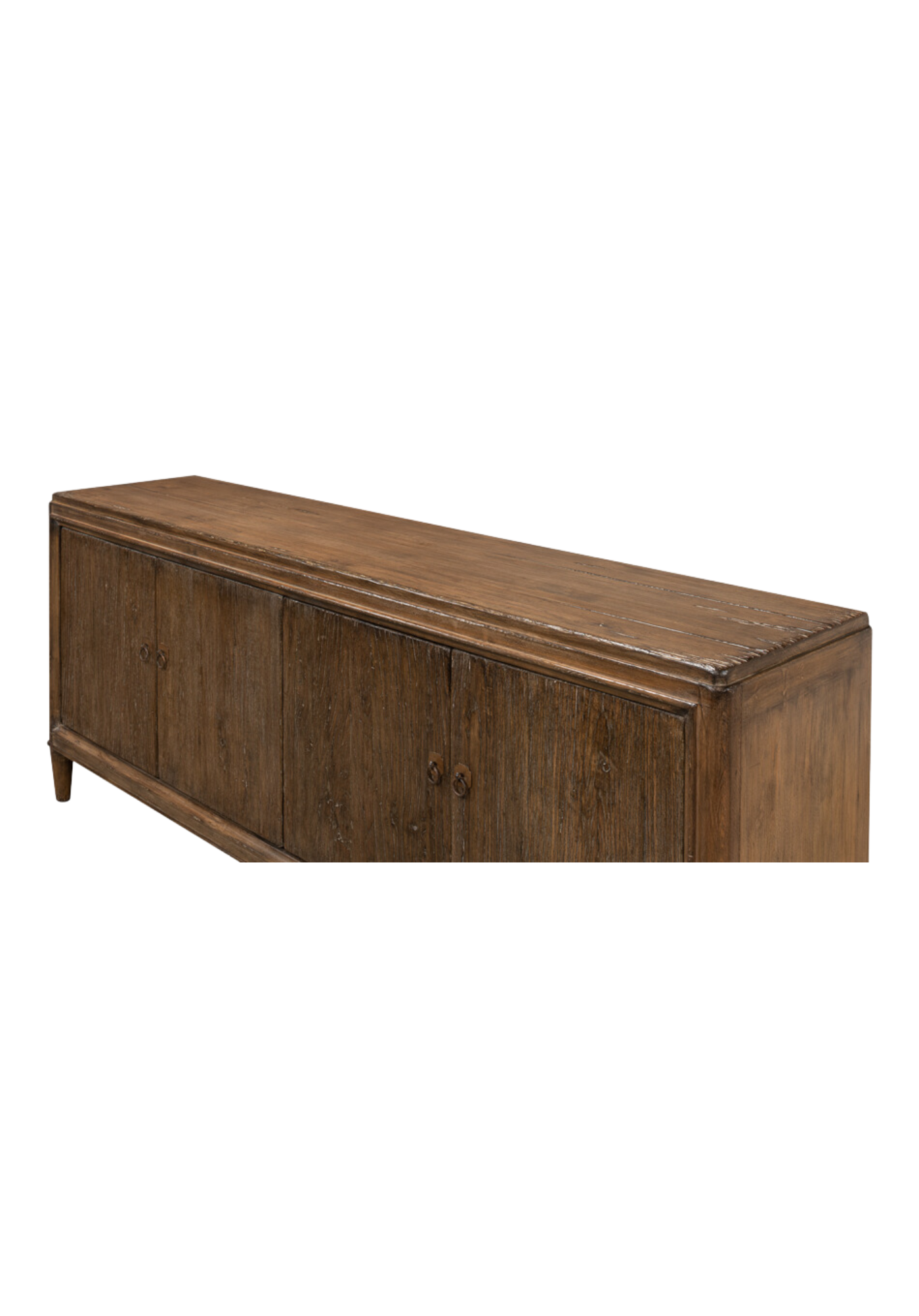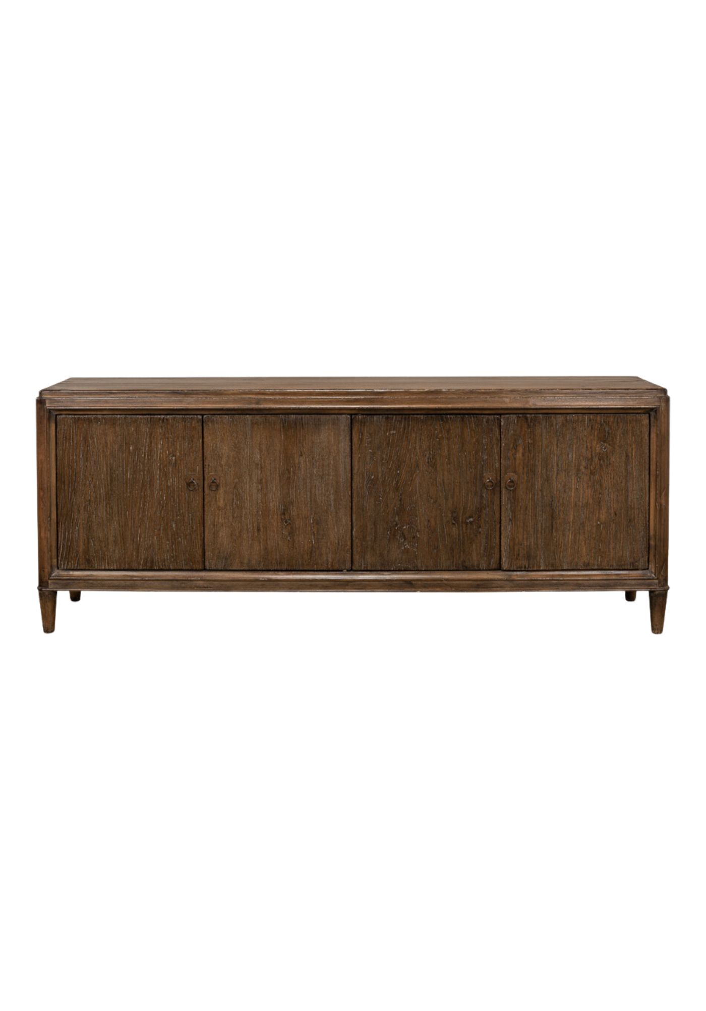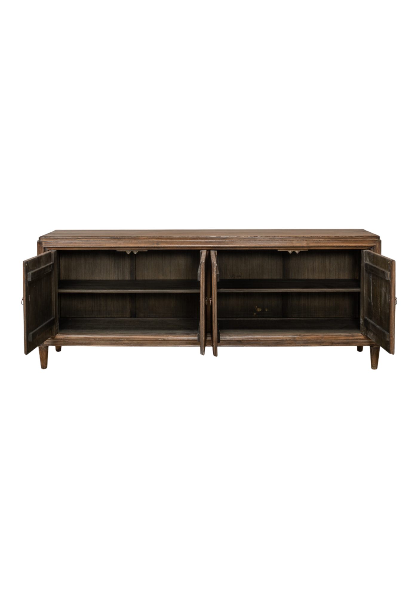 Luxurious and timeless, the Harmon Sideboard is crafted from solid Elm with four doors that open to reveal two distinct compartments. Its elegant curved tapered legs and delicate corners lend it an exquisite simplicity. For added convenience, the piece features two removable shelves.