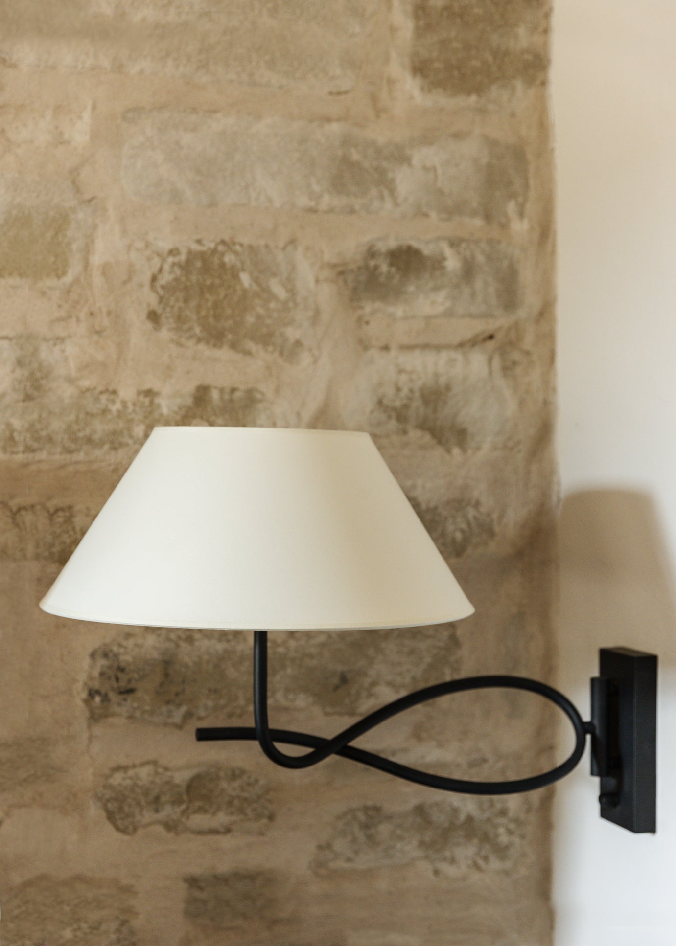 The Ali Sconce combines sculptural elegance and sophistication. Its forged iron body gracefully intertwines with a tapered paper shade, creating a striking visual contrast. Available as a floor lamp, table lamp, or portable wall sconce, the Ali Lamp adds a chic touch to any reading nook or bedside table.