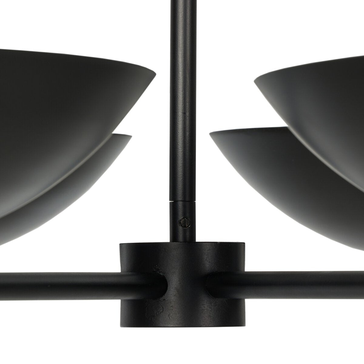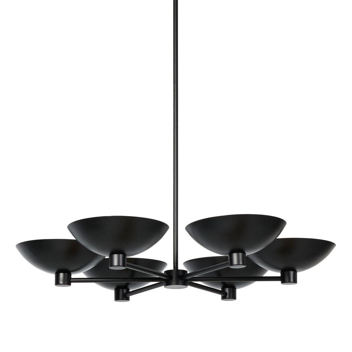 This chandelier features a modern design with aged brass domes that emit ambient light over a matte black frame. It is a versatile piece that is suitable for a variety of spaces, including those with slanted ceilings.