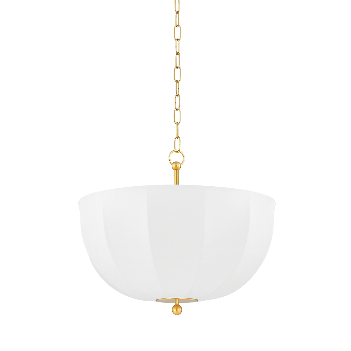 Inspired by mid-century Danish design, the Maggie light boasts a charming umbrella shape that allows light to flow through the shade and softly glow around it. Aged Brass accents on the finials add a sophisticated touch to this functional fixture.