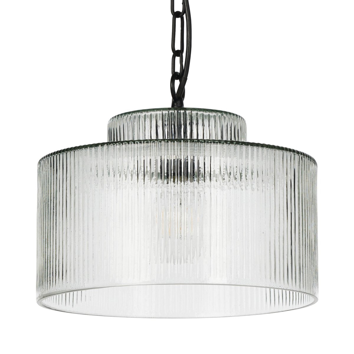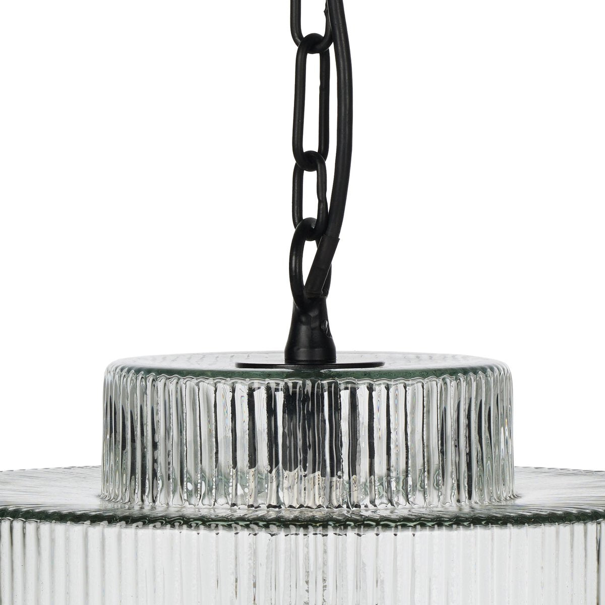 The Nell Pendant features a reeded glass design, inspired by Italian glassware, suspended by a delicate black chain. It is recommended to pair multiple pendants together for a cohesive look.