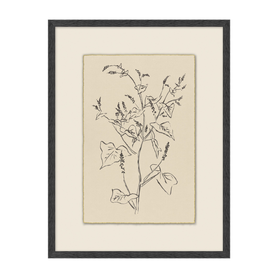 Calm Sprout 1 beautifully captures the delicate and serene essence of nature. This piece showcases intricate linework depicting a graceful sprout with fine details, rendered in elegant black ink against a soft, neutral background. The artwork is deckled and floated on a mat, complemented by a gold leaf deckled edge, adding a touch of sophistication. Perfect for infusing any space with a sense of tranquility and natural beauty.