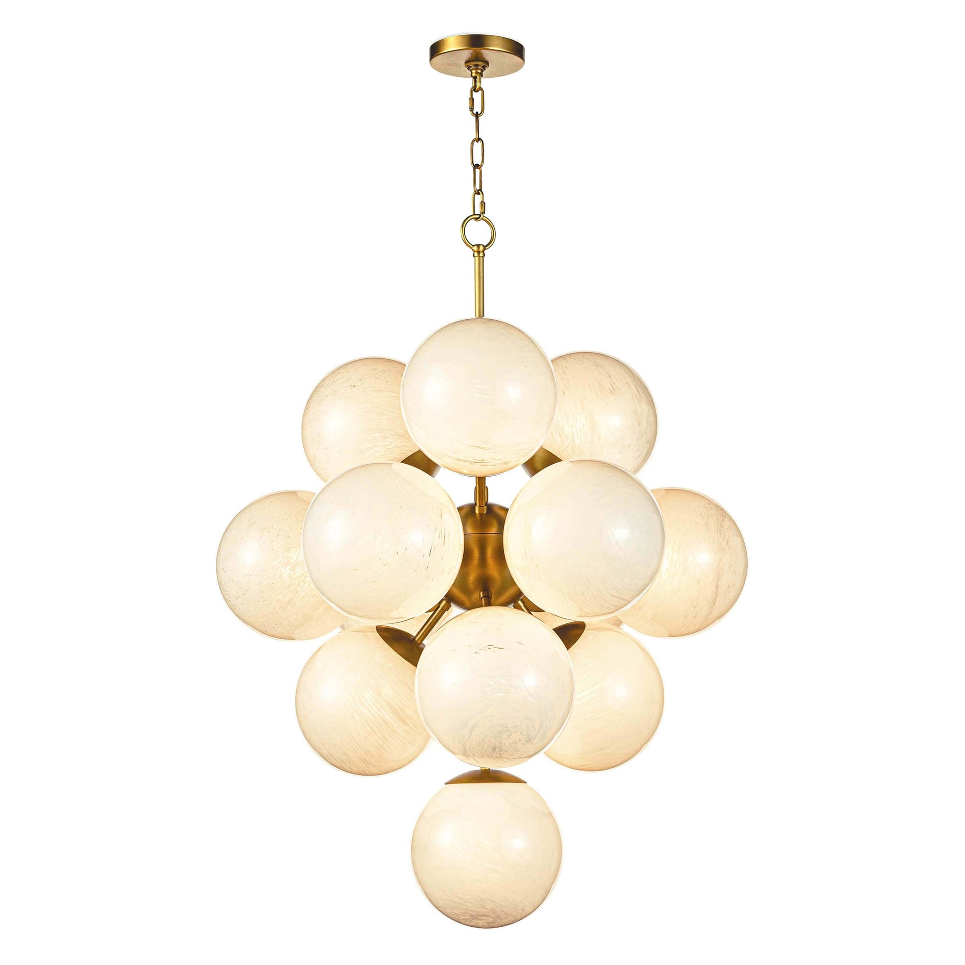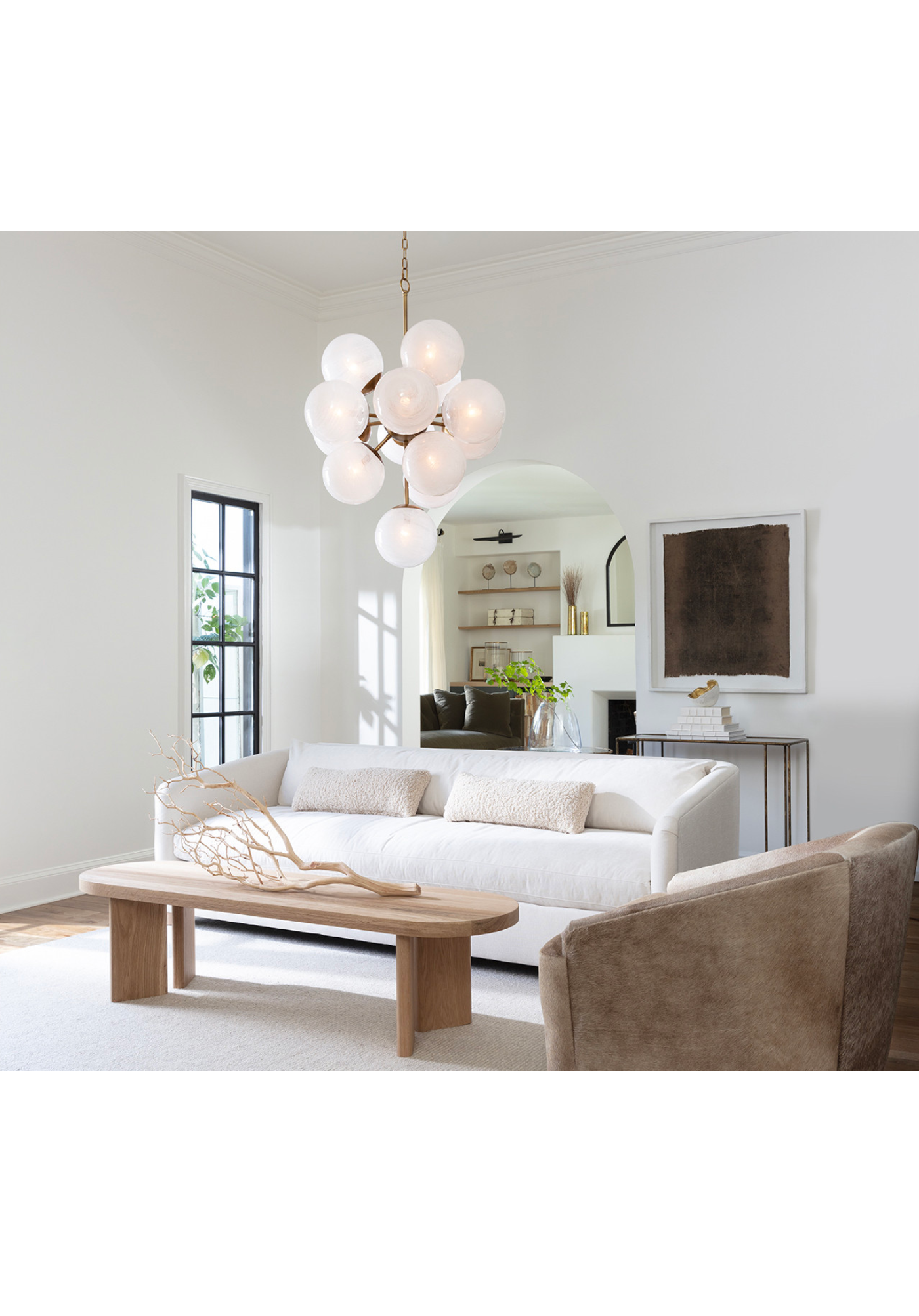 The La Dame chandelier seamlessly blends Mid-Century Modern with French elegance. Its swirling glass globes emit a captivating glow, creating an alluring atmosphere. Measuring 3 feet in length, this remarkable fixture is perfect for making a statement in a foyer or dining room with lofty ceilings.