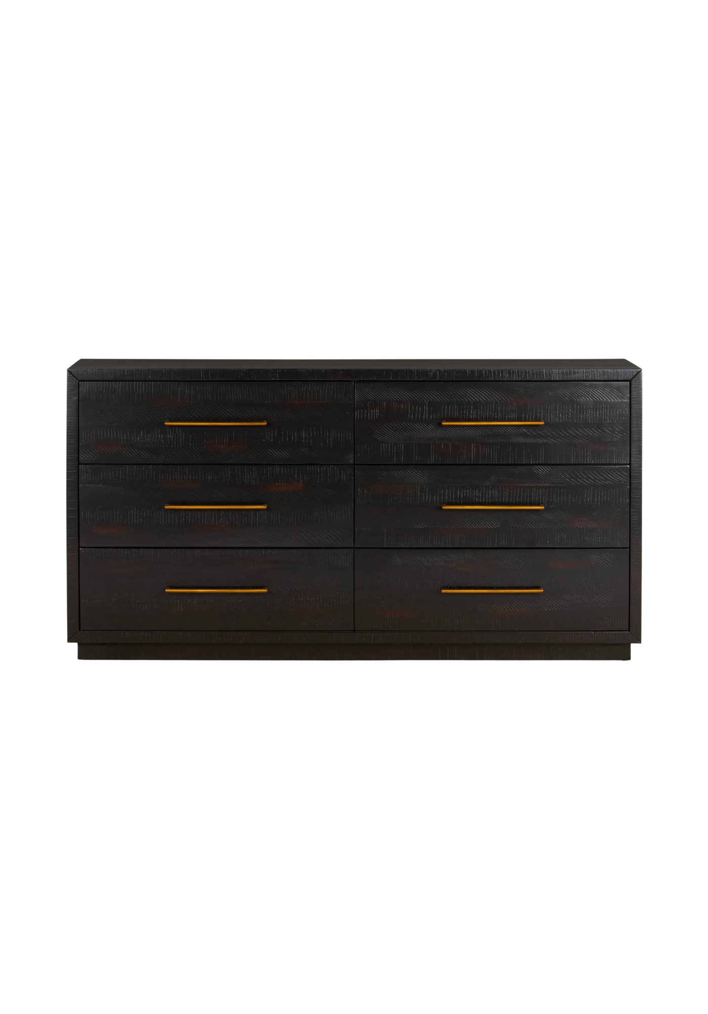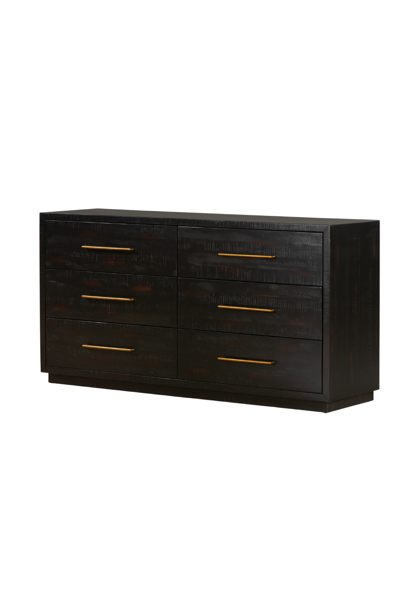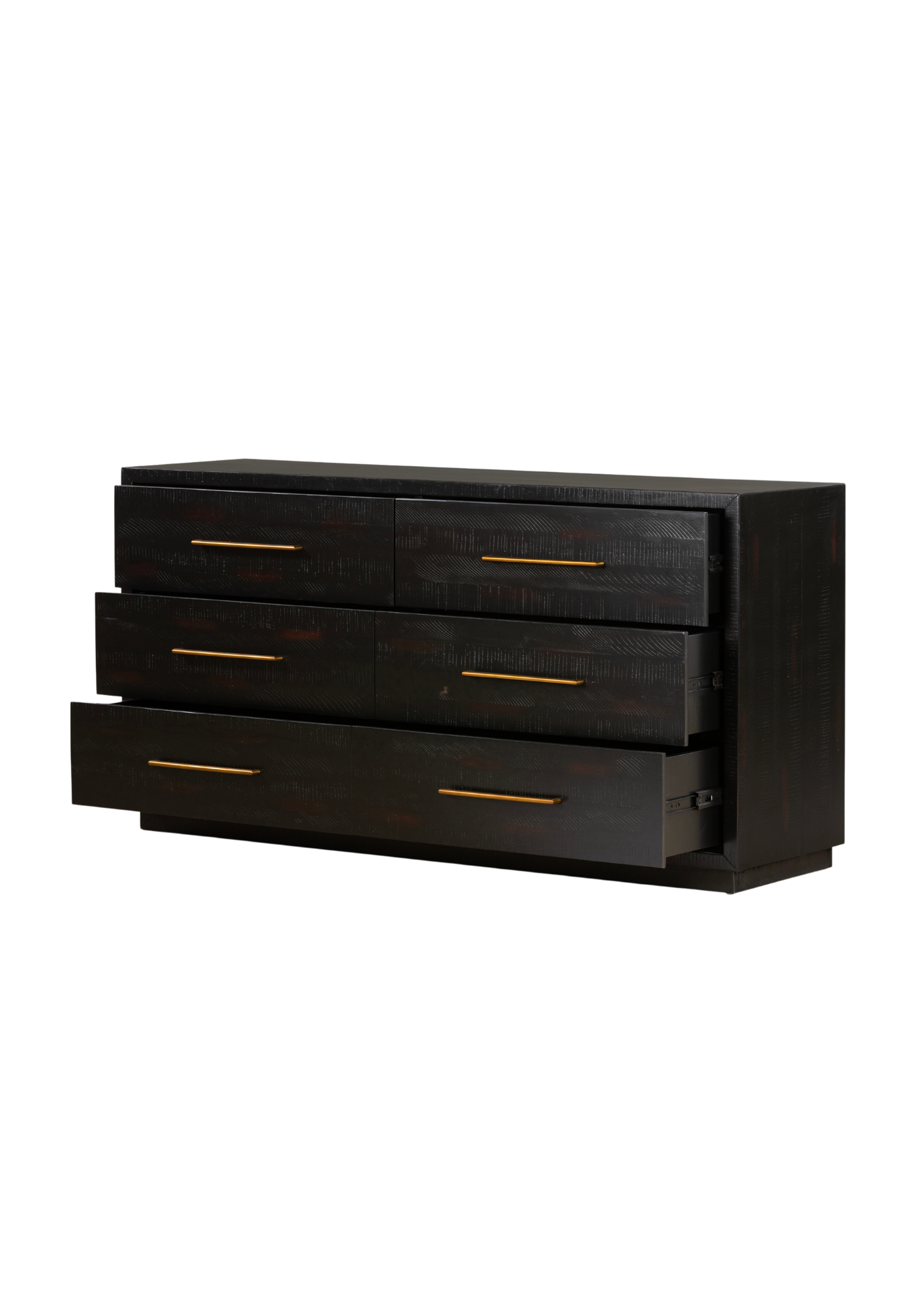 This stylish piece is an eye-catcher with its modern edge and burnished black finish. Solid acacia construction ensures durability and long-lasting beauty, while brass-finished hardware gives a luxurious touch. Enjoy six spacious drawers for easy organizing and storage.