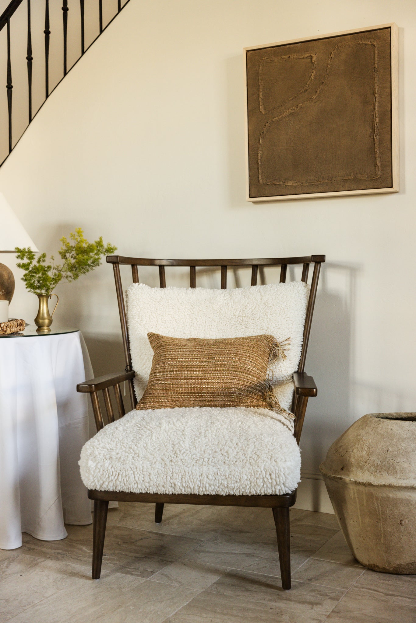 The Amelie Chair combines a traditional spindle frame with thick, soft cushions for ultimate relaxation. Choose between the plush faux Mongolian shearling or the versatile cream and grey striped flax-linen blend to bring comfort and style into any room.