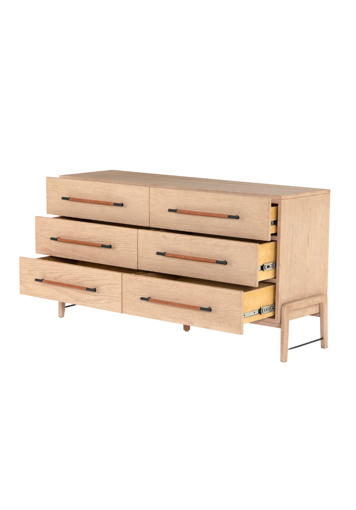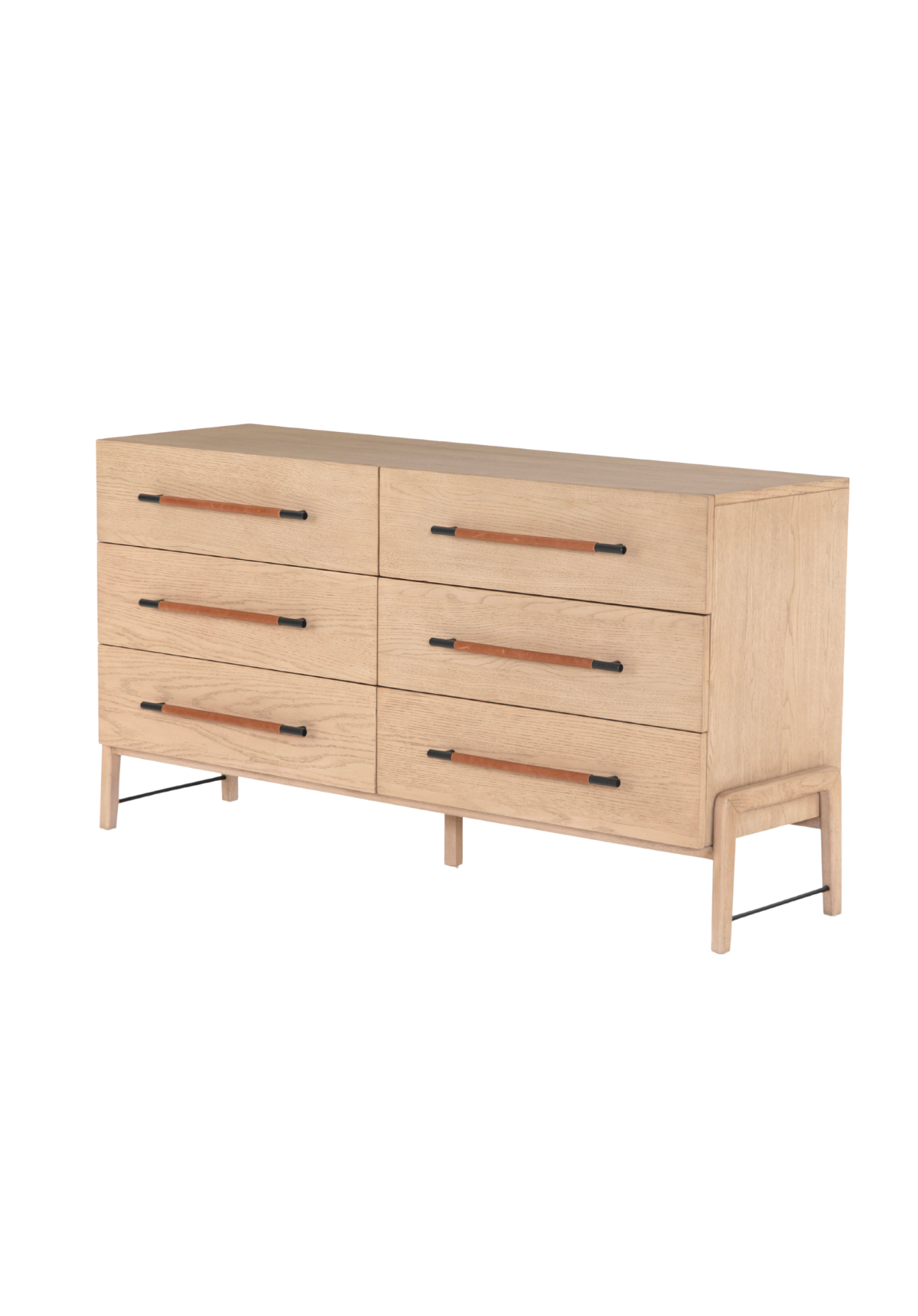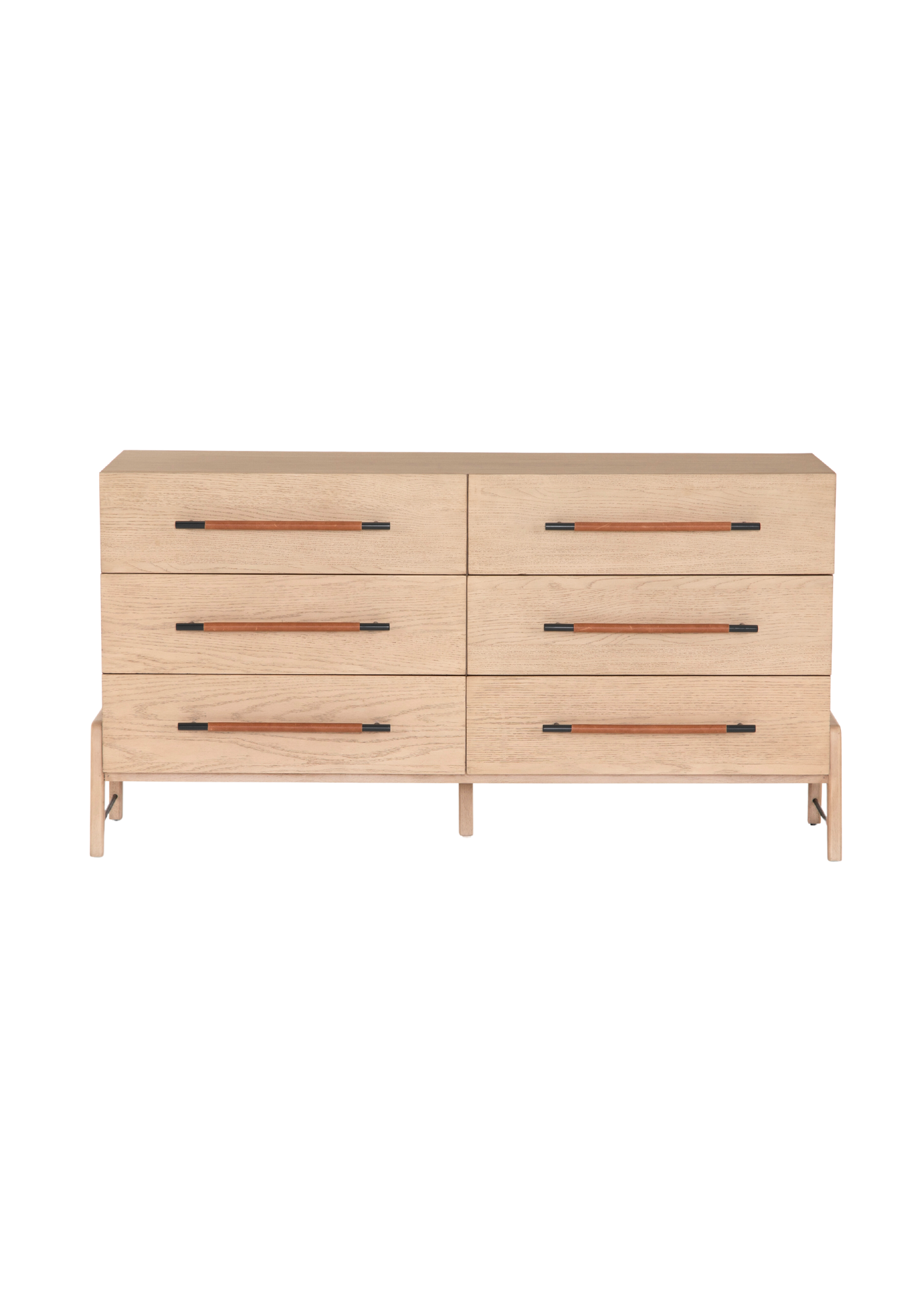 Introducing the Andreas Dresser, a timeless piece crafted with light-finished oak and topped with tan top-grain leather handles. Effortlessly stylish and highly functional, this dresser offers six spacious drawers with iron hardware for a luxurious touch. Bring a modern feel to any room with this must-have storage essential.