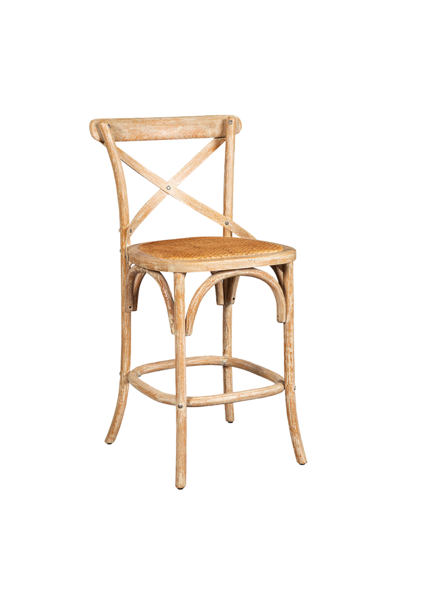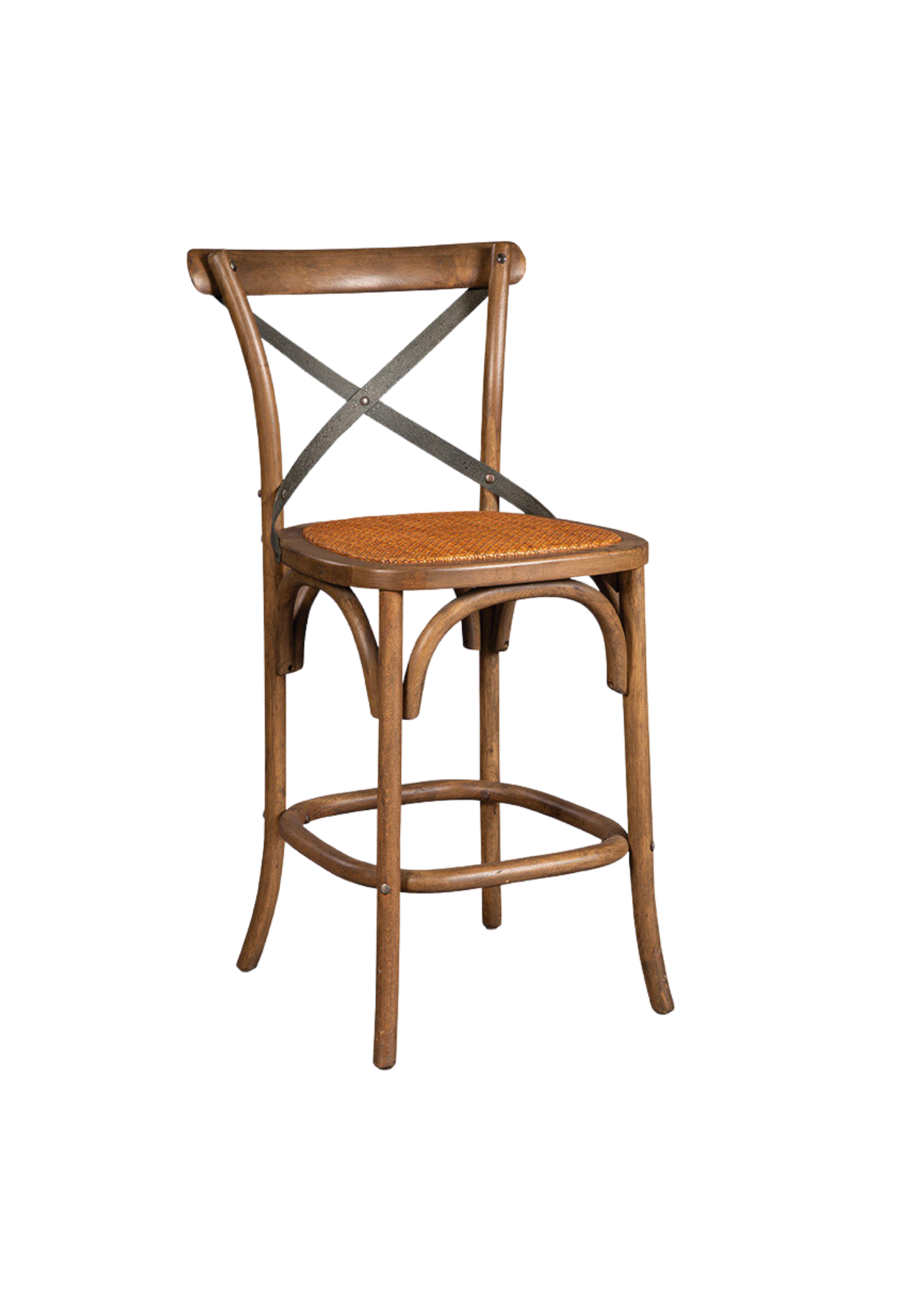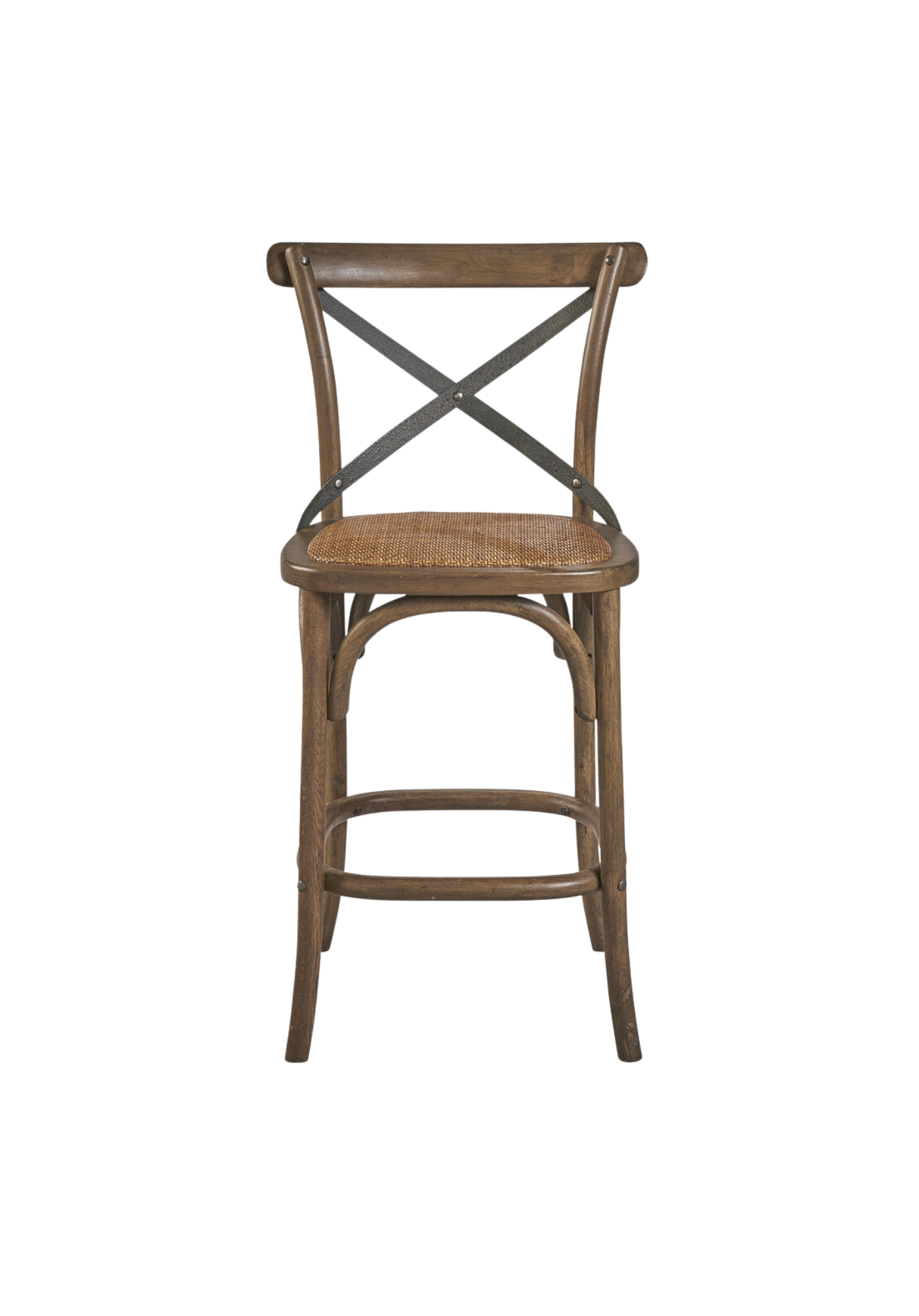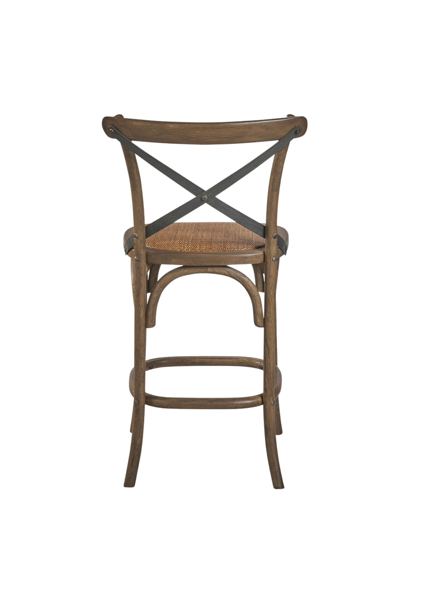 This solid oak counter stool is the perfect accompaniment to your kitchen island, offering an inviting and comfortable seat for your family when they come home from school for snacks or homework. The steam-bent framework offers sturdy, reliable support, while the banana-leaf woven seat is reinforced with a wooden base. Gently curved metal cross bracing adds a stylish touch and additional strength.