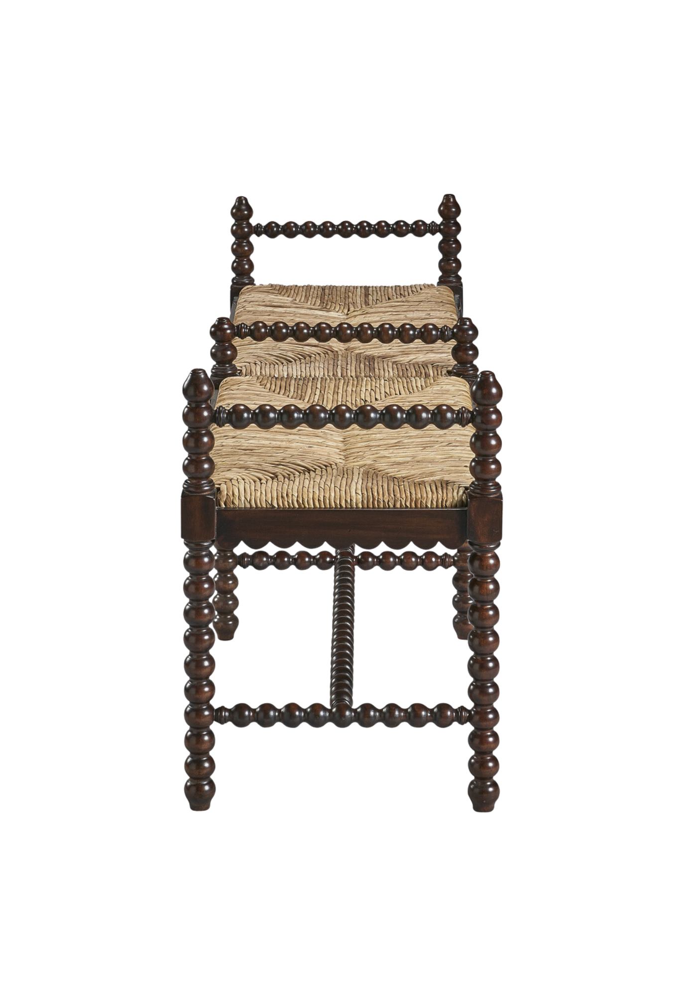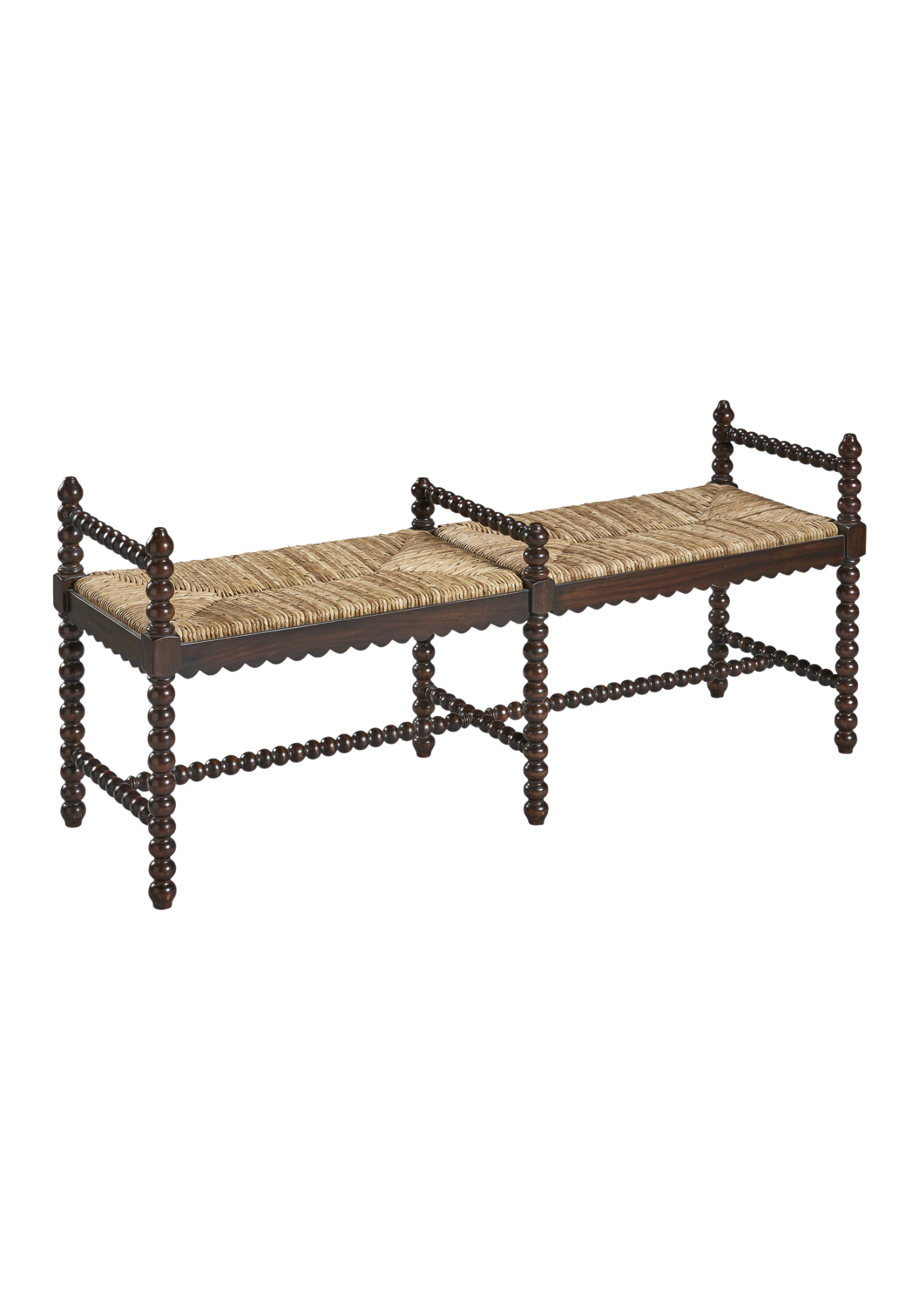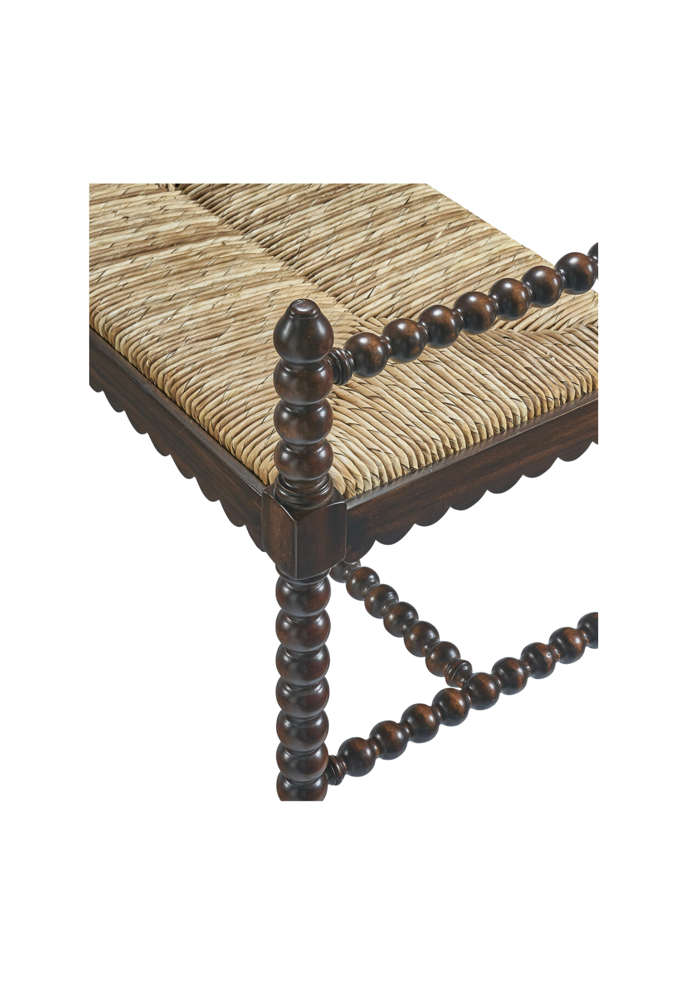 This exquisite bench boasts bobbin turnings on arms, legs and stretchers, along with a deluxe scalloped apron. The comfortable seat is adorned in carefully hand-tied rush and has a convenient seat divider. This bench is an ideal choice for a dining room side, entryway, or at the foot of a bed.