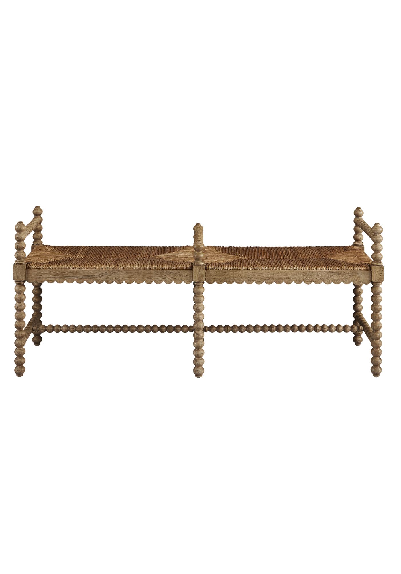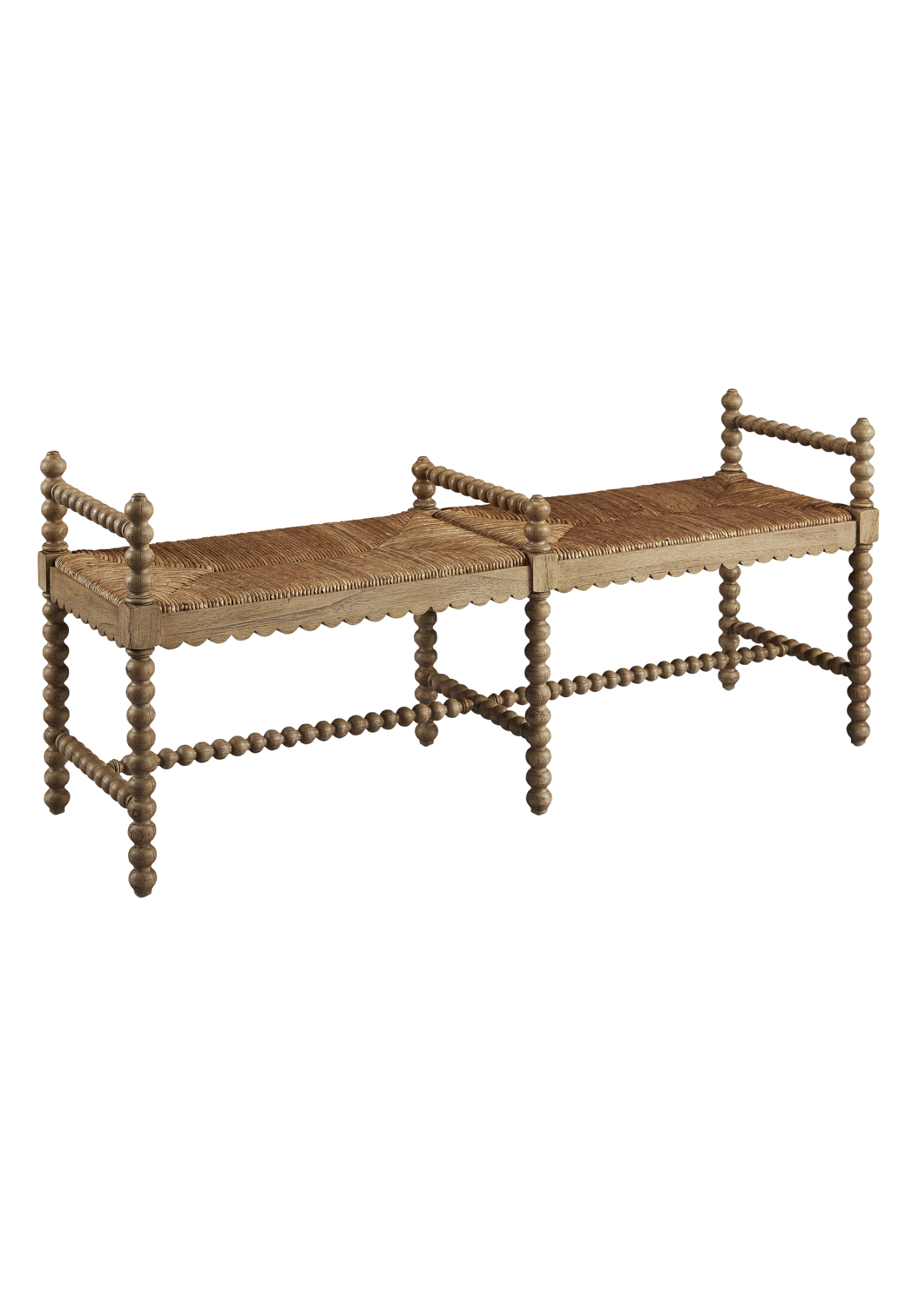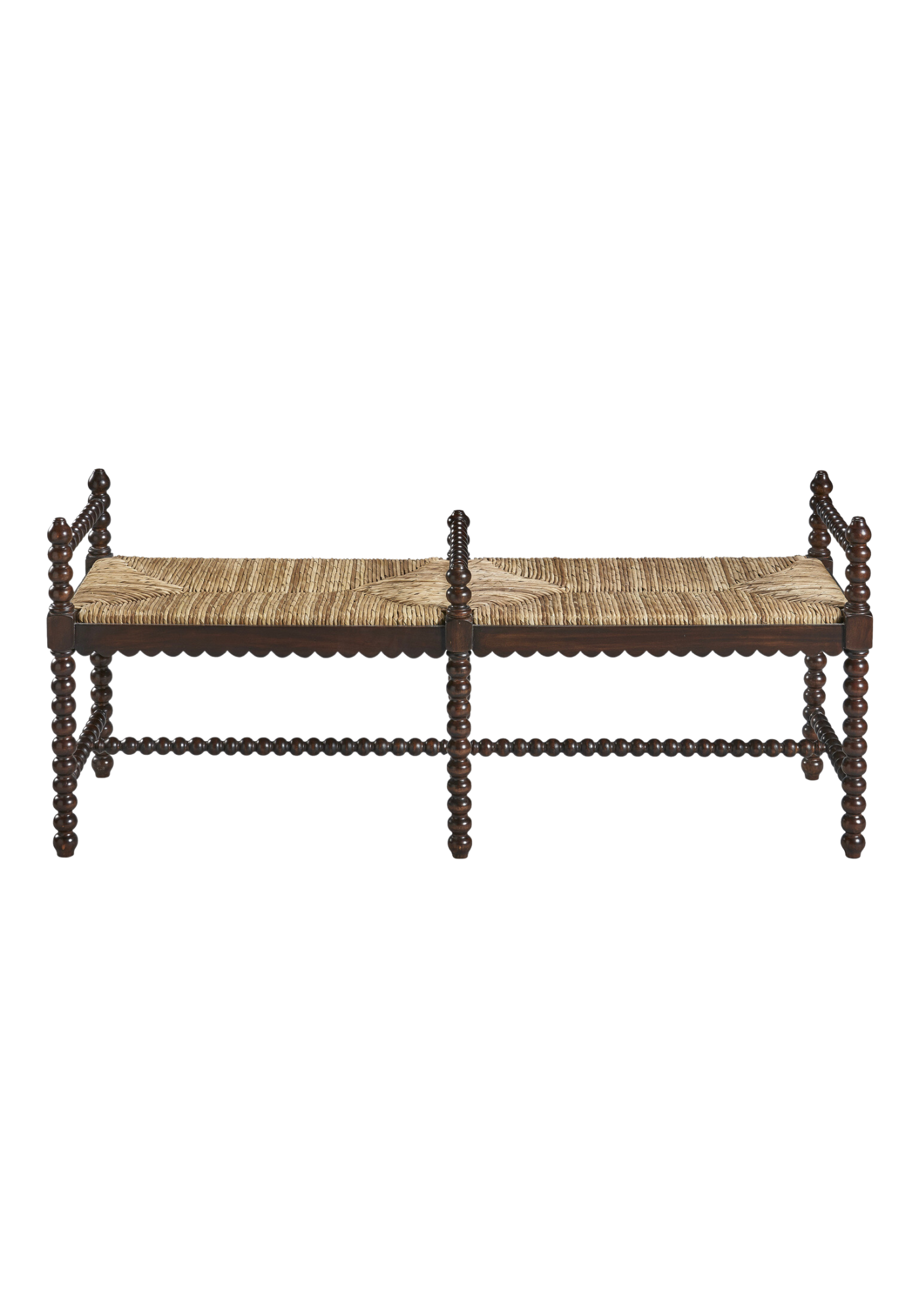 This exquisite bench boasts bobbin turnings on arms, legs and stretchers, along with a deluxe scalloped apron. The comfortable seat is adorned in carefully hand-tied rush and has a convenient seat divider. This bench is an ideal choice for a dining room side, entryway, or at the foot of a bed.