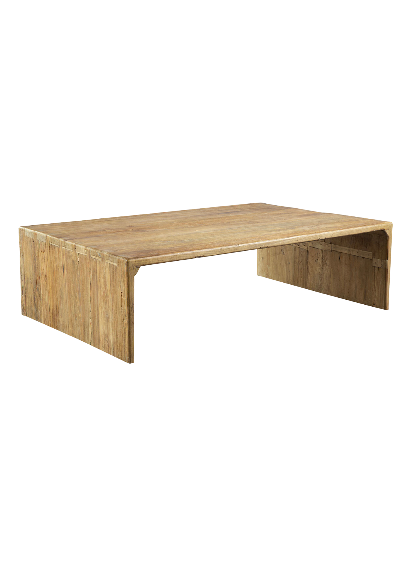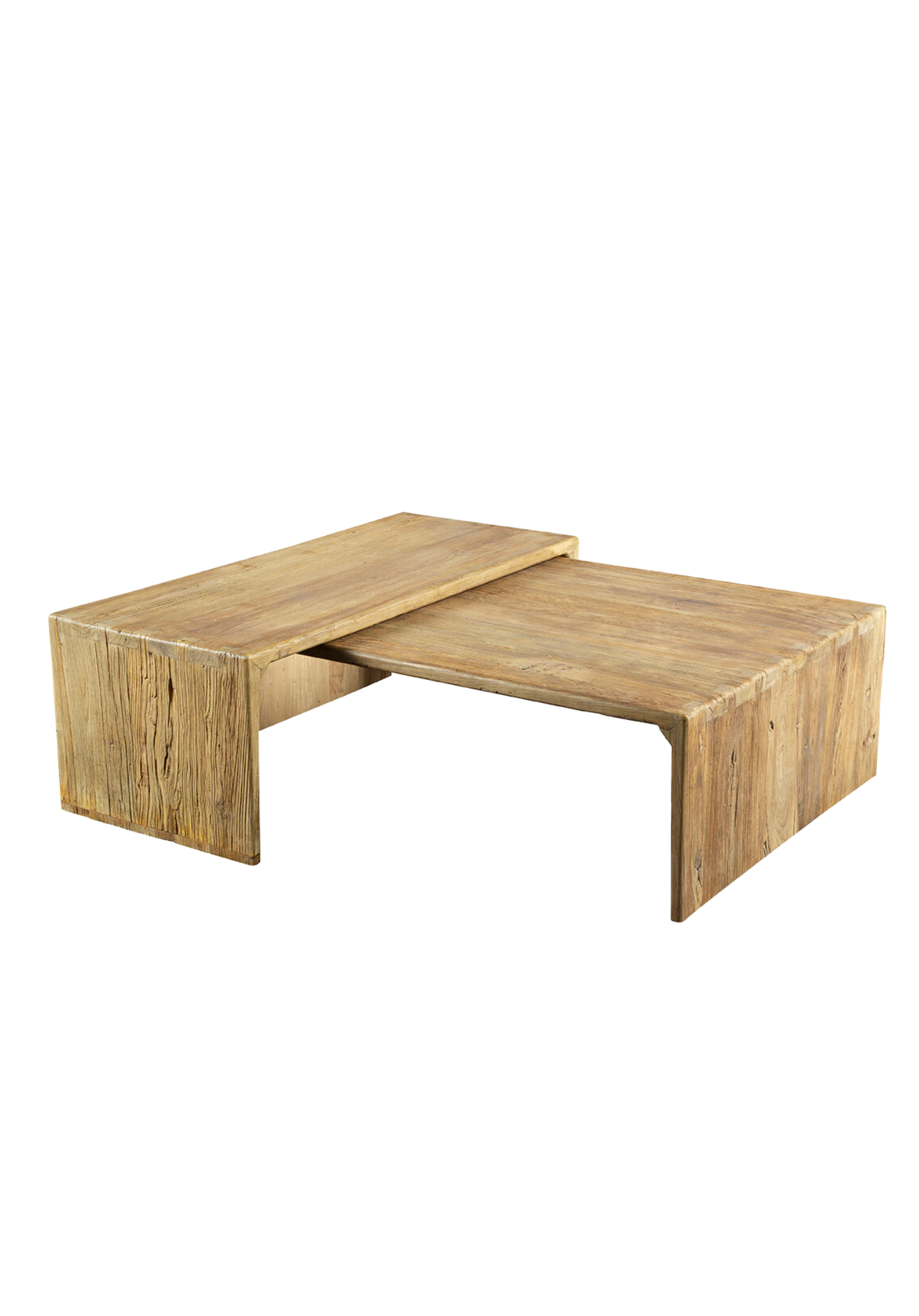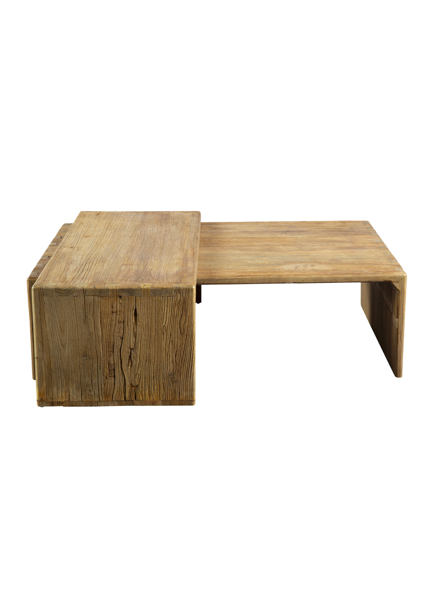 This illustrious solid elm table impresses with its grandly-scaled design and swoon-worthy dovetail joinery on the waterfall ends. Nestle the smaller table for a regal look when friends or family come together on a sectional sofa. Drinks are now within arm's reach and spills can be wiped clean easily thanks to the clear coat finish.