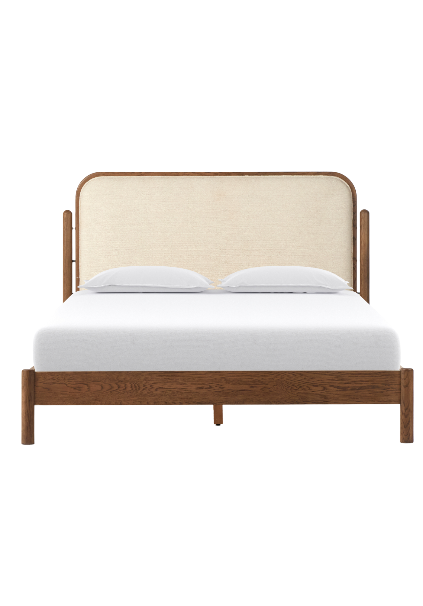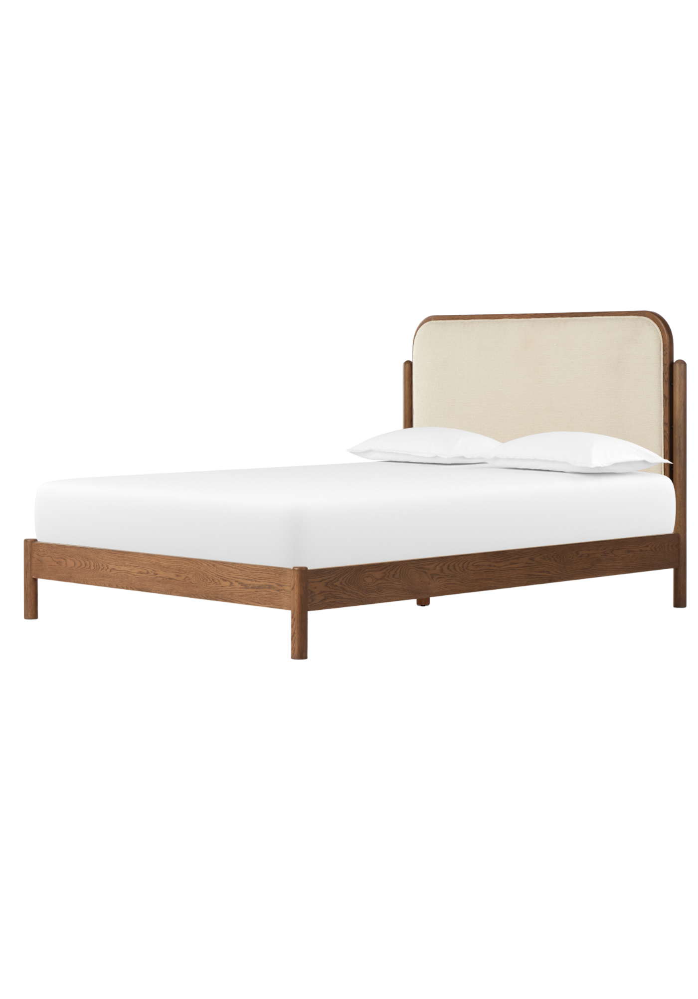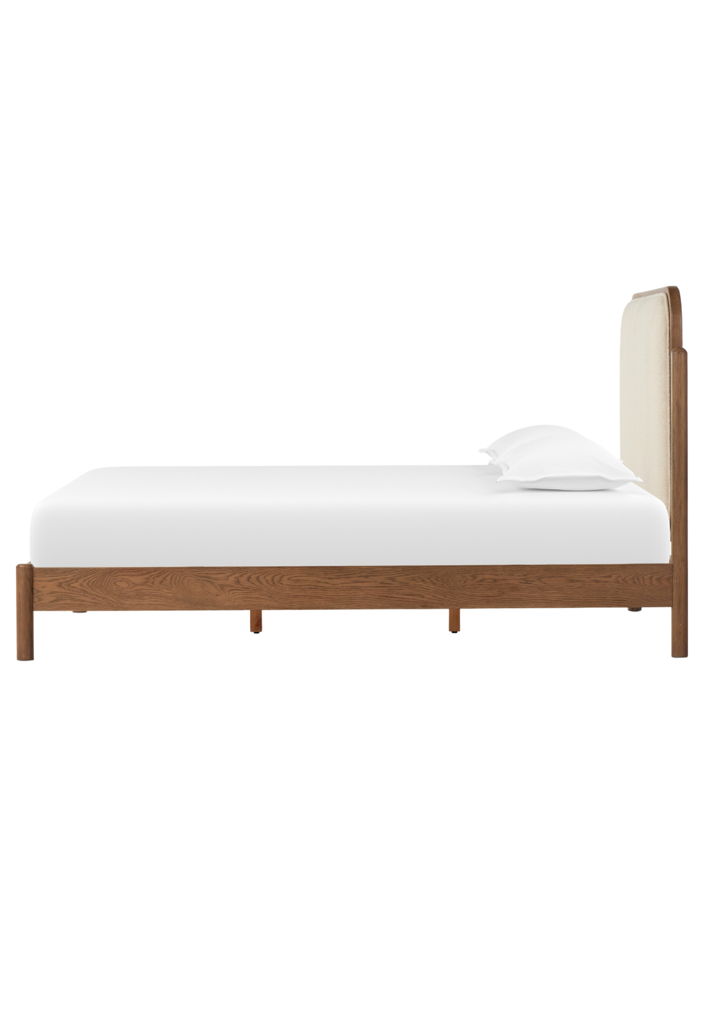 Smoked oak frames a headboard upholstered with ivory high-performance fabric, bringing texture and contrast to the bedroom. Performance fabrics are specially created to withstand spills, stains, high traffic and wear, ensuring long-term comfort and unmatched durability.