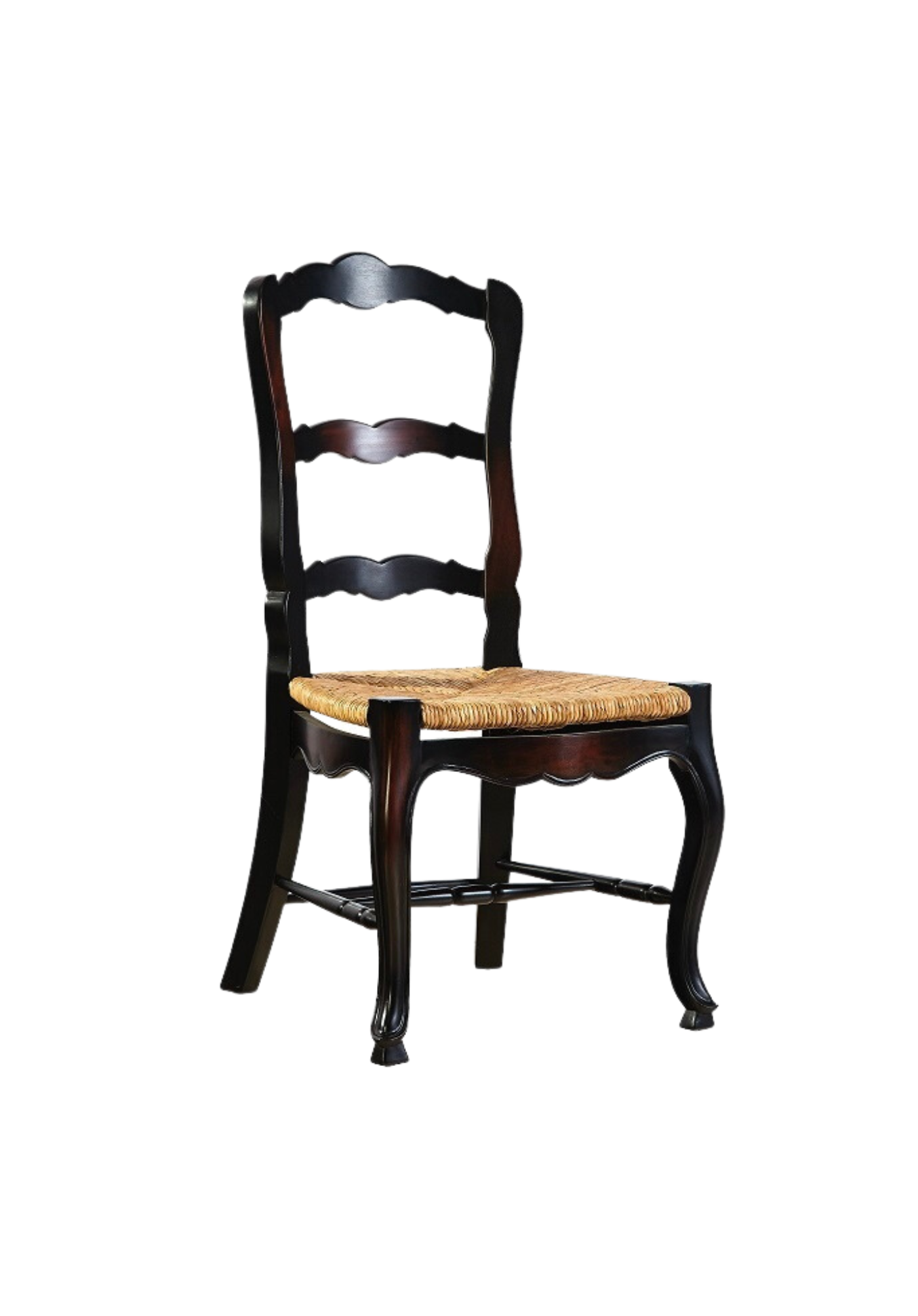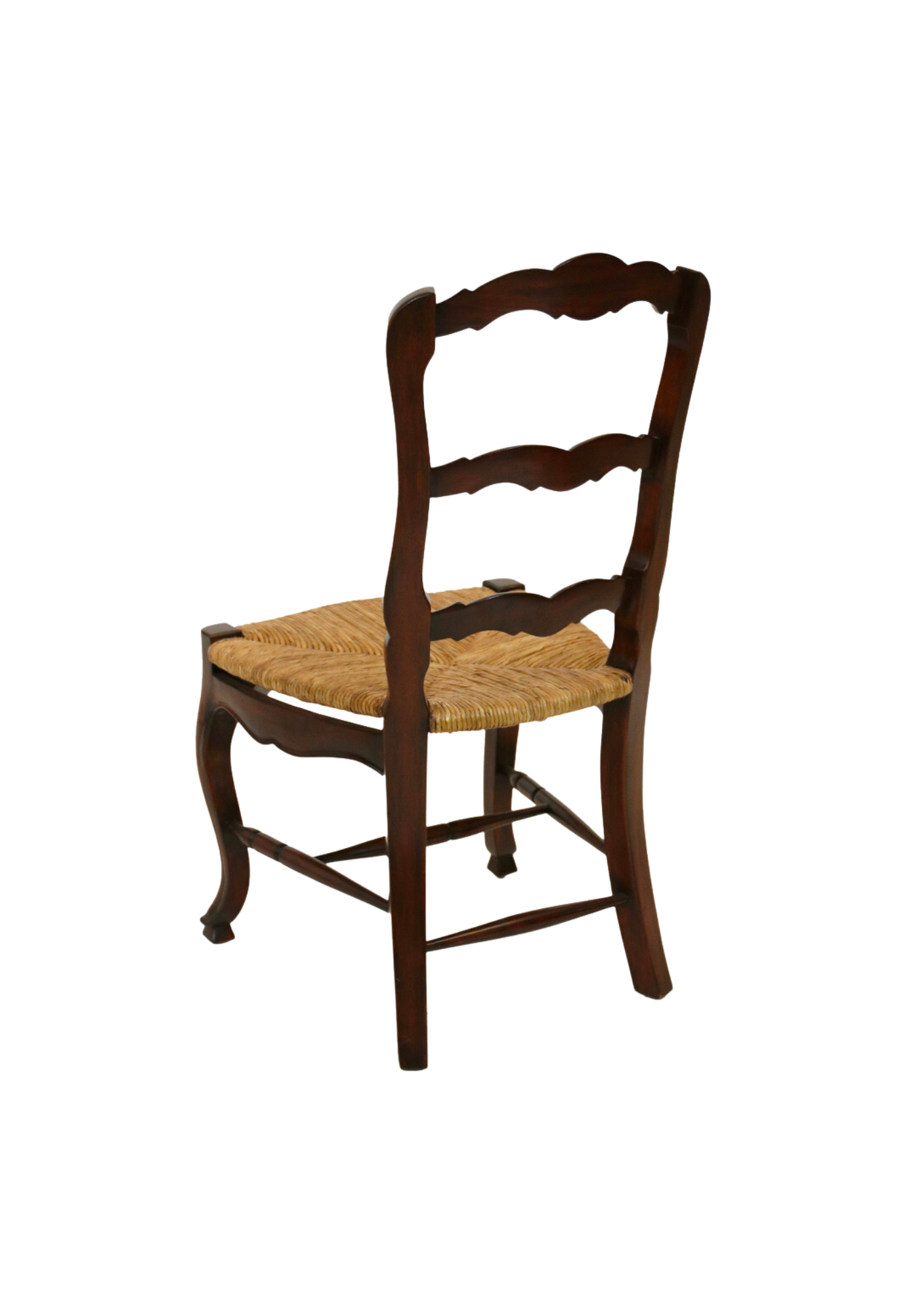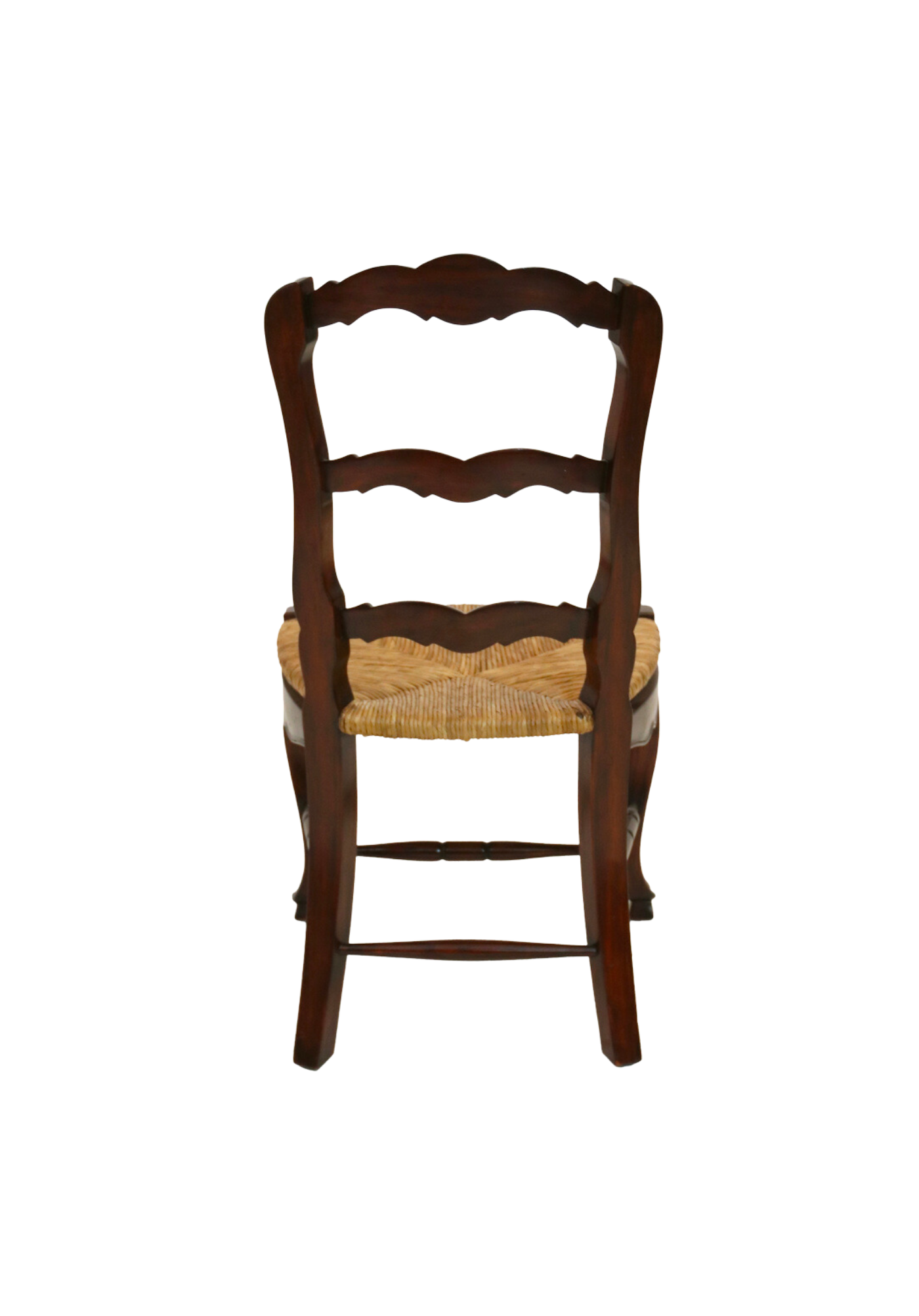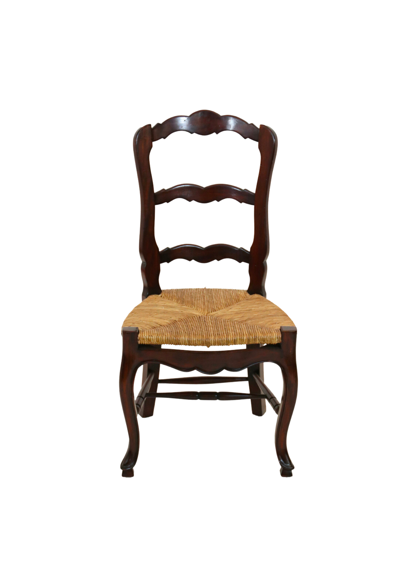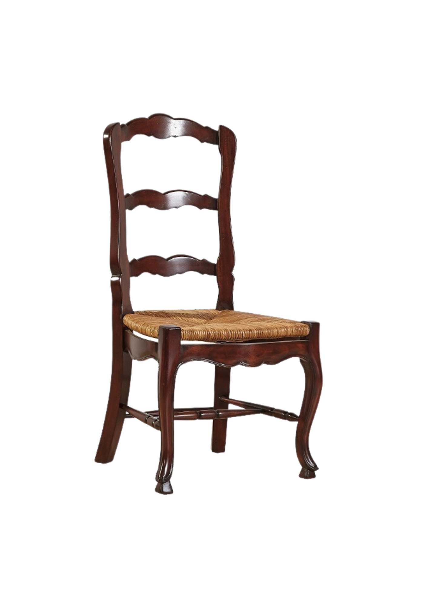 This beautiful country French ladderback chair is made of solid plantation grown mahogany. Featuring a shaped back and seat rails with cabriole leg terminating in a block foot, this typical provincial chair features hand shaping and hand carved beading.