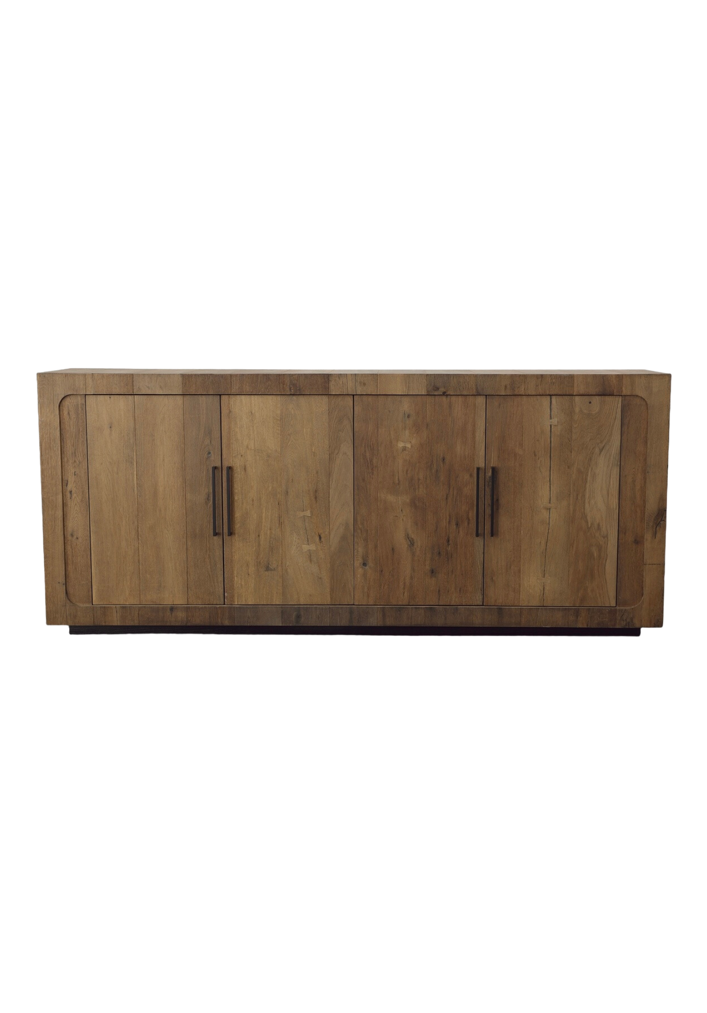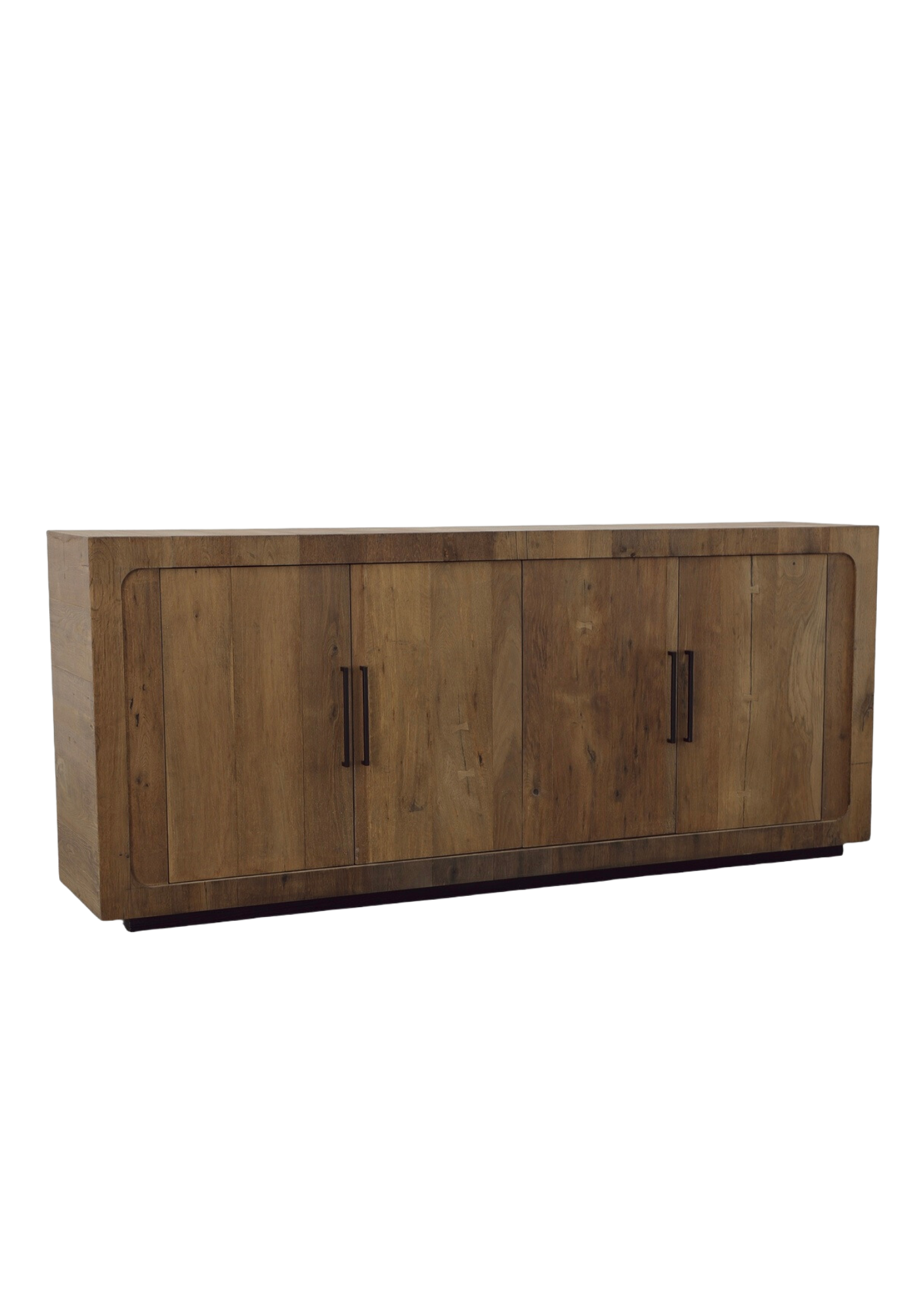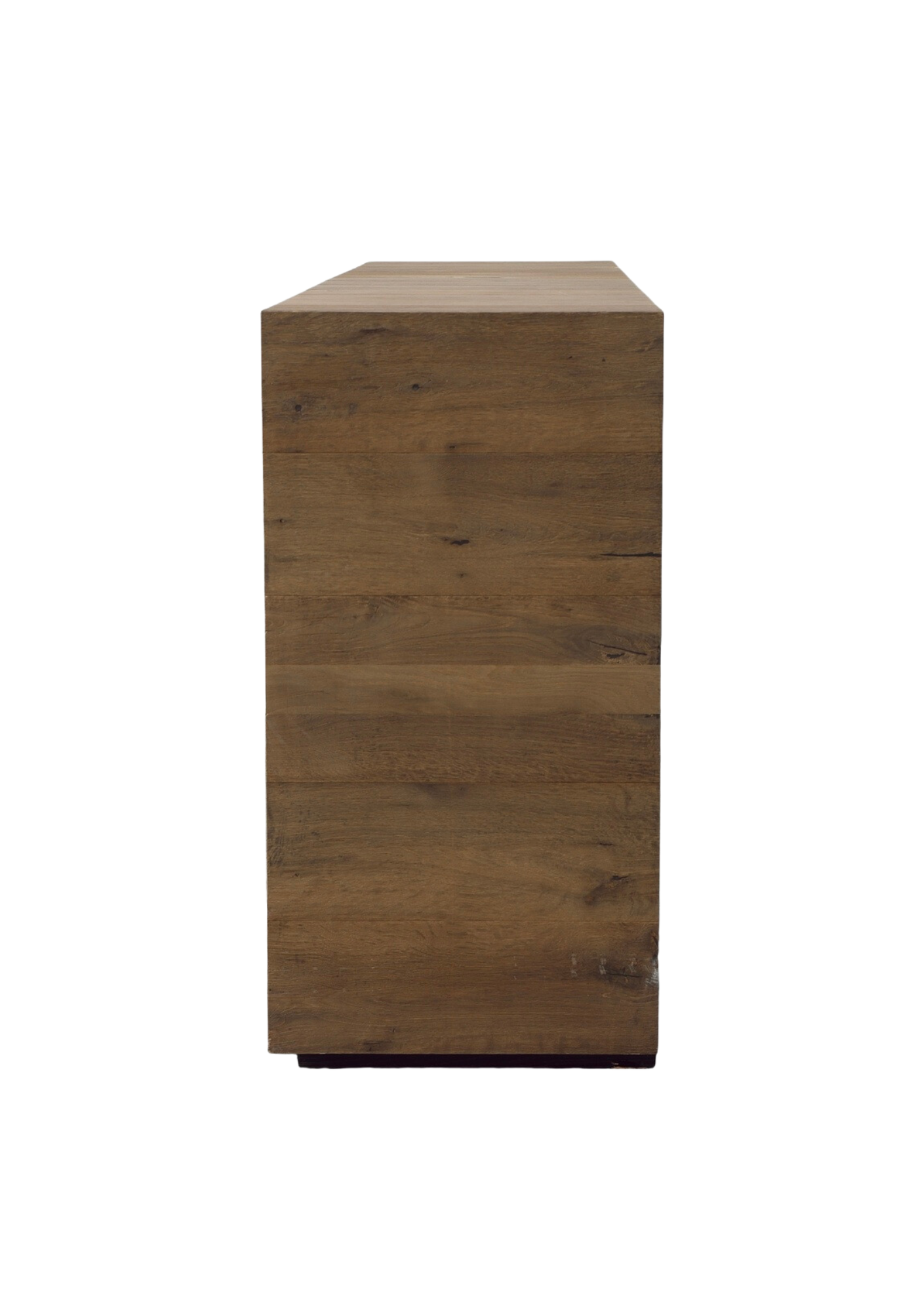 The Crue Sideboard boasts a distinct construction of wide oak planks and rounded corners that soften its geometric angles, making it a timeless and exquisite addition to any space. Its plinth base enhances its stability and strength, while sleek black bar pulls and a warm brown finish contribute to its modern appeal.