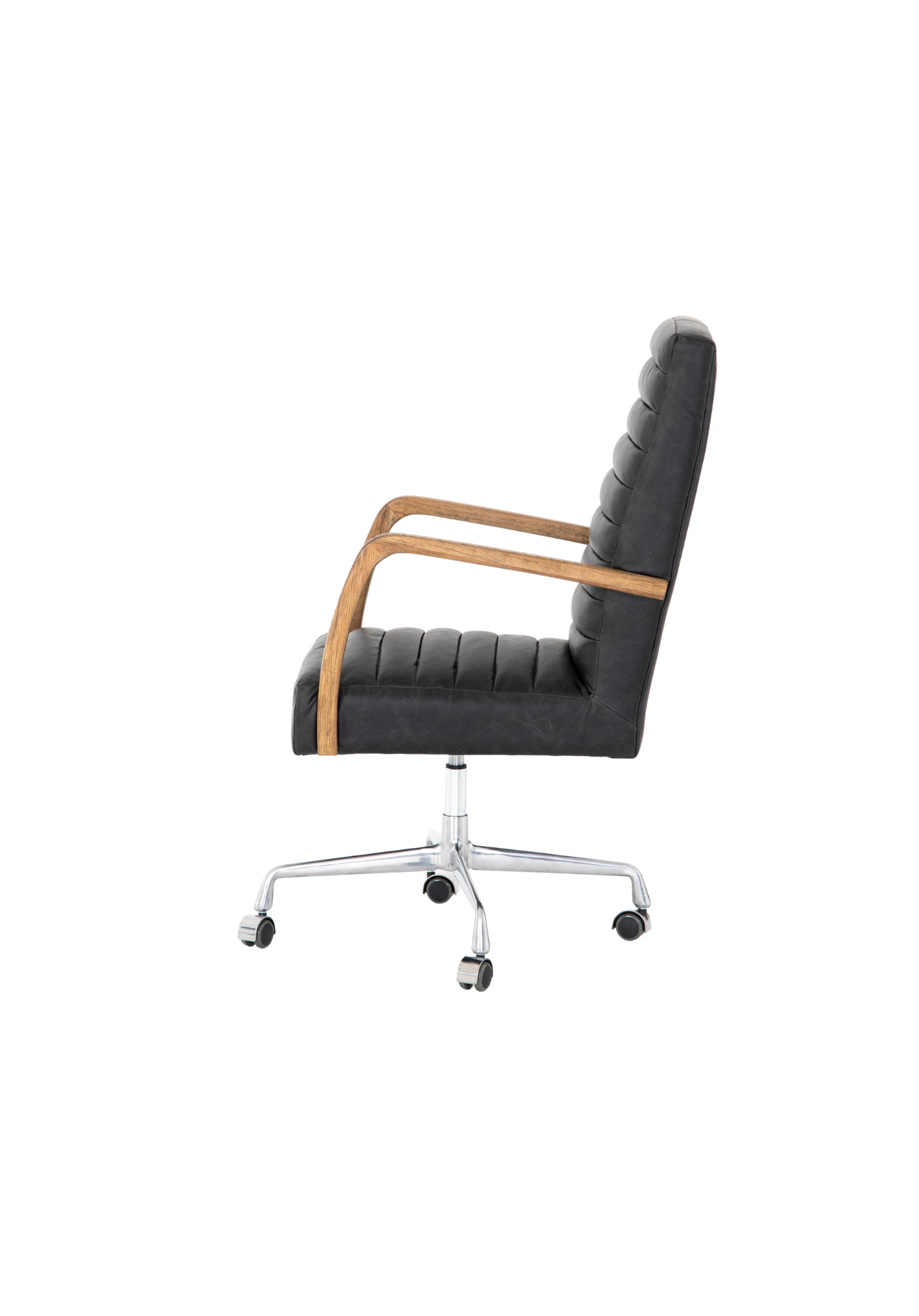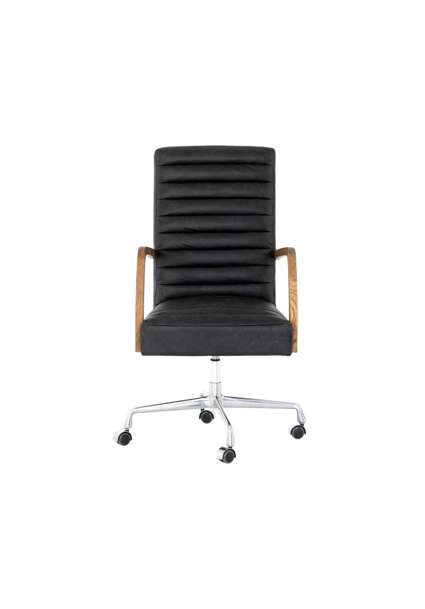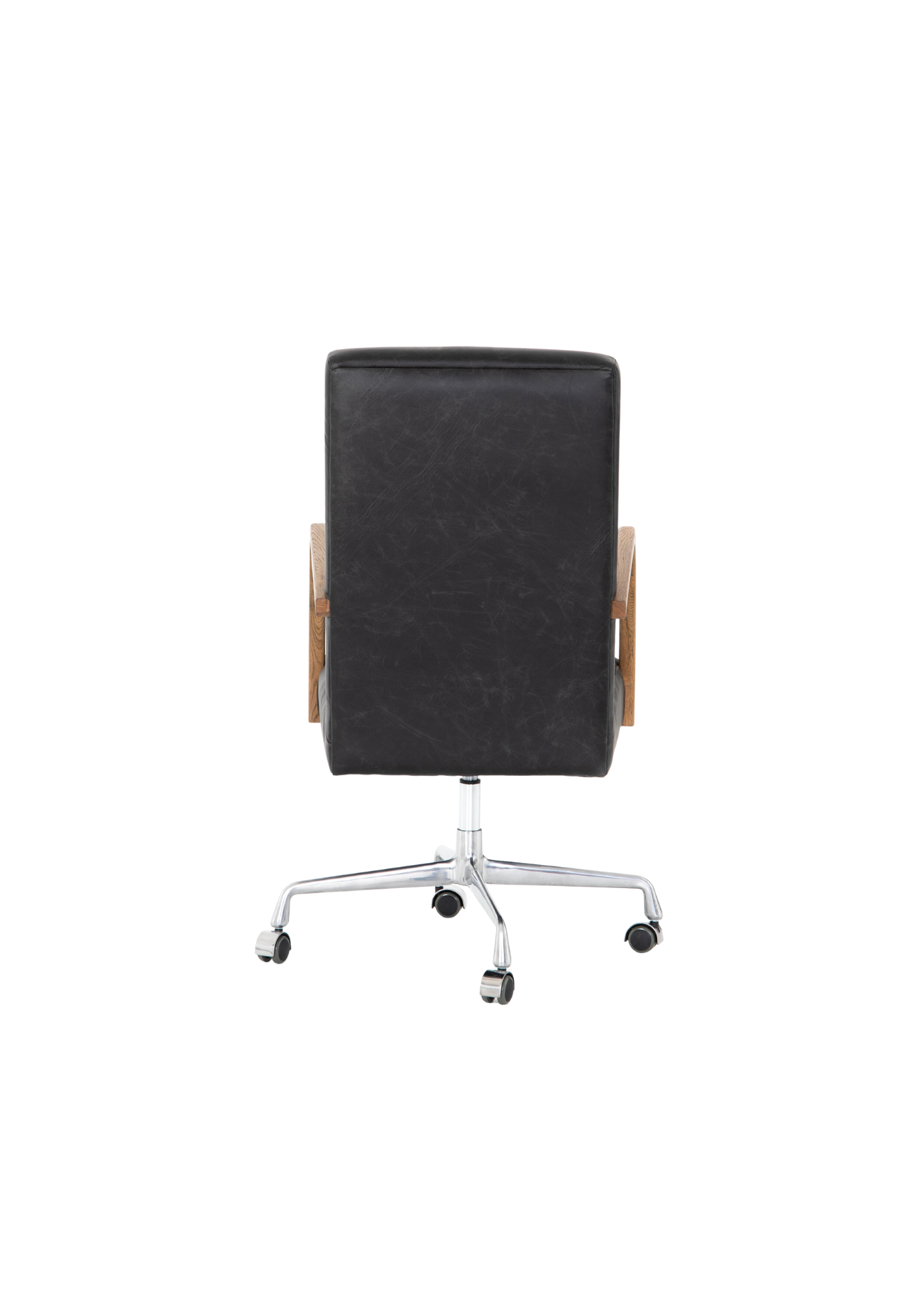The Delaney Desk Chair exudes style and sophistication. Crafted with smoky black top-grain leather and toasted oak arms, this chair is elegantly designed to elevate any workspace. Enjoy maximum comfort with its channeled seat and supportive back, and make changes with ease thanks to its metal casters.