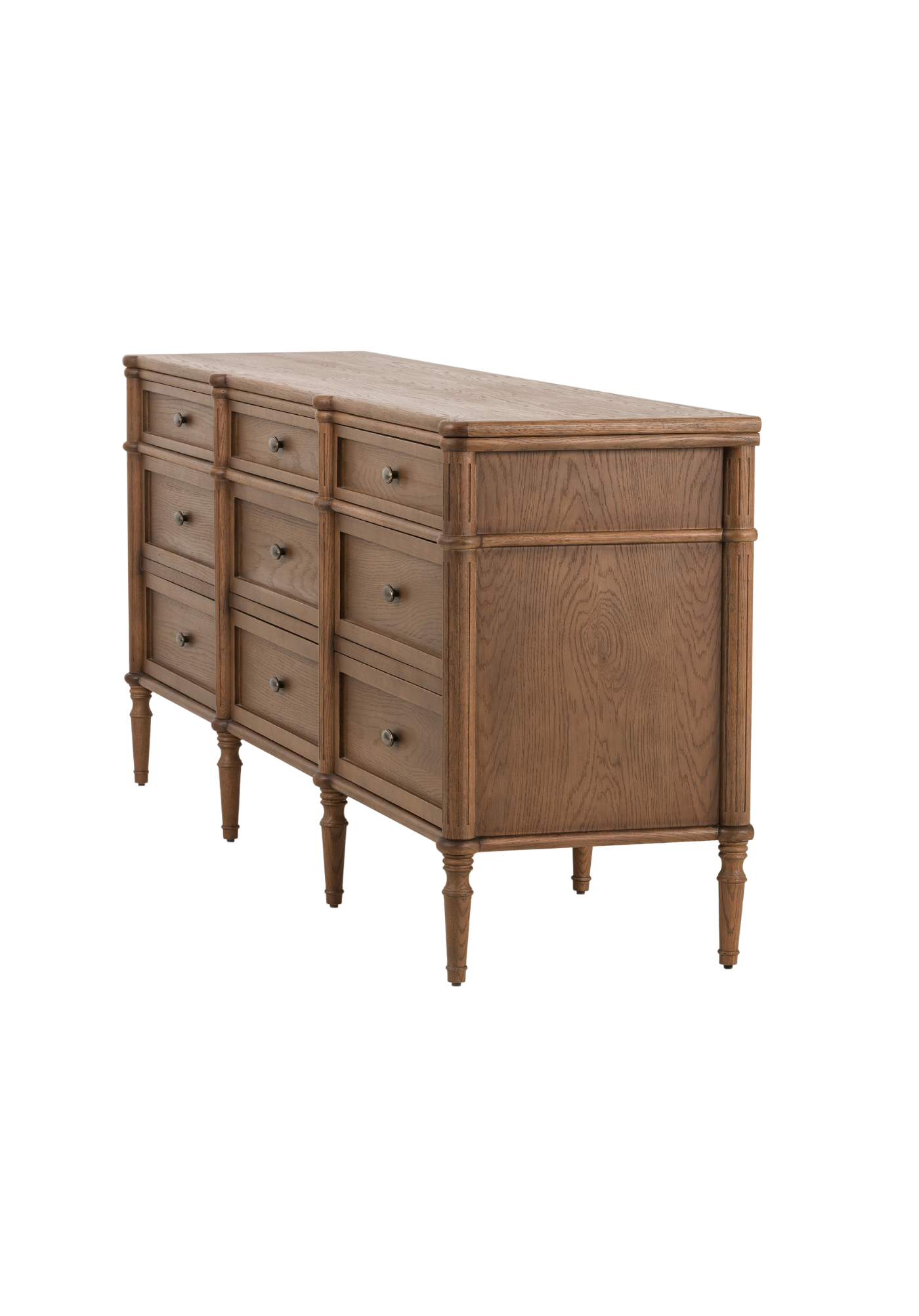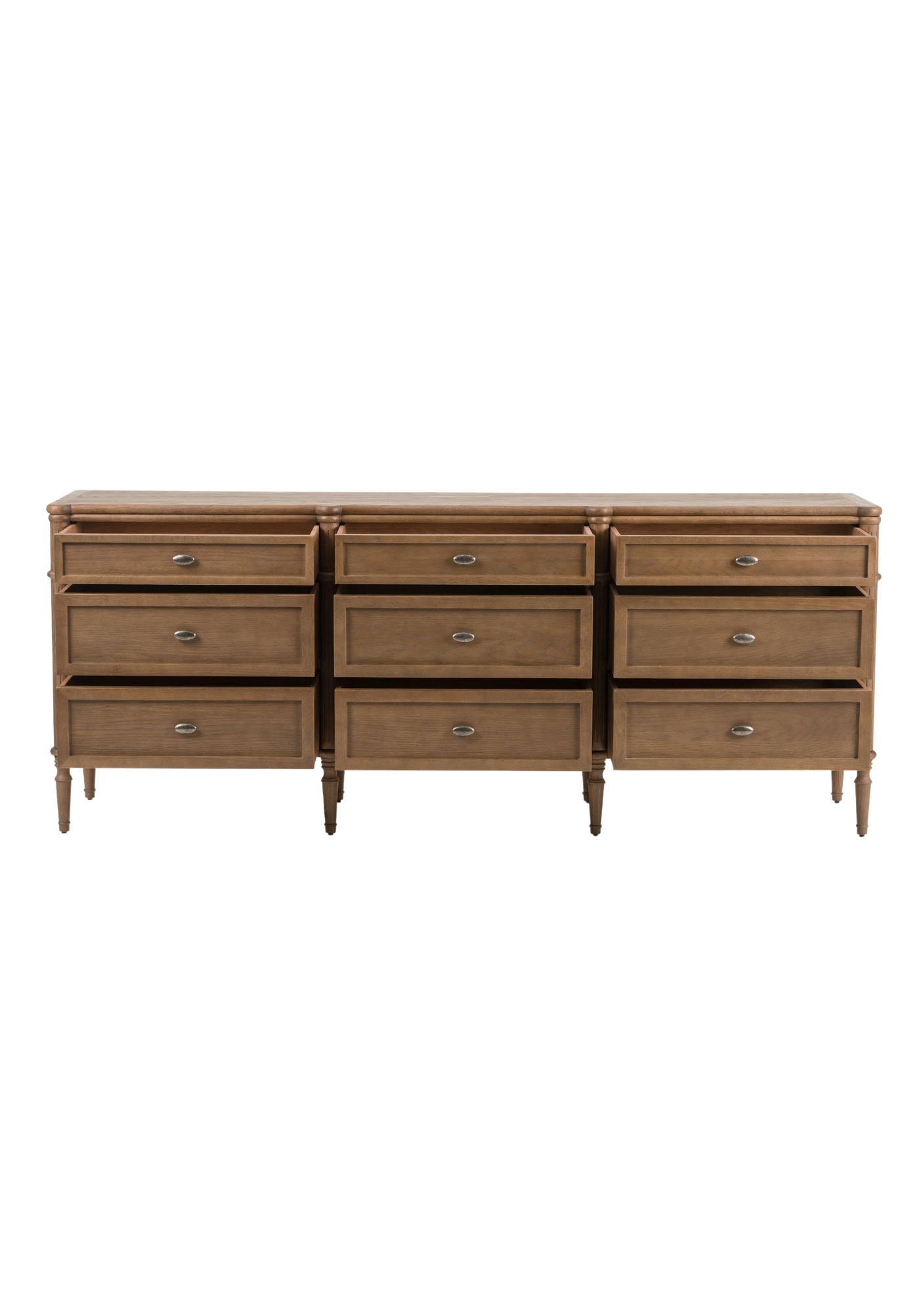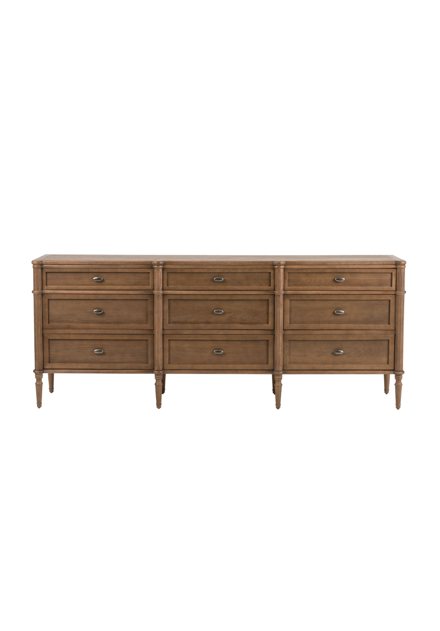 Introducing the Delilah Dresser, a toast oak masterpiece that exudes vintage-inspired allure. With its nine spacious drawers and intricate details, it blends functionality and style seamlessly. Create a timeless sanctuary in any room, where Delilah Dresser brings warmth and old-world elegance to life.