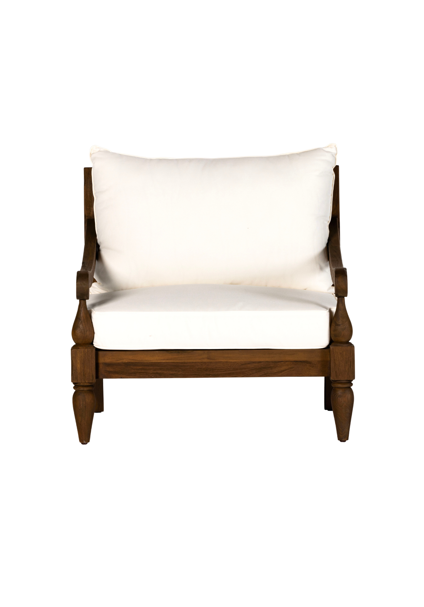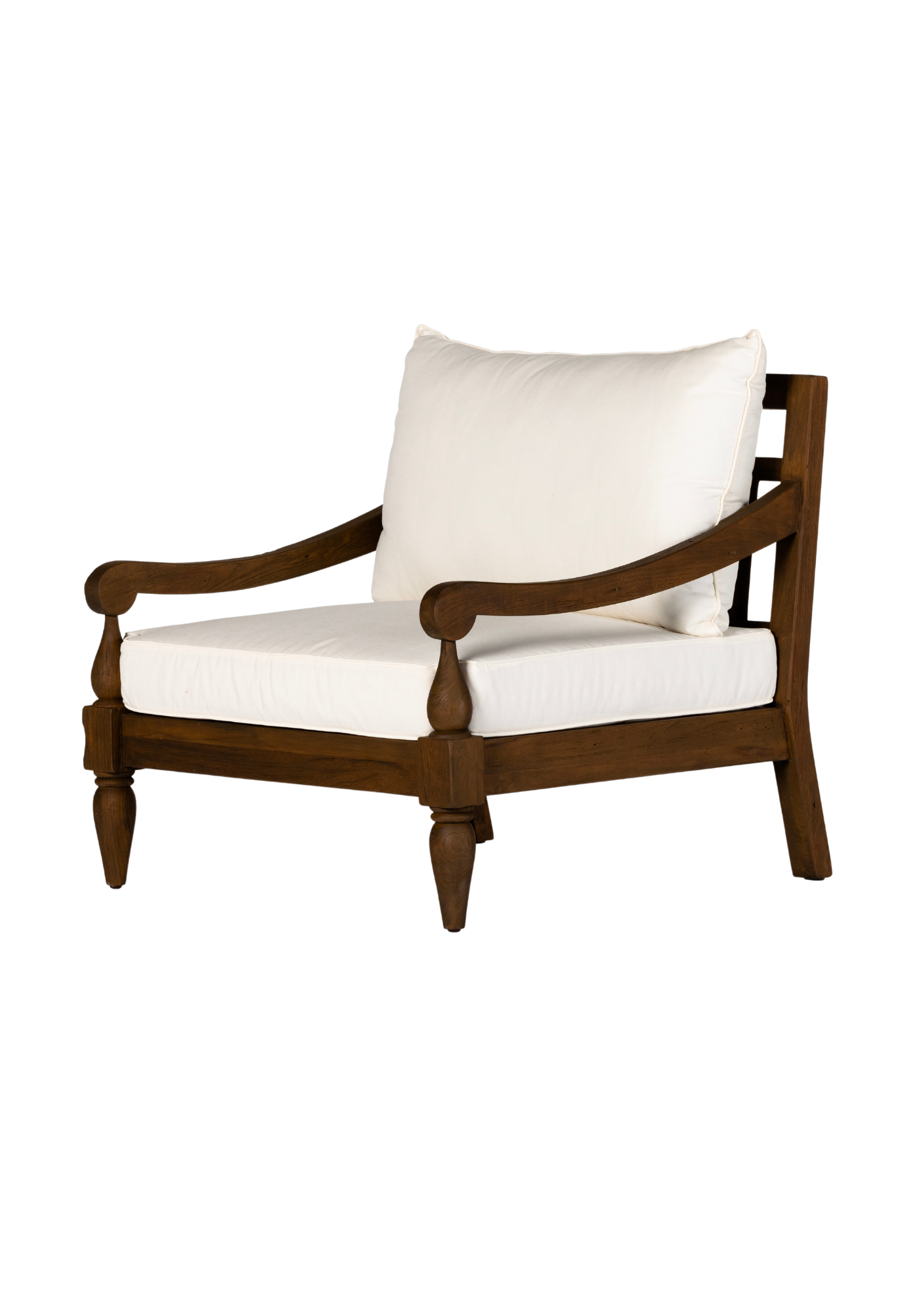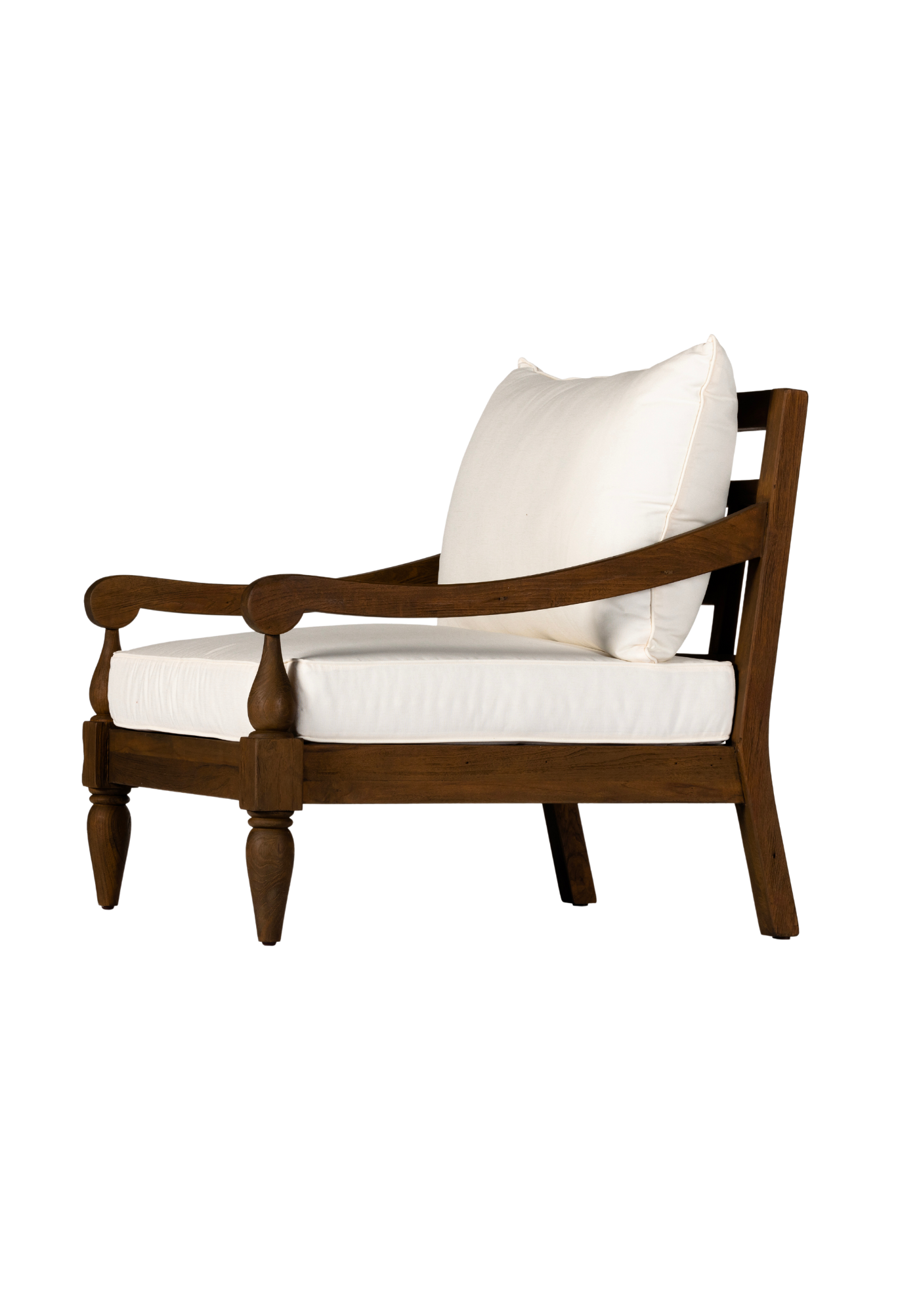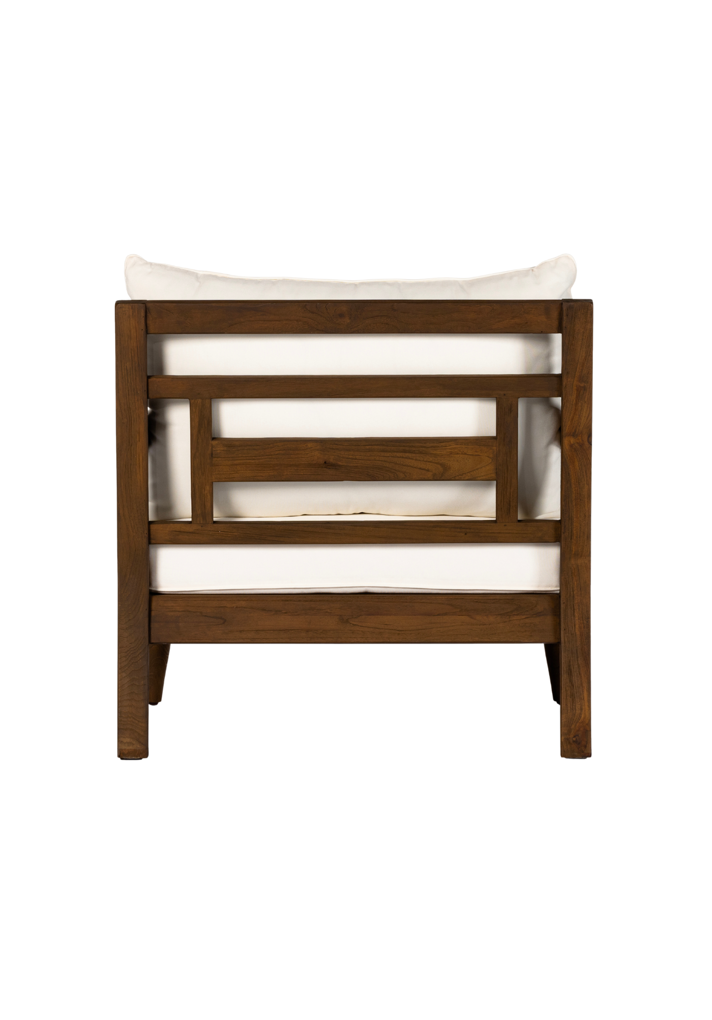The Dimitra Outdoor Chair is the perfect addition to any outdoor setting. Crafted from extra-durable reclaimed FSC®-certified teak, this modern interpretation of a vintage chair is finished in a rich deep brown. With welt-style cushions on the seat and back, you'll love sinking into this one-of-a-kind piece, with its unique character guaranteed by the natural knots, cracks, hole and patches. Enjoy this comfy chair all season long with cover or store during inclement weather.
