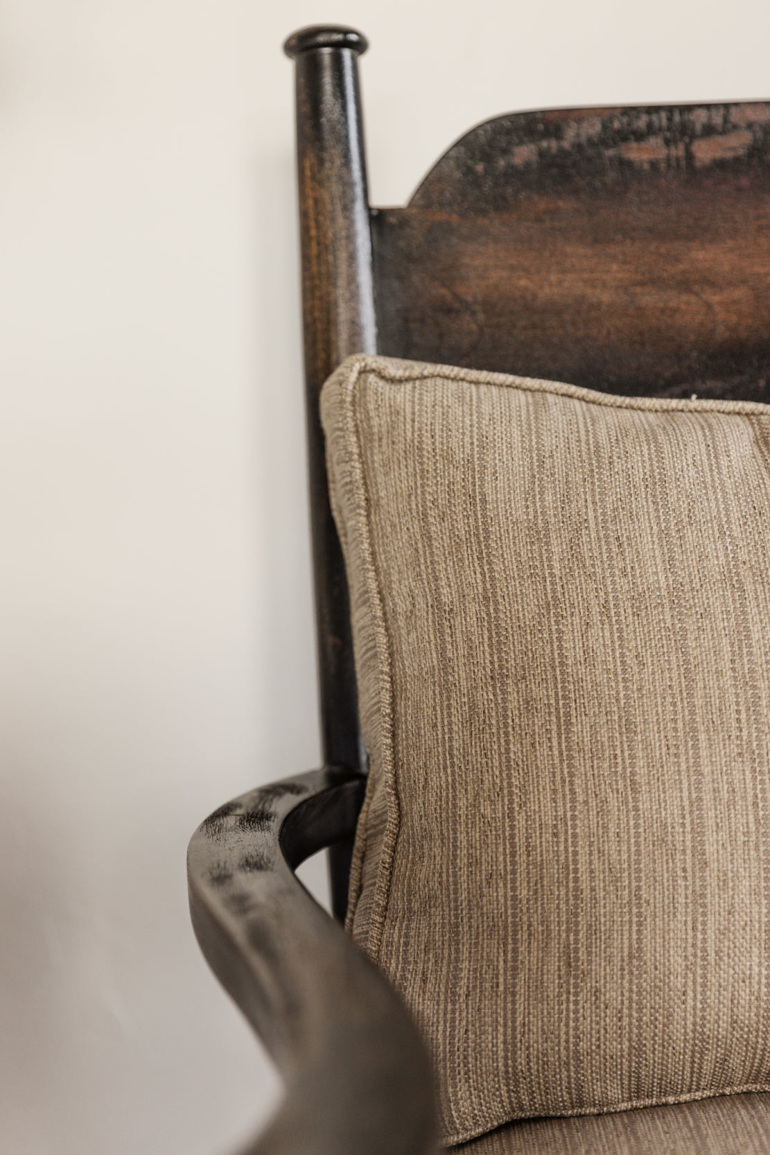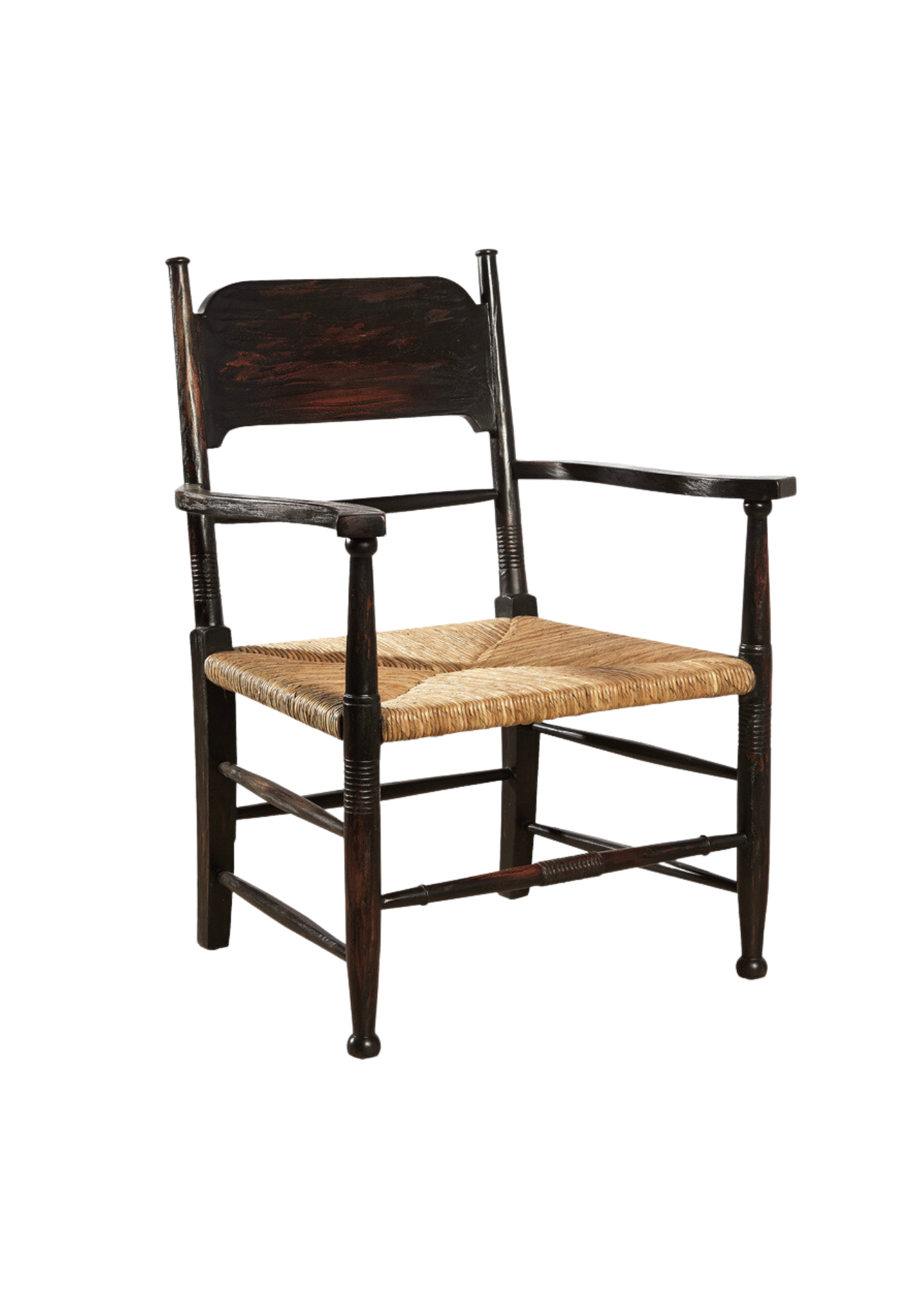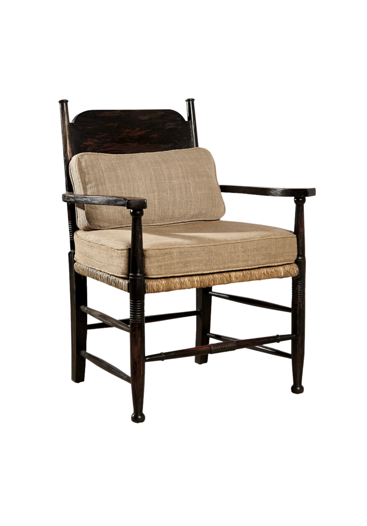 A diminutive form factor coupled with ample seating is the essence of this chair, rendered in mahogany and hand-woven rush, and completed with a removable raw silk cushion and alluring black rub through finish generously infused with subtle rust undertones. It renders a captivating addition to any space.