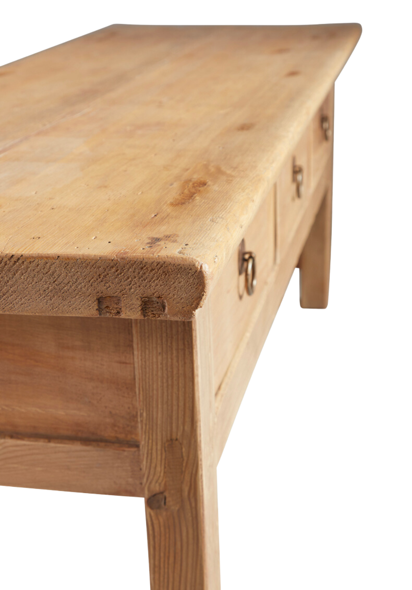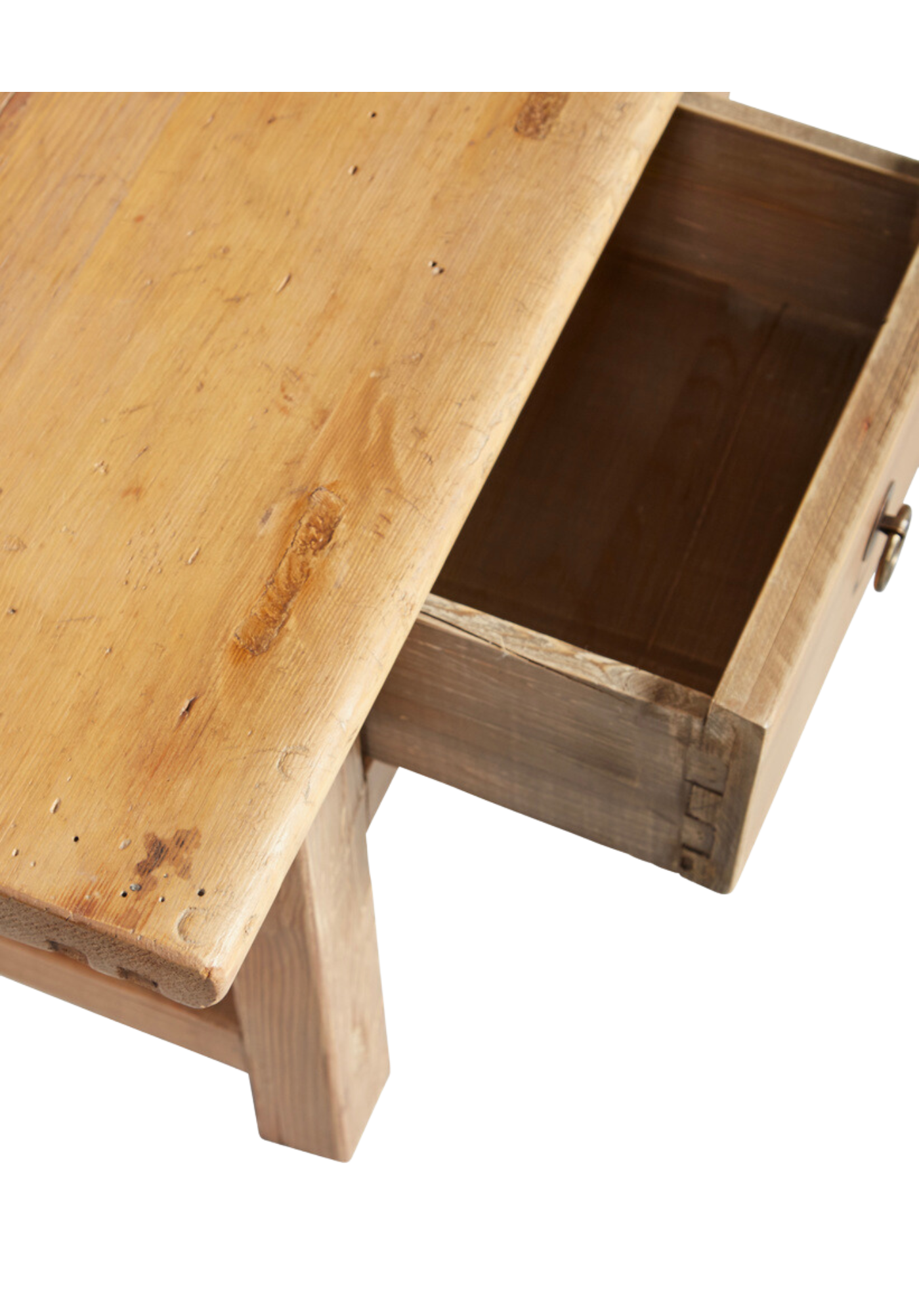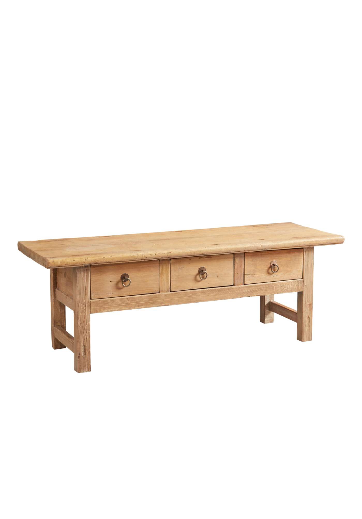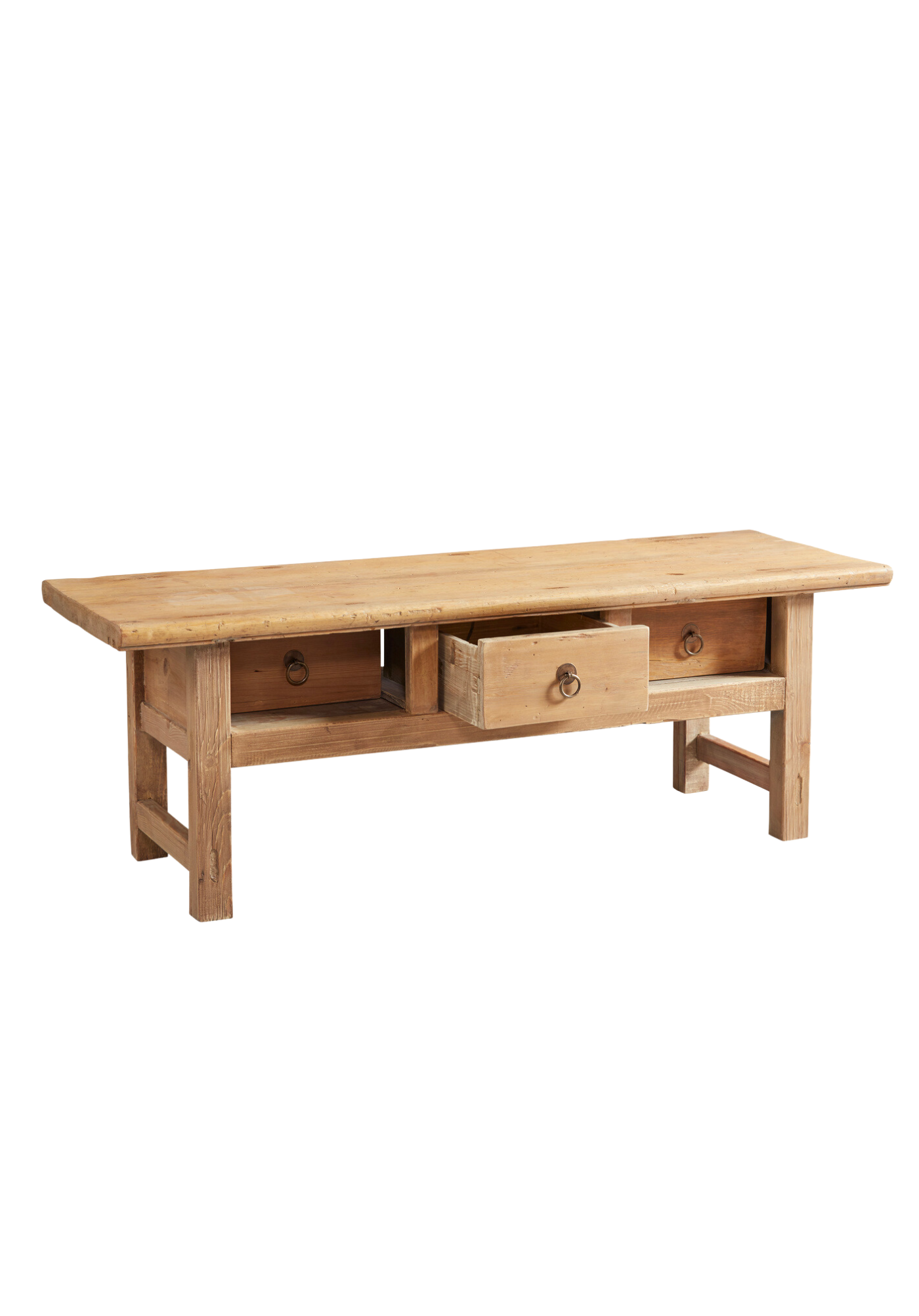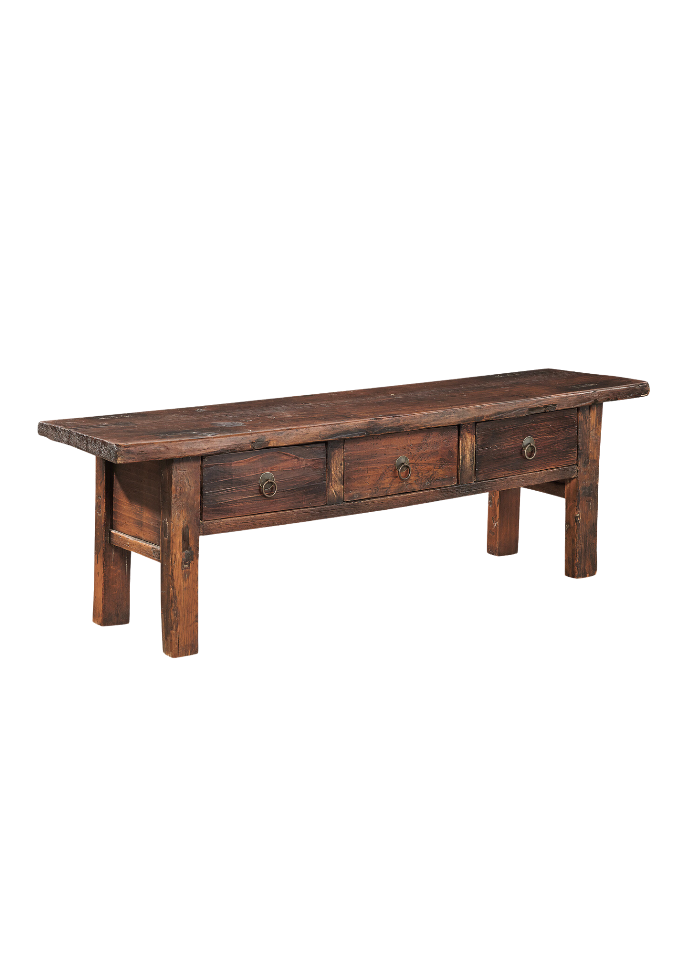 Gathered from traditional rural hamlets, this one-of-a-kind bench boasts enduring craftsmanship and three fully operational drawers. A genuine antique, its dimensions may differ, yet its allure will remain constant. Style this piece as a coffee table in a small room or as an accent bench in your entryway.