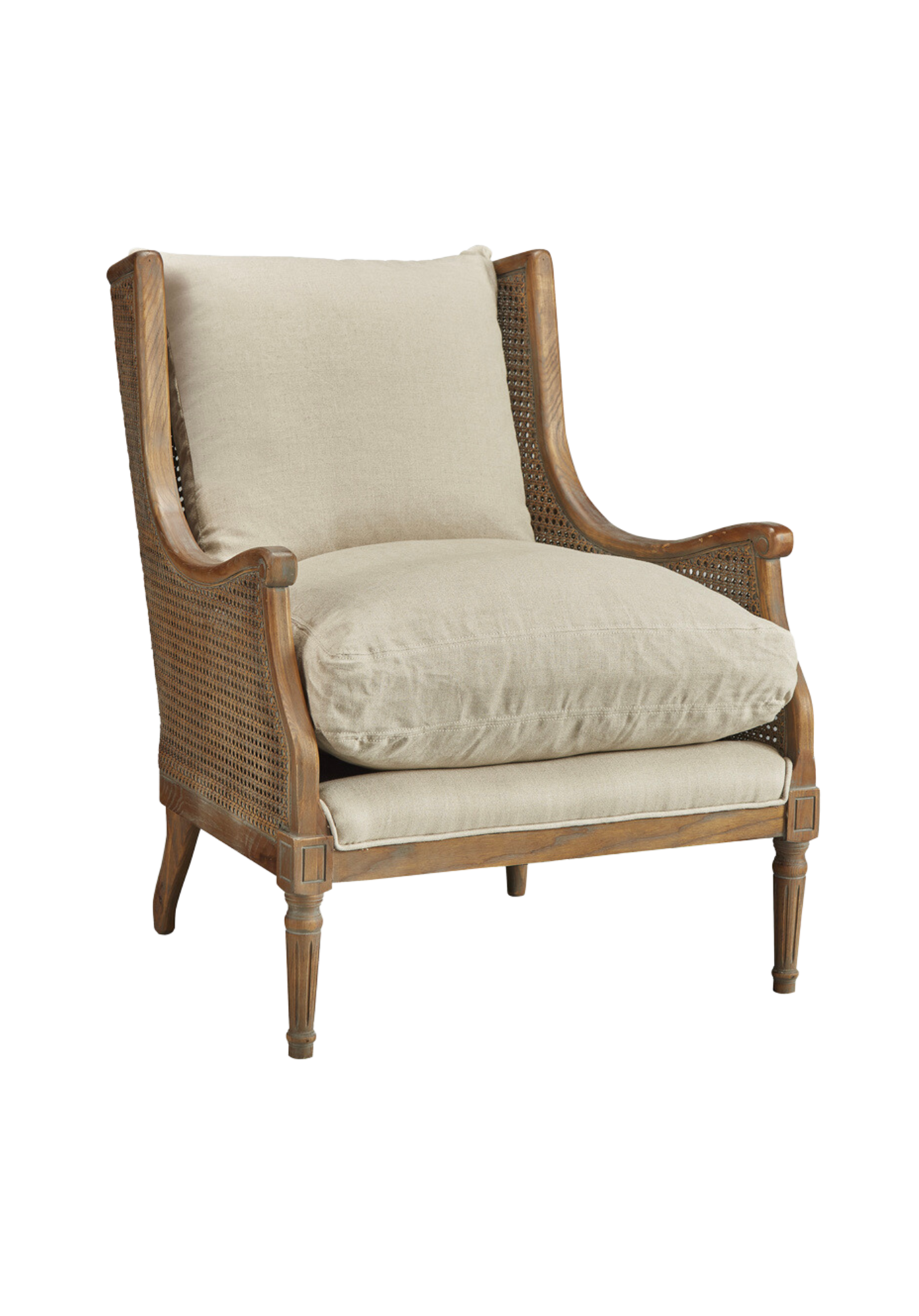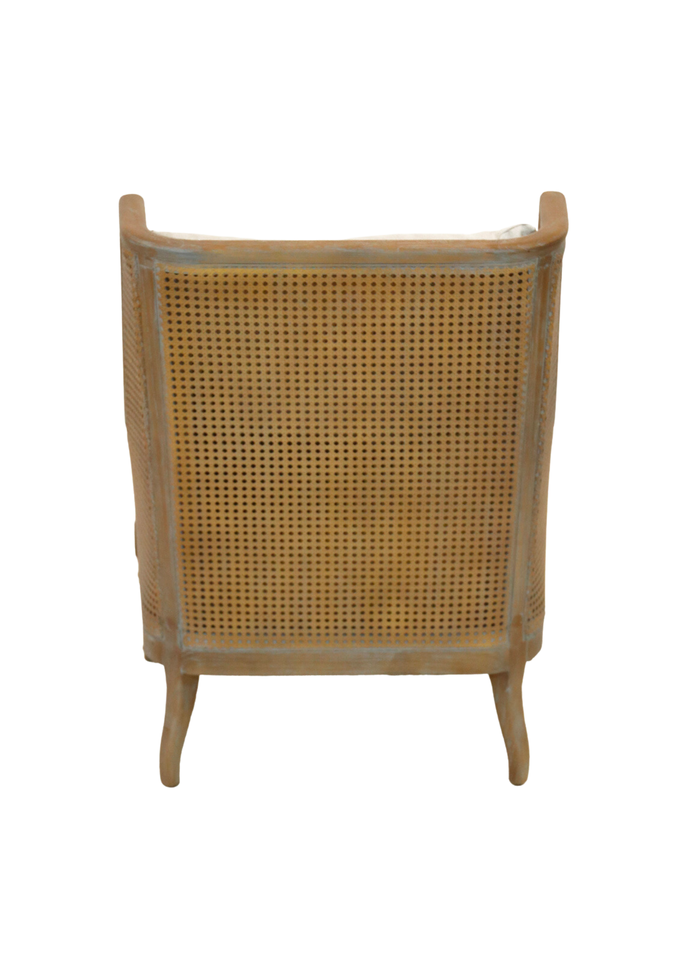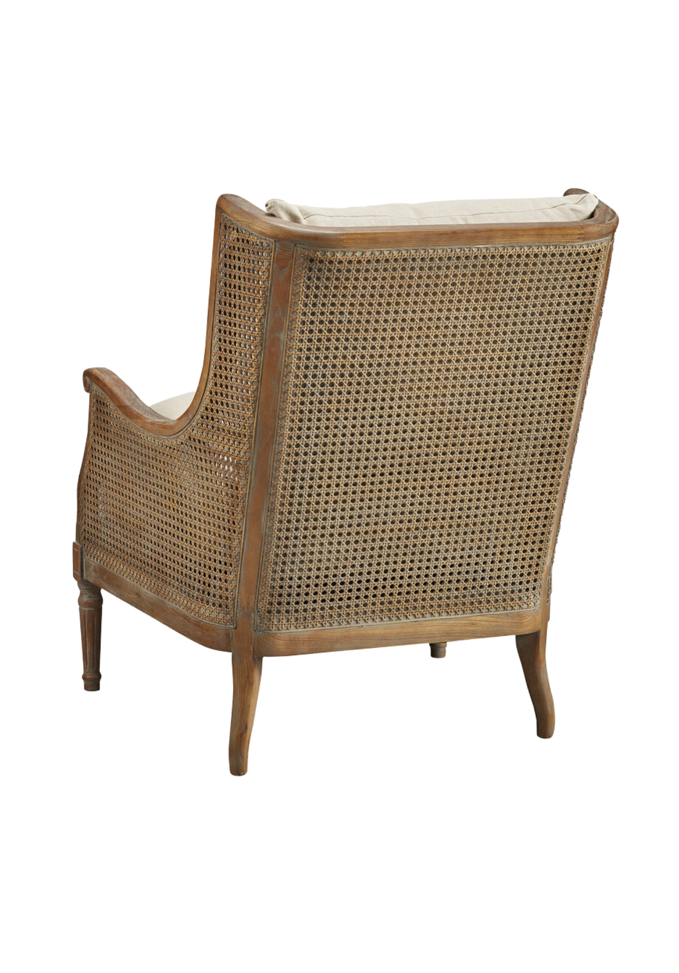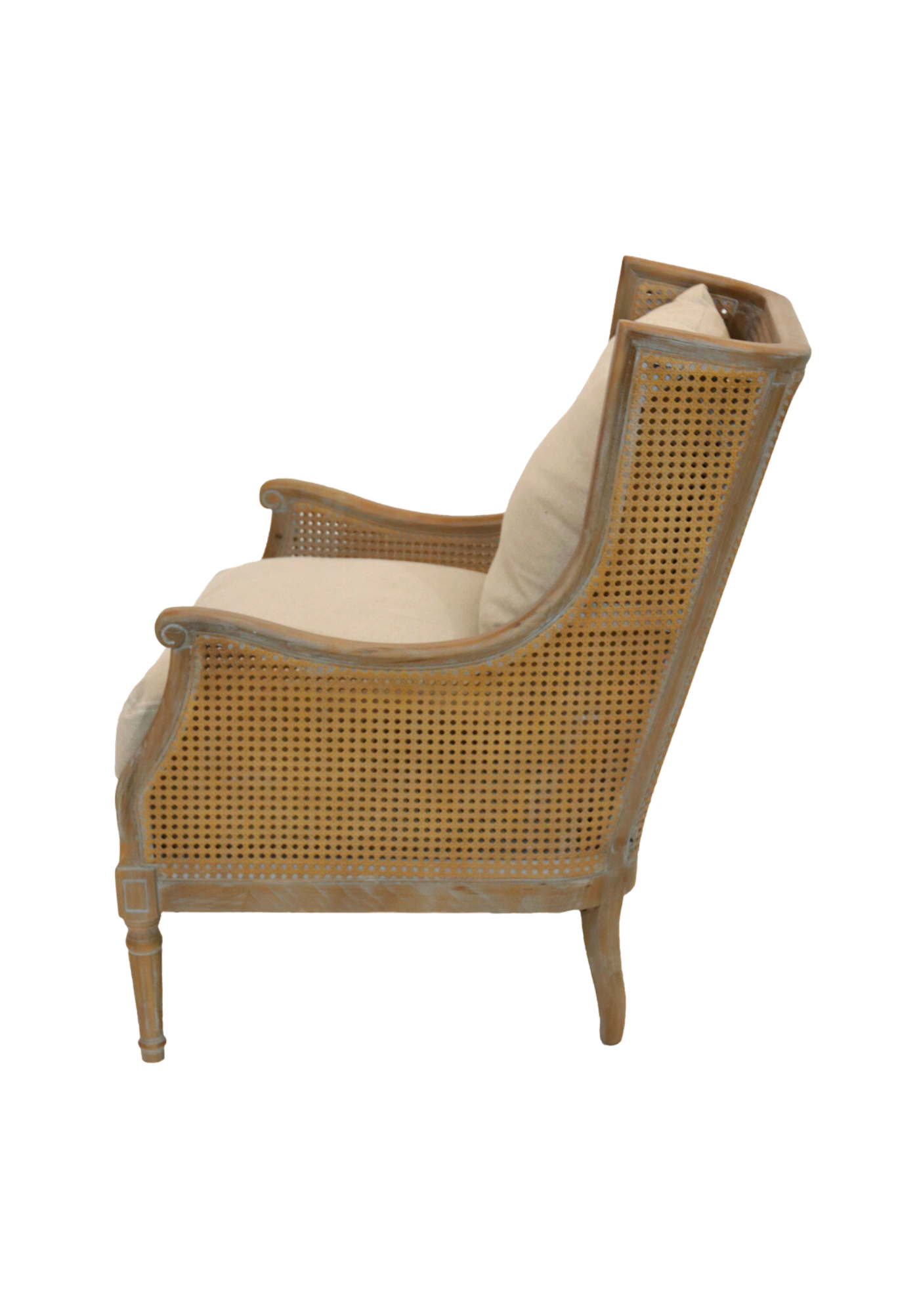 This splendid oak wing chair offers a silent sophistication with its double walled hand caning on the sides and back, subtle curves running from the little wings down to the slim front legs and angled back legs. Sink into the plush cushions - decorated with exquisite natural linen - to experience the comfort of deep, supportive seating.