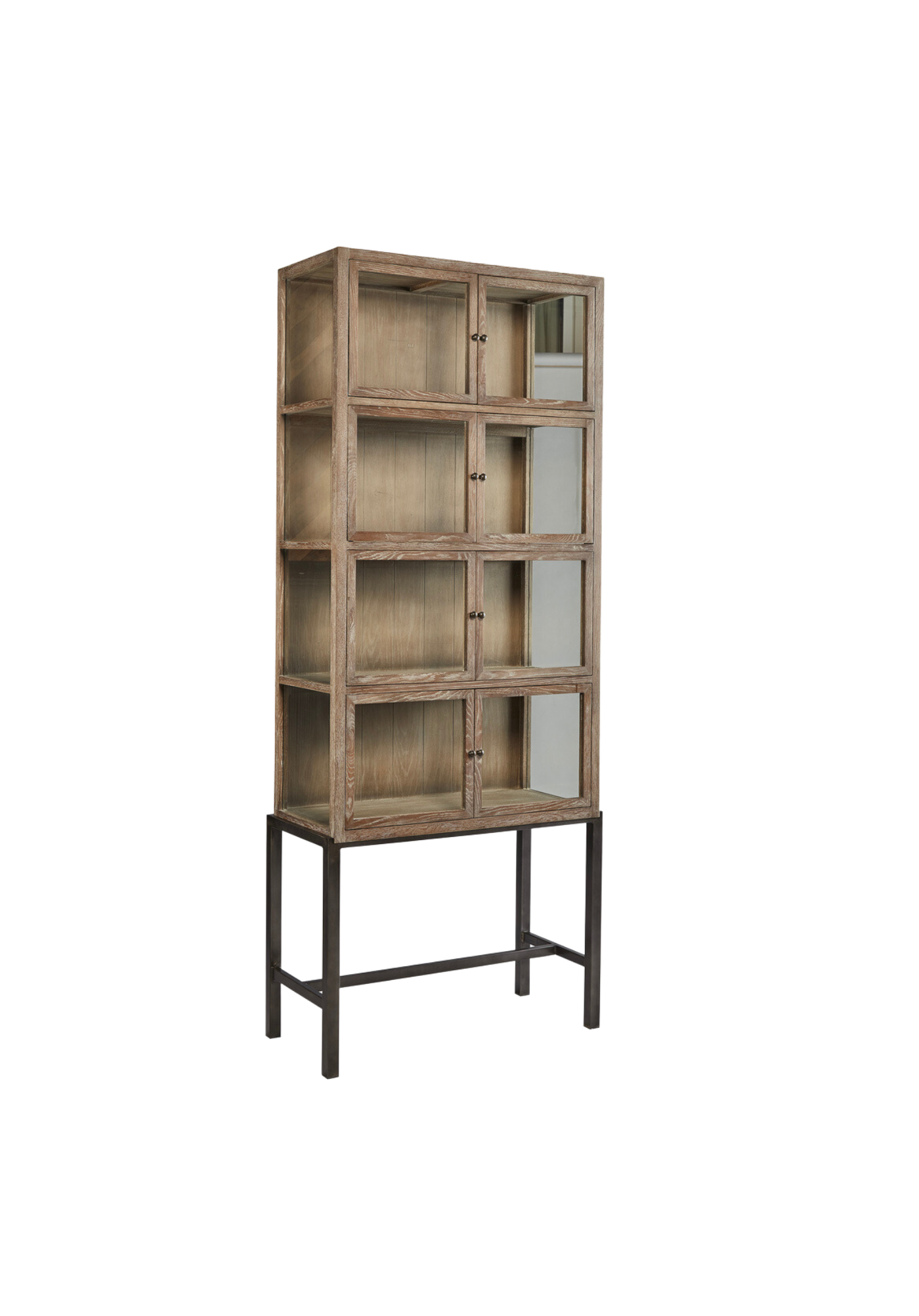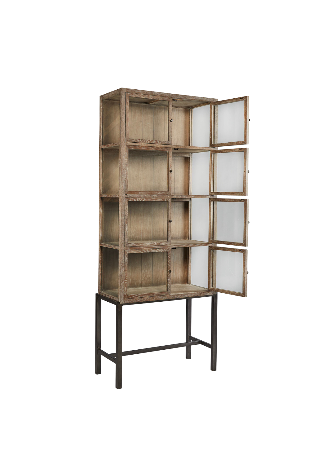 Revel in the inviting elegance of this reclaimed oak display cabinet, perched atop a sleek metal base. Its four pairs of wood-framed glass doors are ideal for showing off your favorite books and treasures.