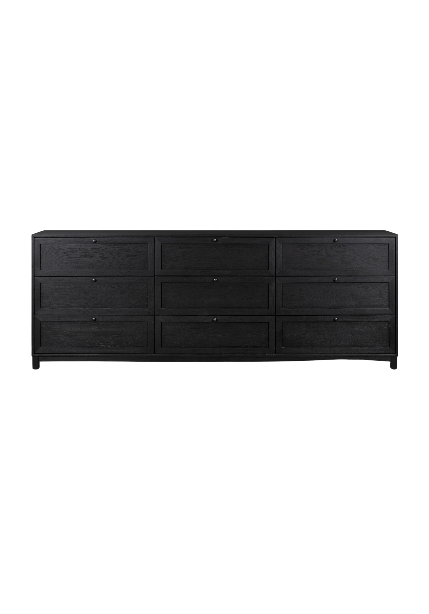 Maximize your storage space with the Ignacio Dresser. With nine spacious drawers, smooth fronts, and matching knobs, this piece is both functional and stylish. Choose from a light bleach oak or drifted matte black finish to complement your decor.