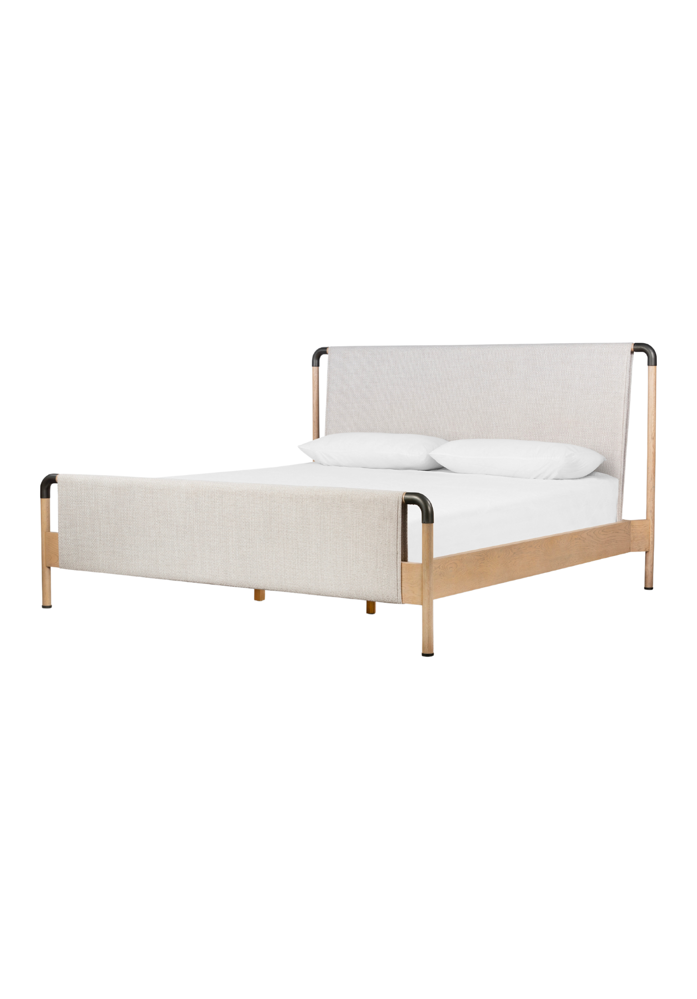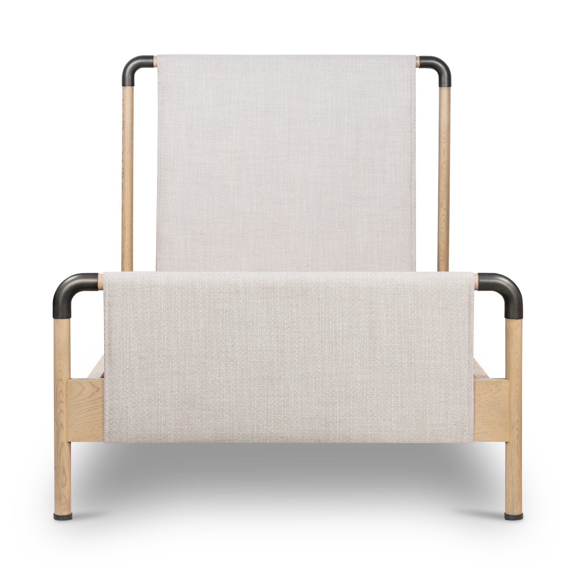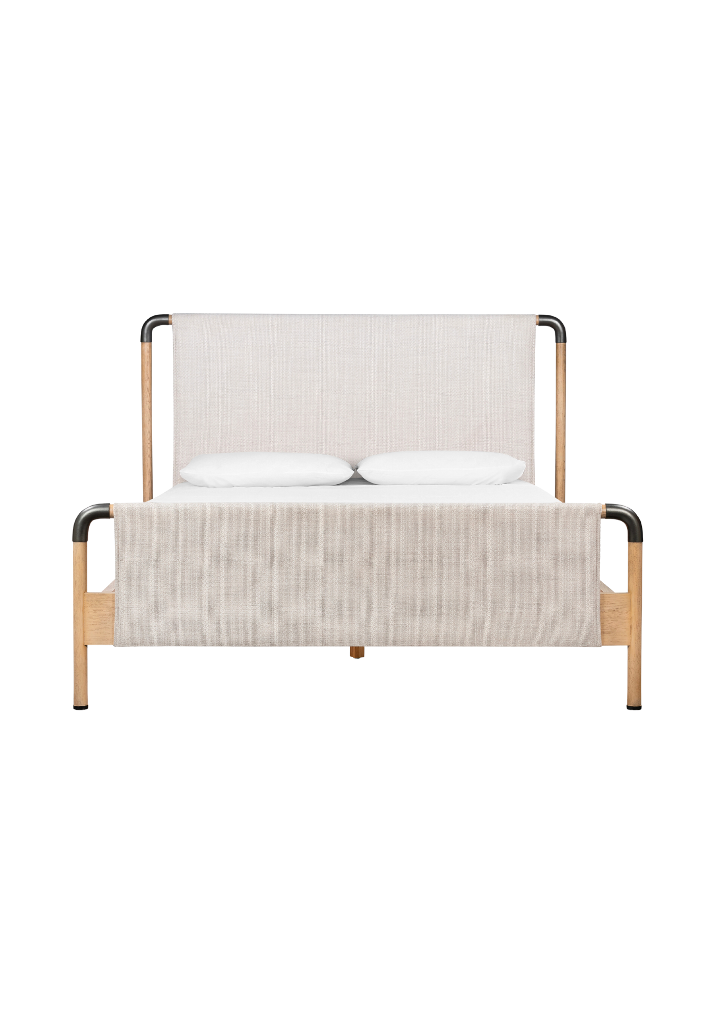 The Jillian Bed is the perfect combination of comfort and style. Boasting a solid oak frame and rounded iron corners, this bed is luxuriously finished with an upholstered, sling-style headboard. Performance fabrics guarantee maximum durability and long-term comfort, so you can sleep soundly night after night. Available in a King, Queen, and Twin size.