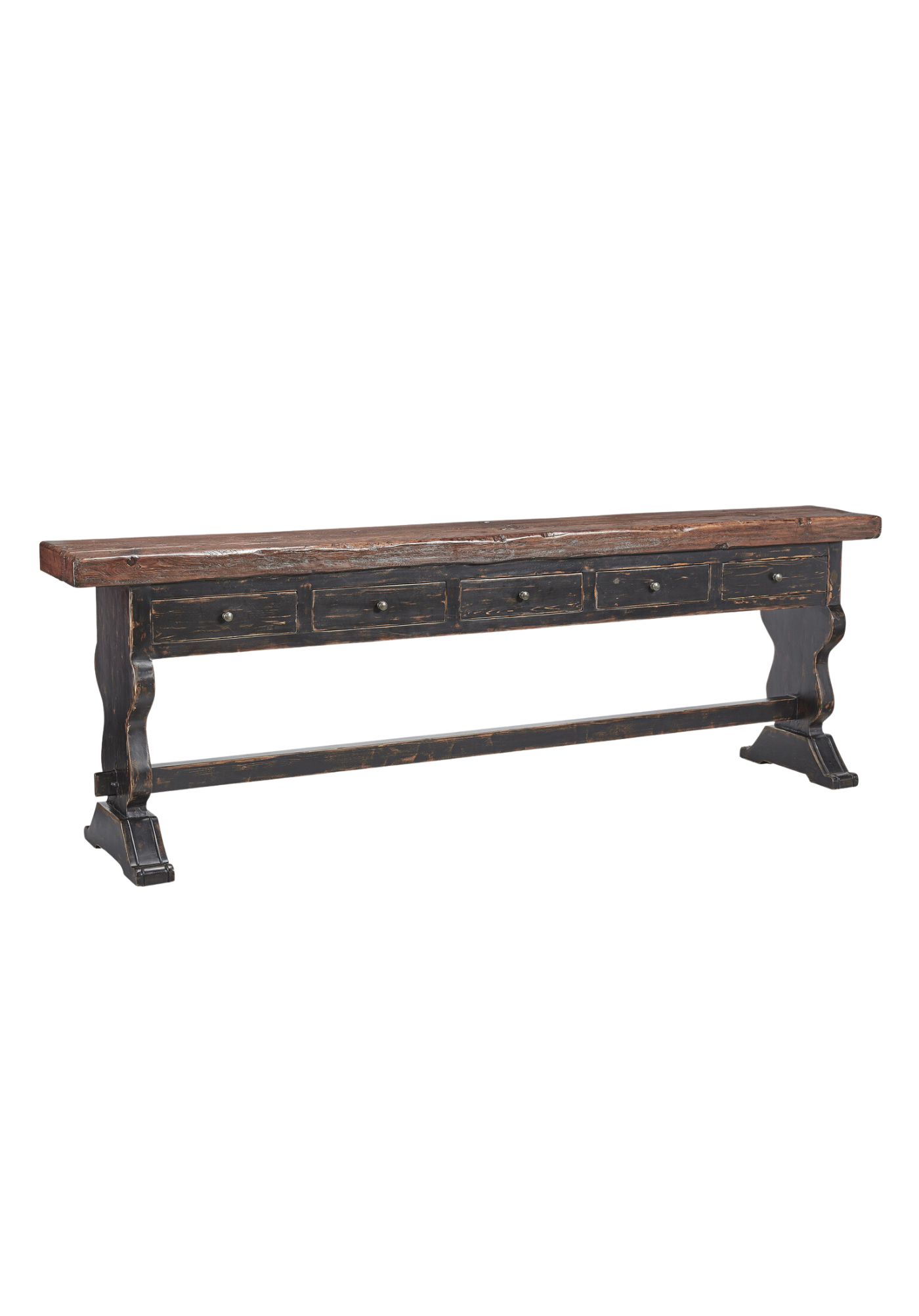 A marvel to behold, this impressive server is made from reclaimed pine and spans an eye-catching length. The unique solid lyre-shaped trestles lend it stability, while the physically distressed finish, hinting at years of caring use, adds a unique charm. With a rubbed black base and warm brown top, this beauty is ideal for anchoring a much-loved piece of art or those large TVs.Â