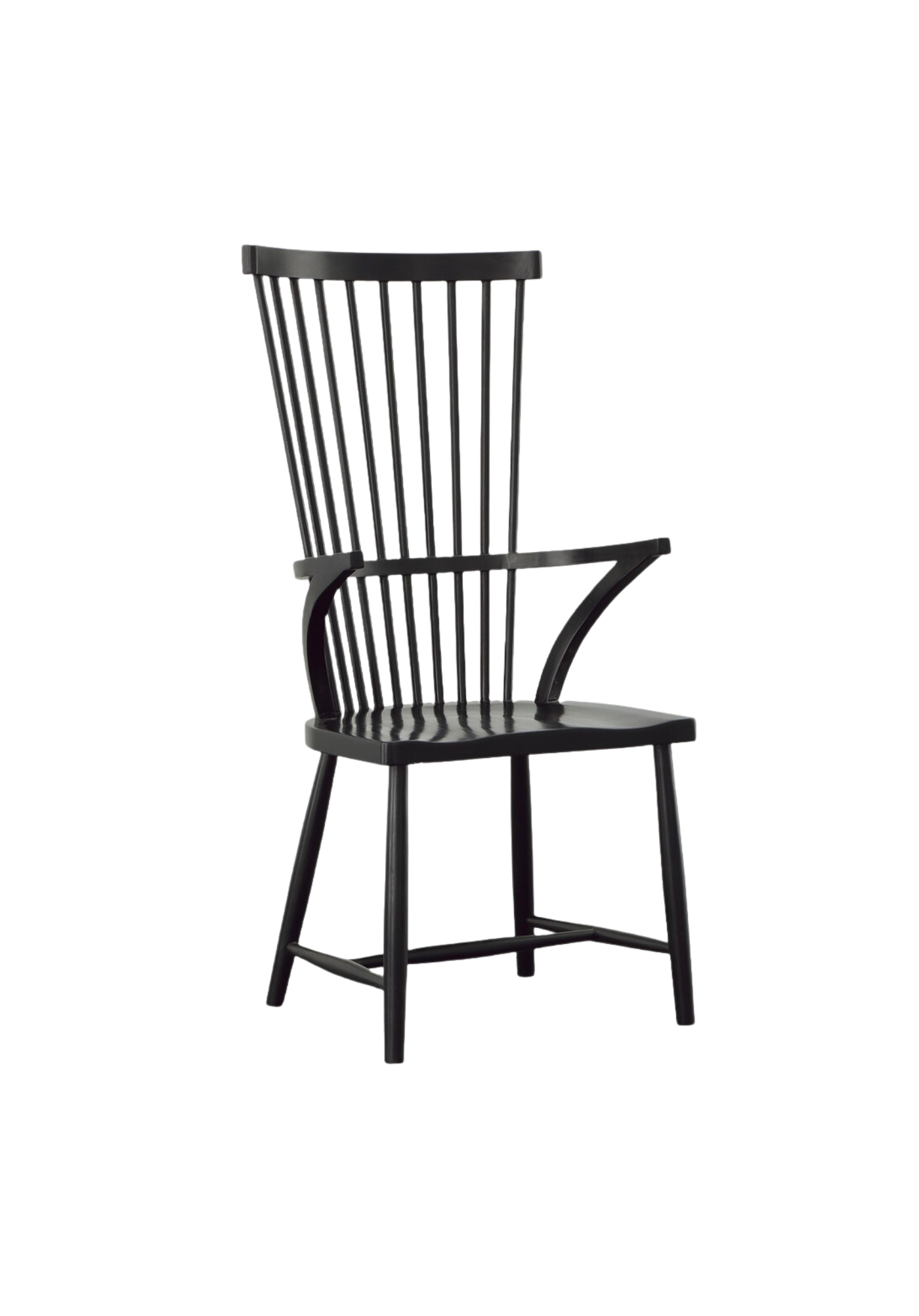 A sleek black Windsor chair, with its dignified high-back, adds a sense of elegance at the end of a lengthy dining table, or injects some drama into your den.