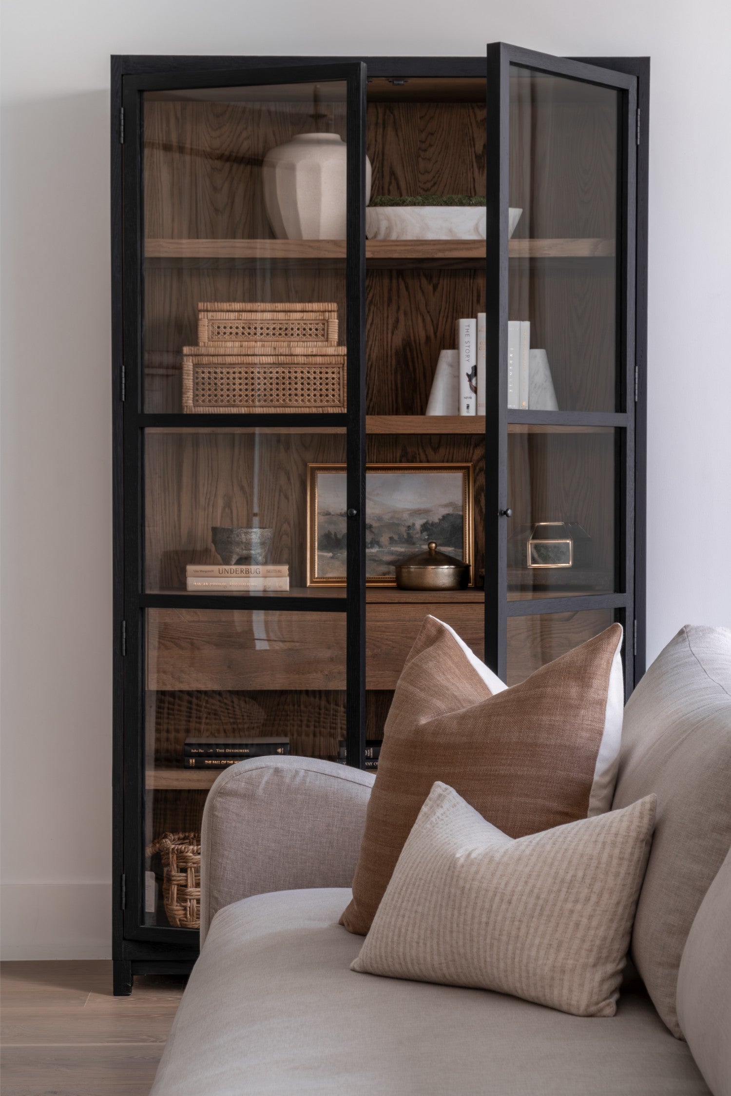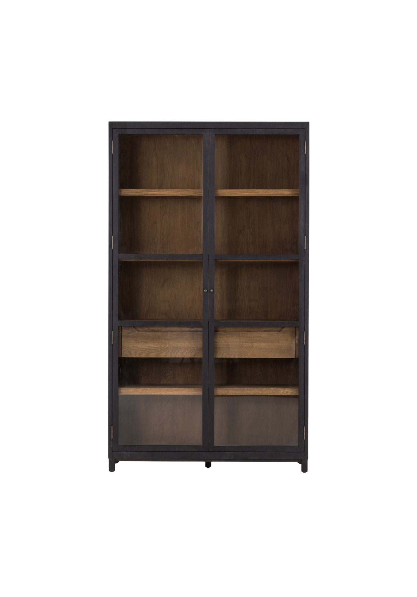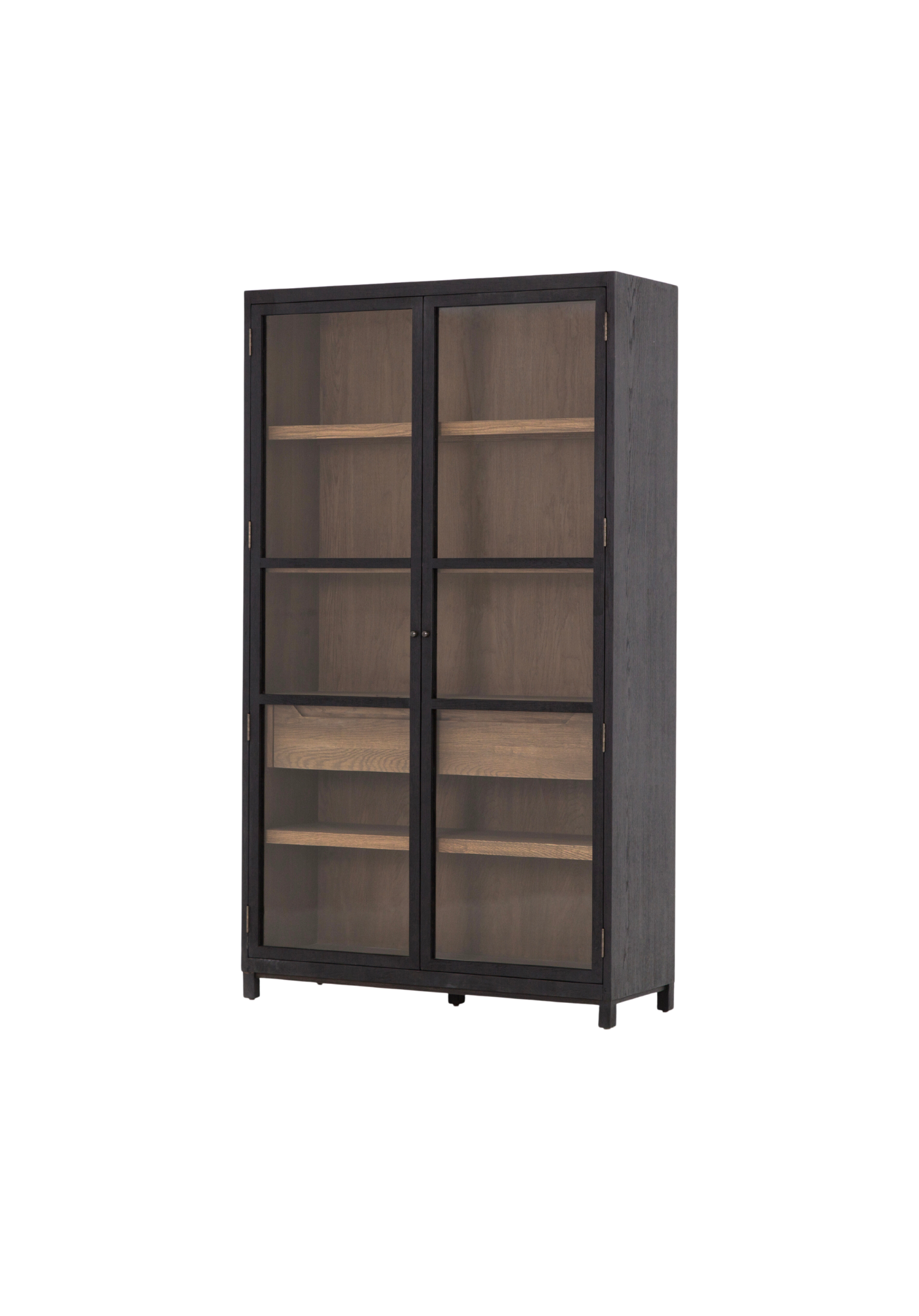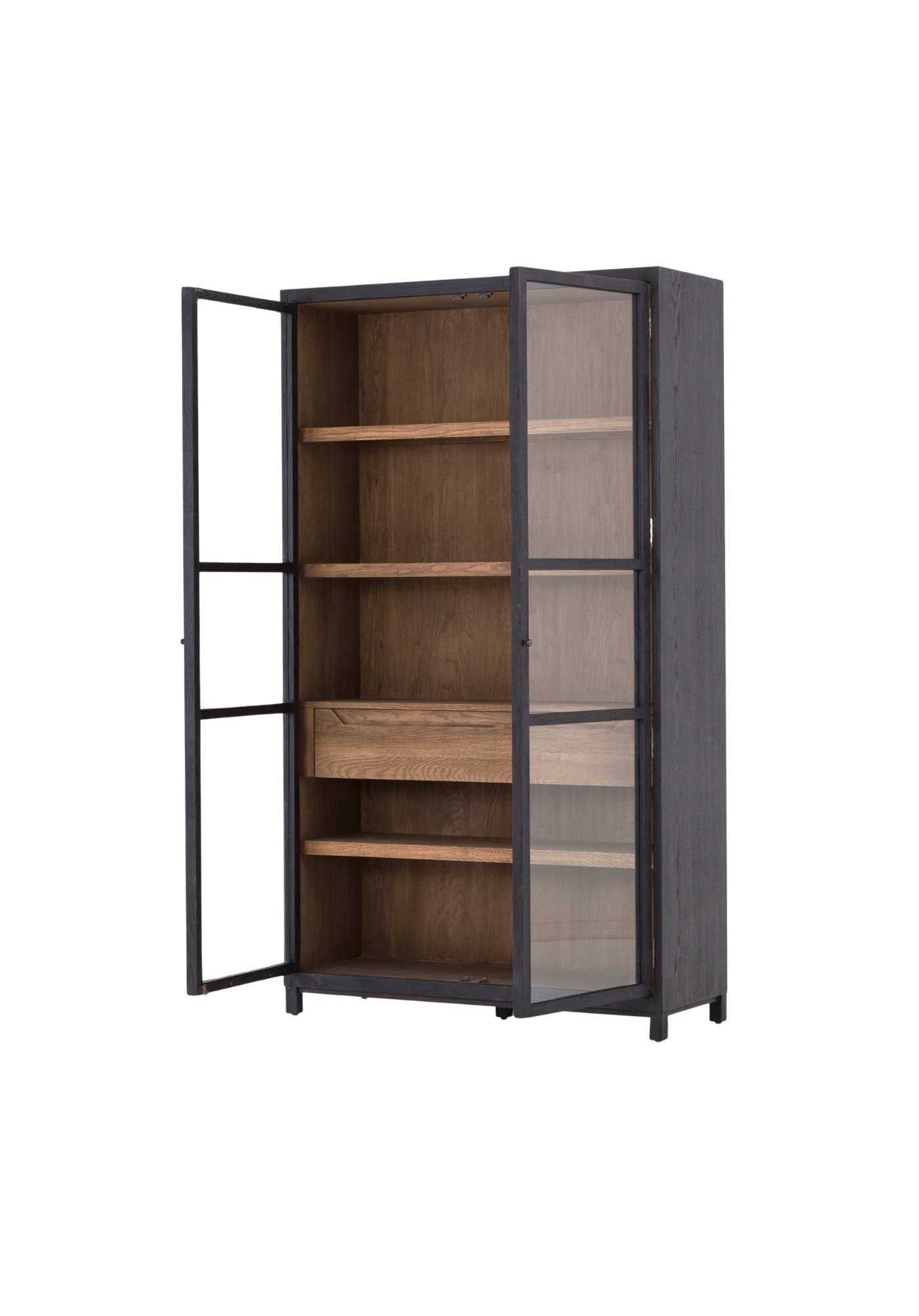 Give your space an instant upgrade with the Lennon Cabinet. Its two-tone transparency and black drifted oak framing provides an eye-catching contrast that will draw all glances. Its glass doors let your prized possessions sparkle, while the internal drawer offers discreet storage.