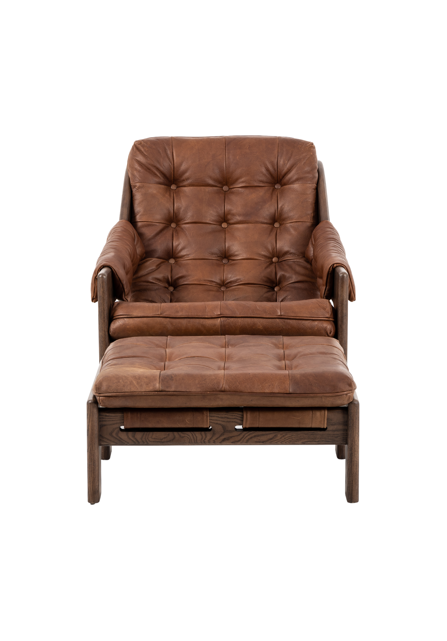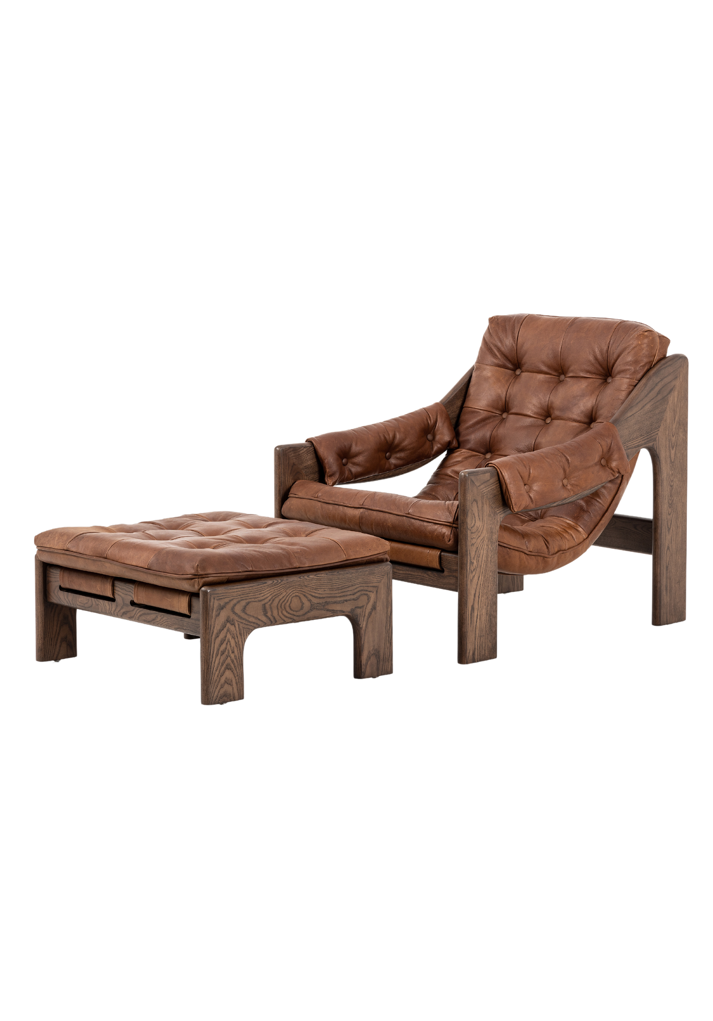 With inspiration drawn from a vintage, 70s aesthetic found at a local flea market, the Maurice Sling Chair & Ottoman Set boasts a luxuriously tufted sling seat made of premium top-grain leather. The seat is angled to provide optimal comfort, and is paired with a wide, brown ash frame. The leather is sourced from a prestigious, family-owned tannery in Italy's Bassano del Grappa, and is made from upcycled hides with natural markings, scars, and color variations. As a result, the leather is incredibly supple, buttery soft, and boasts a unique depth of color and richness, giving it an authentic, lived-in appearance.