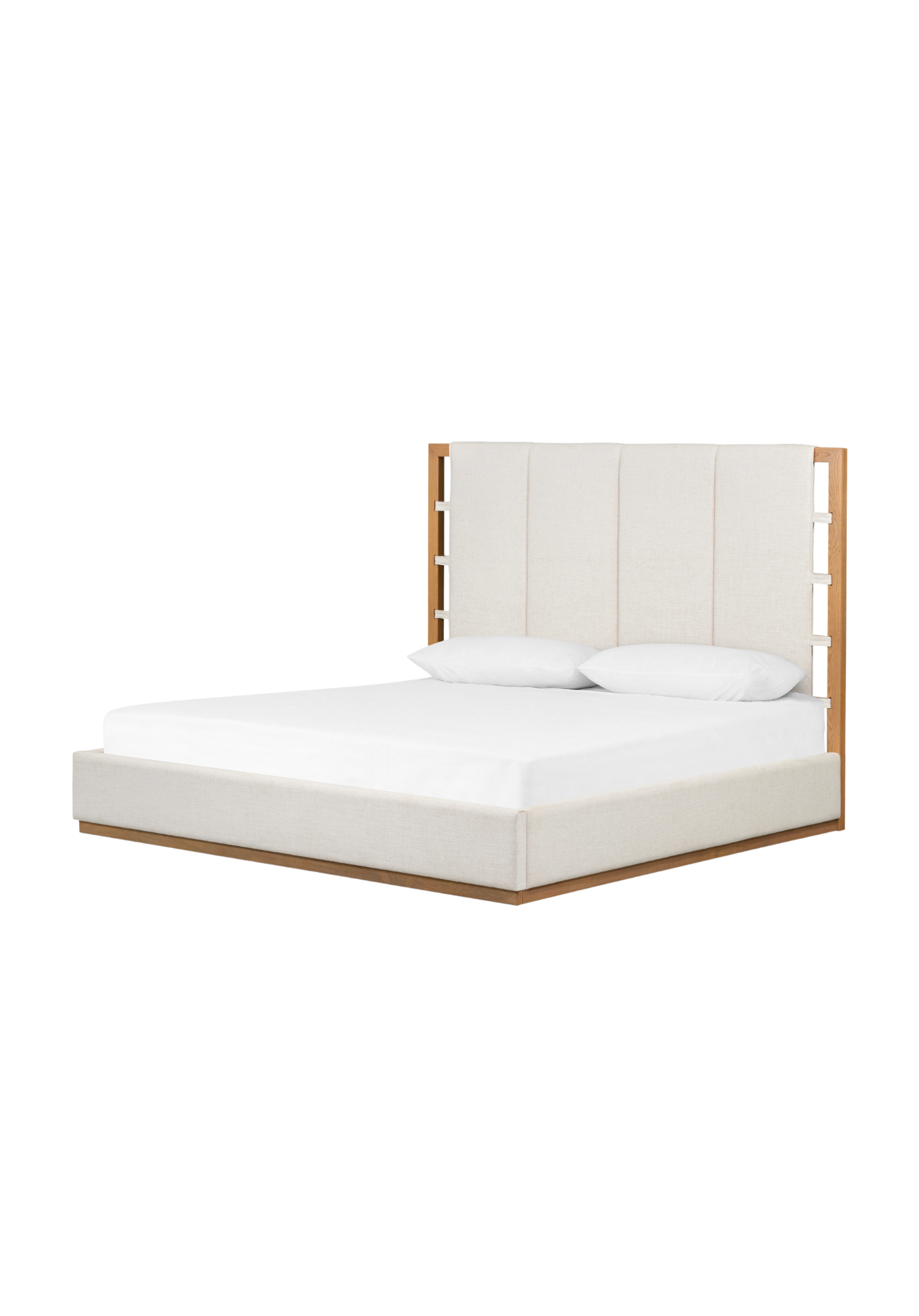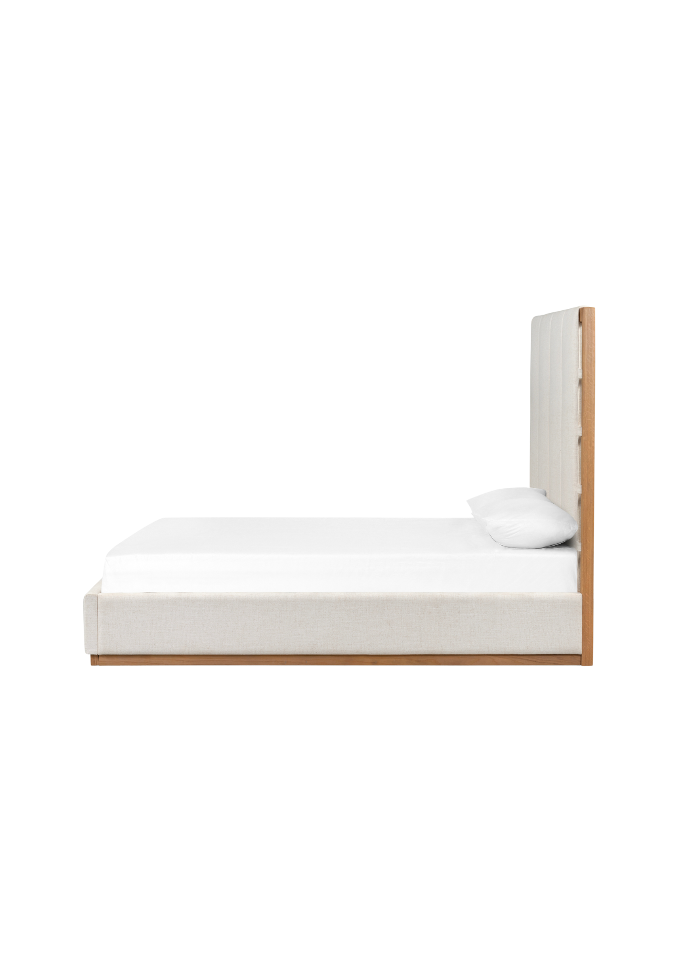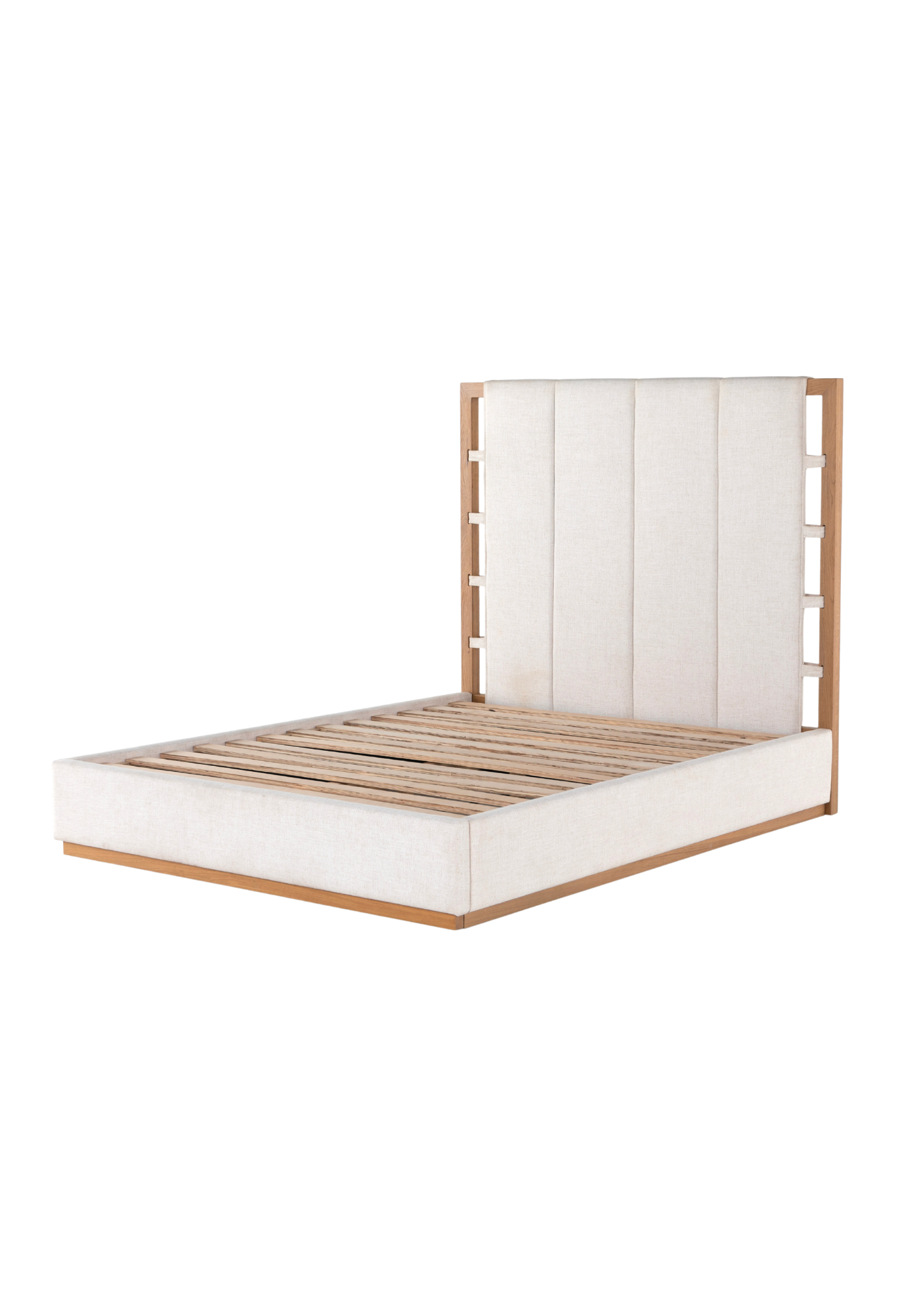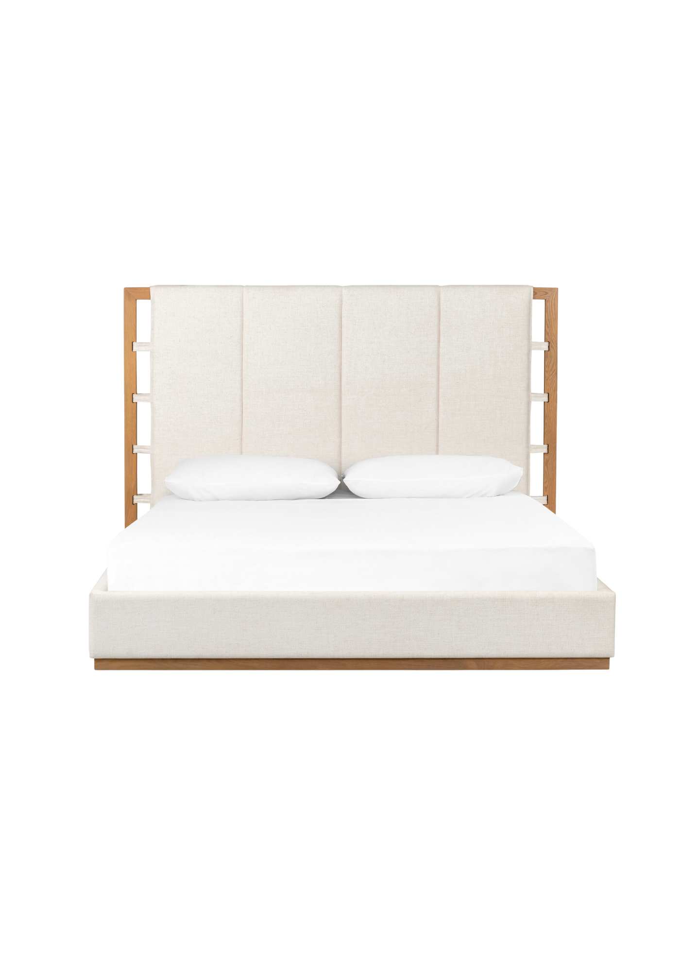 Upgrade your sleeping area with the Raniah Bed. Crafted from burnished solid oak and lined with a linen-like upholstery, this bed includes a stylish plinth-style base and a unique strap headboard detailing. Constructed with high-performance fabrics for enhanced comfort and protection against spills and stains.