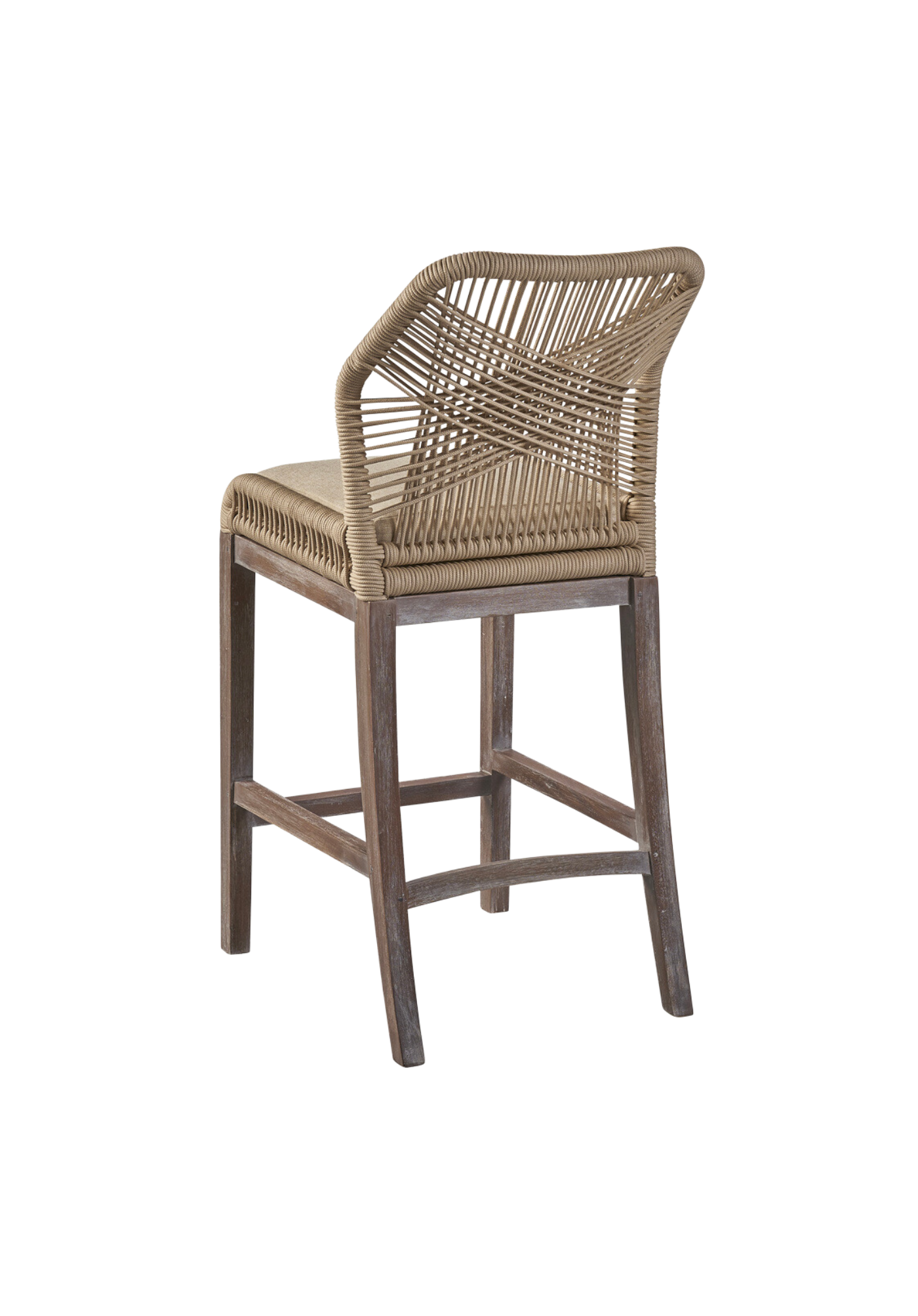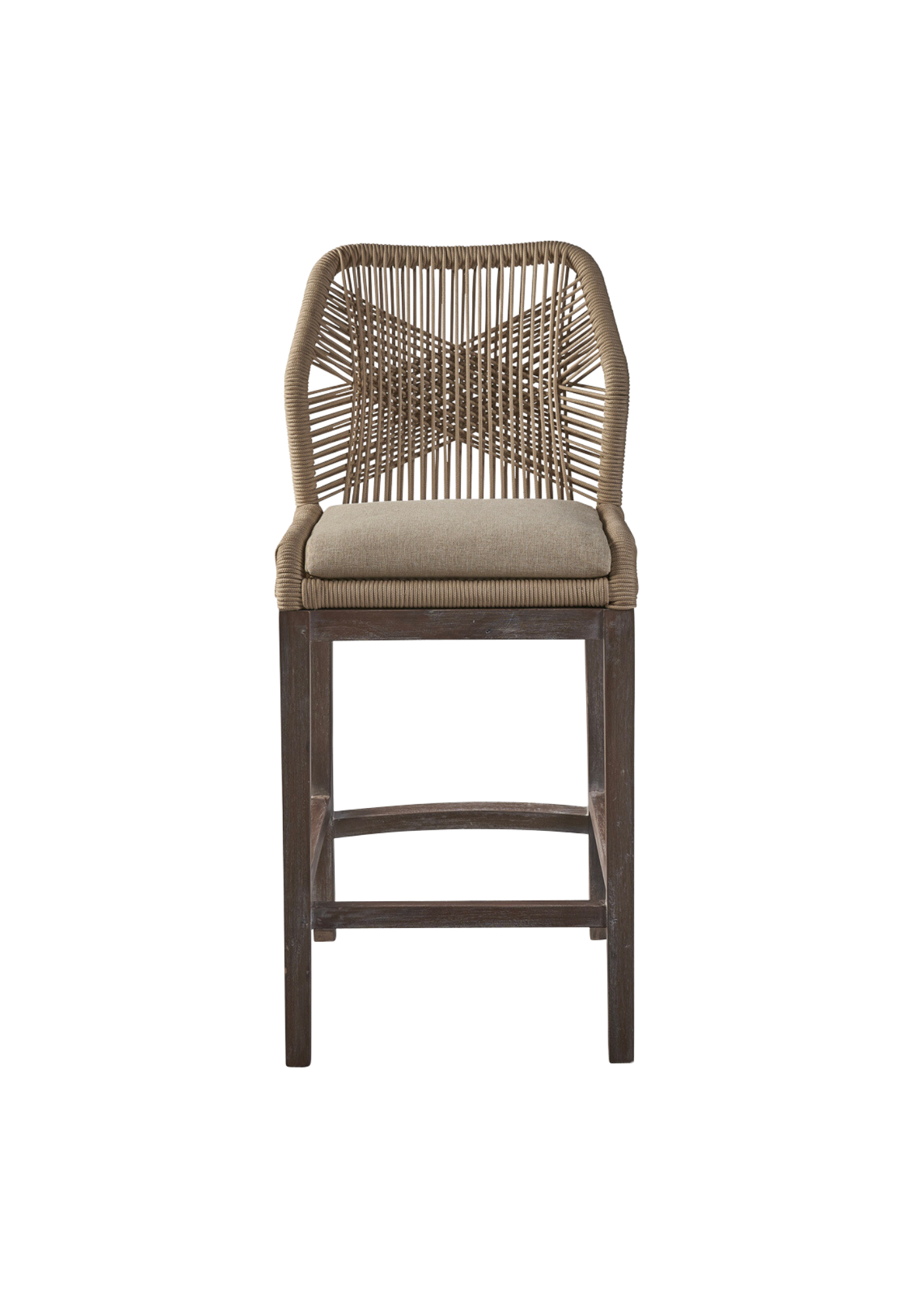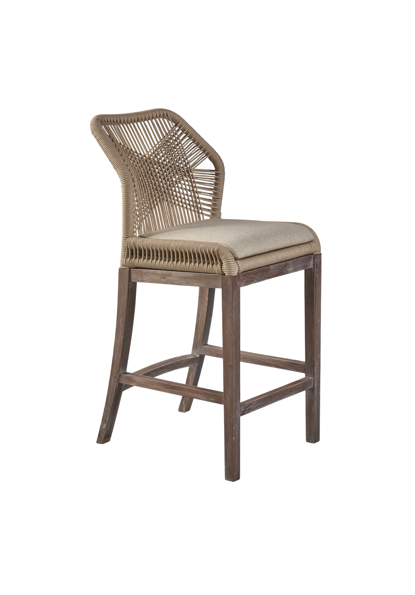What an original addition to your cooking space or family room. This cozy counter stool boasts an aluminum frame and a light mahogany base craftily coiled with a synthetic cord for a comfy seat with mid-century charm. Available in grey or a light brown hue.