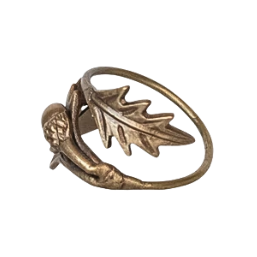 This Acorn Napkin Ring showcases detailed brass leaves and an acorn design with an antique finish, offering a sophisticated accent for your table decor.