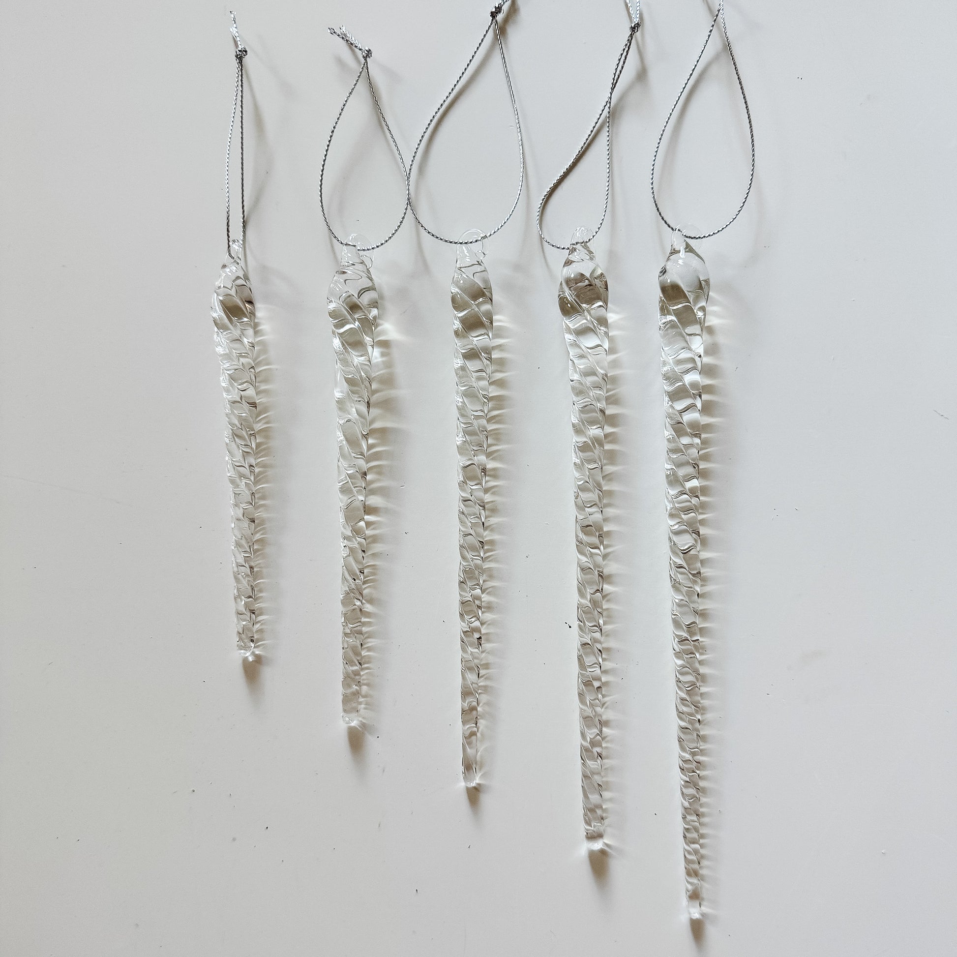 Delicate and timeless, our Glass Icicle Ornament Set adds a touch of winter elegance to your holiday decor. Each piece is handcrafted from clear glass, designed to capture and reflect light with icy brilliance. The varied sizes create a natural, organic look, perfect for draping along tree branches or wreaths.