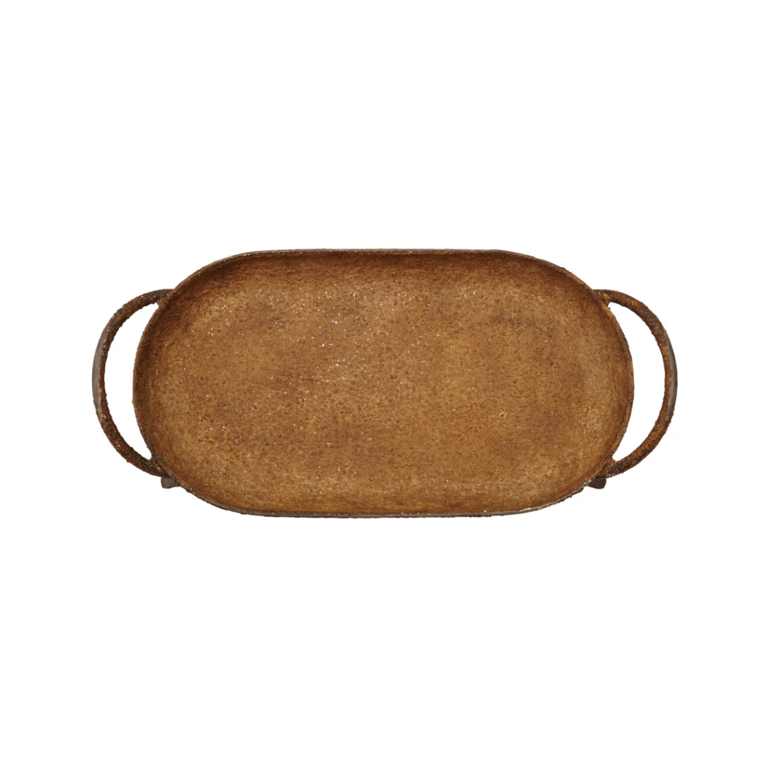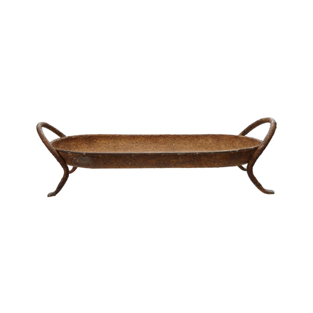 The Rusted Metal Footed Tray combines practical design with vintage charm. Featuring sturdy handles and elevated feet, its heavily distressed rust finish provides an authentic aged look, perfect for enhancing rustic or industrial interiors while ensuring long-lasting durability.