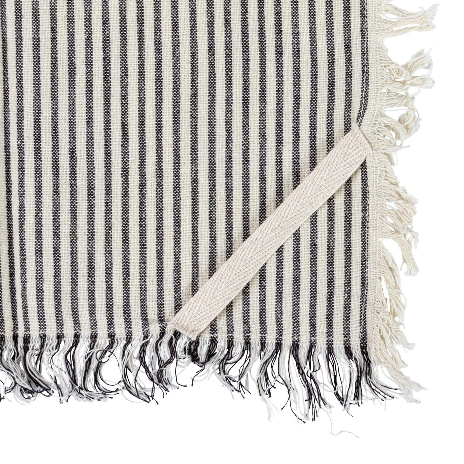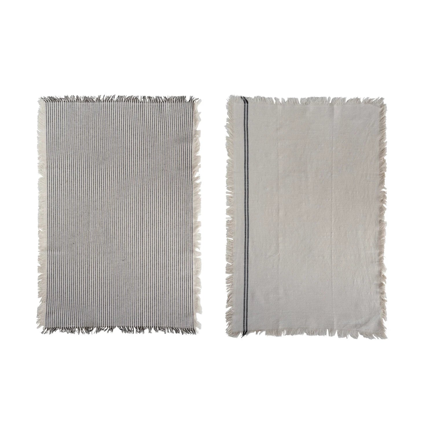 These generously sized woven cotton tea towels showcase timeless stripes complemented by stylish fringe accents. Made from 100% cotton, they provide superior absorbency and long-lasting strength, ideal for daily kitchen tasks. Offered as a pair or individually.