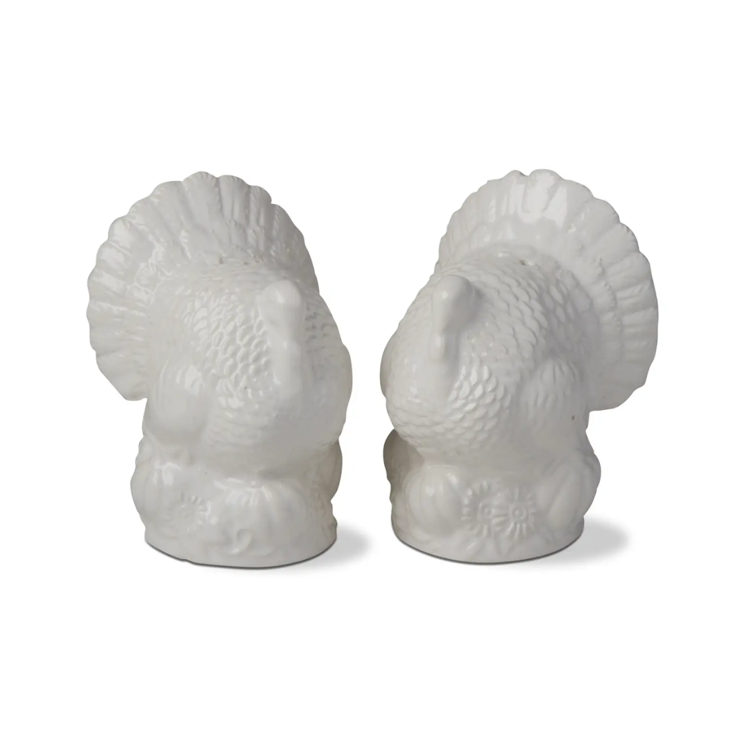 Salt & pepper shakers are essential to any kitchen. This set is made from earthenware, featuring adorable turkey designs with highly sculpted details on an organic body. Perfect accents for the fall season and any autumn-themed tablescape.