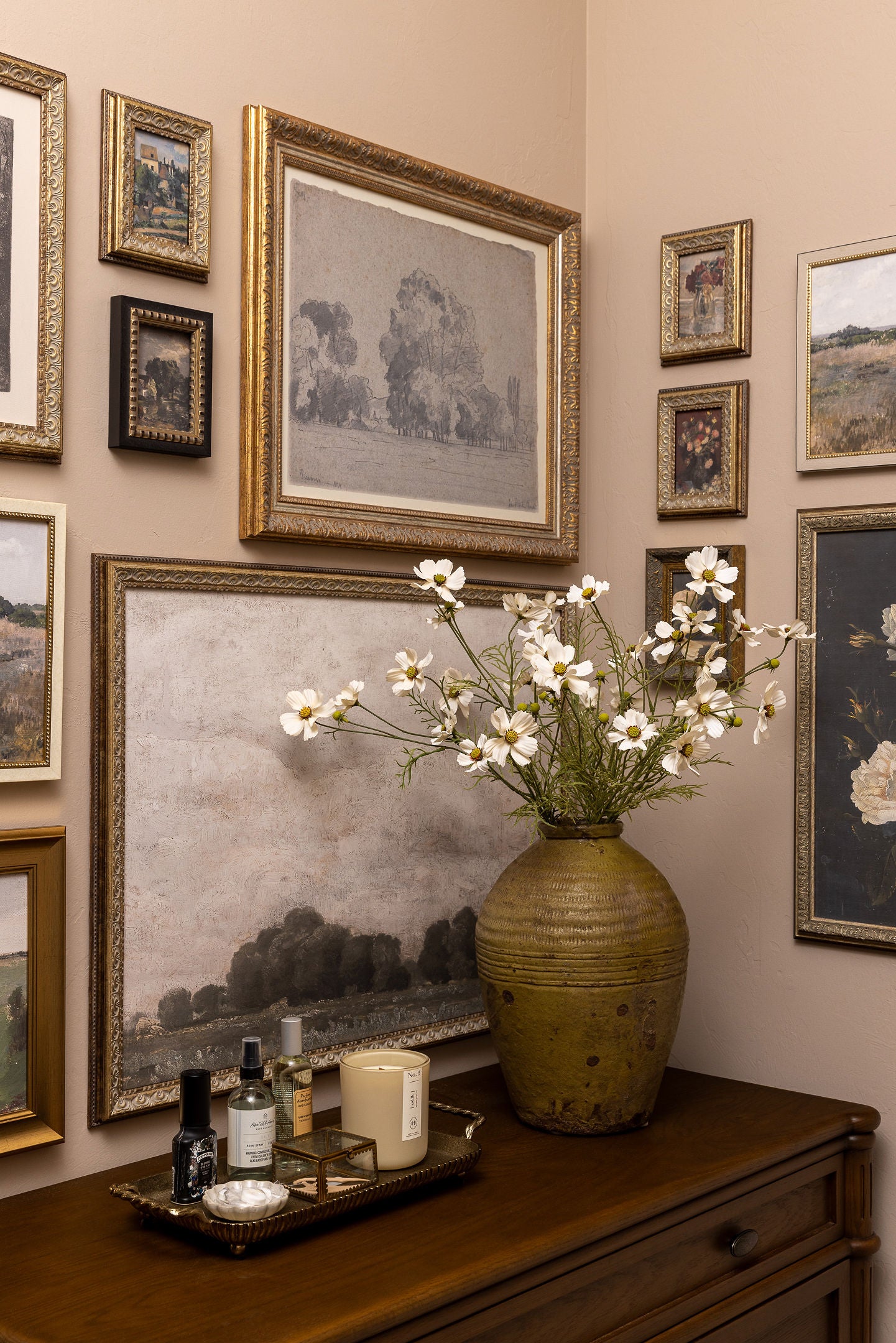 This framed landscape art features muted tones and soft brushstrokes, evoking a sense of calm and timeless beauty. The ornate gold frame adds vintage character, perfectly complementing the subtle details of the artwork. A versatile piece that brings understated charm to walls or curated displays.