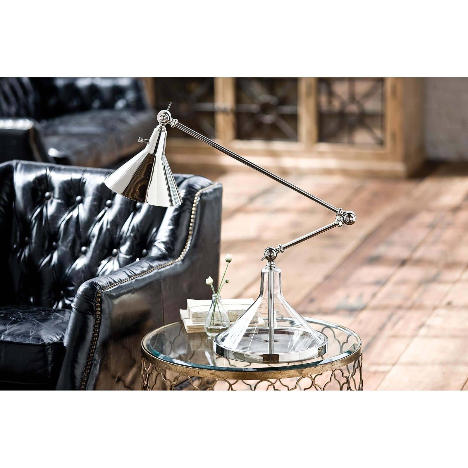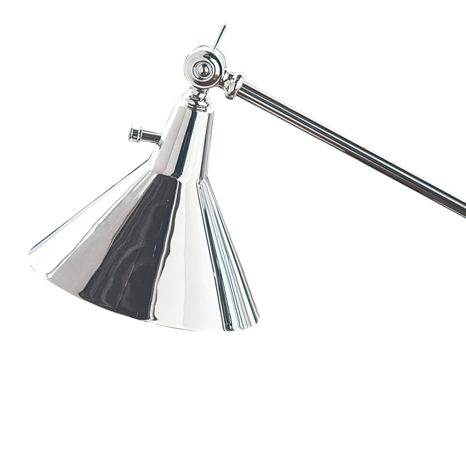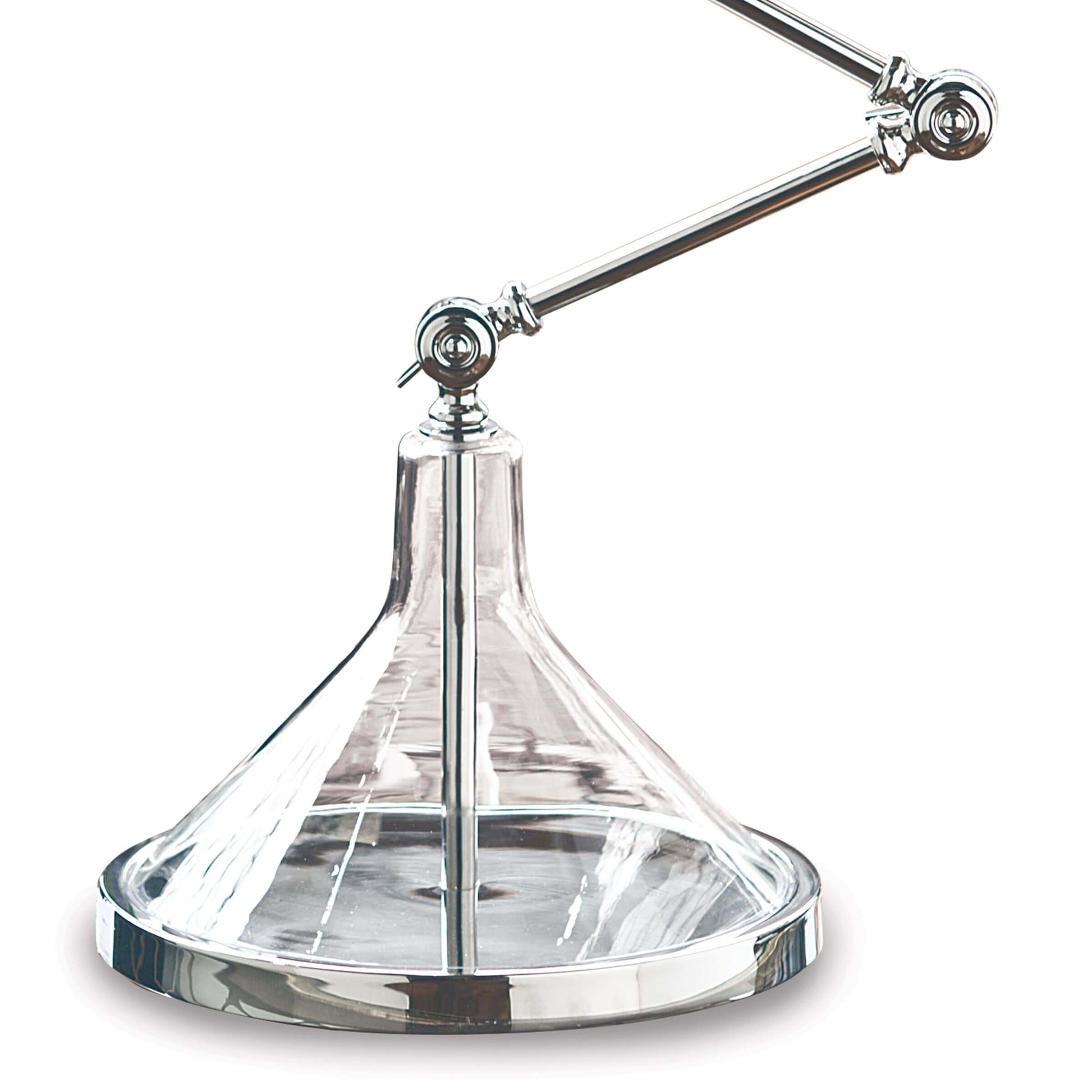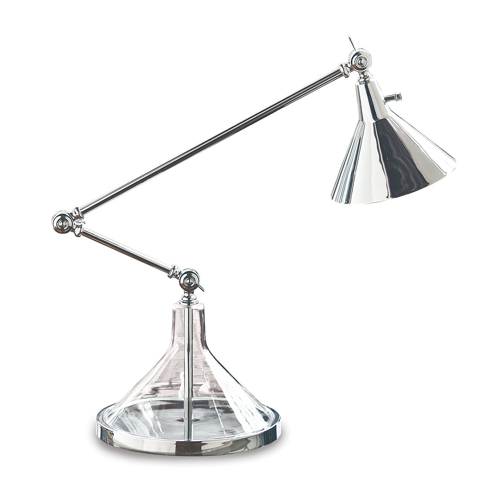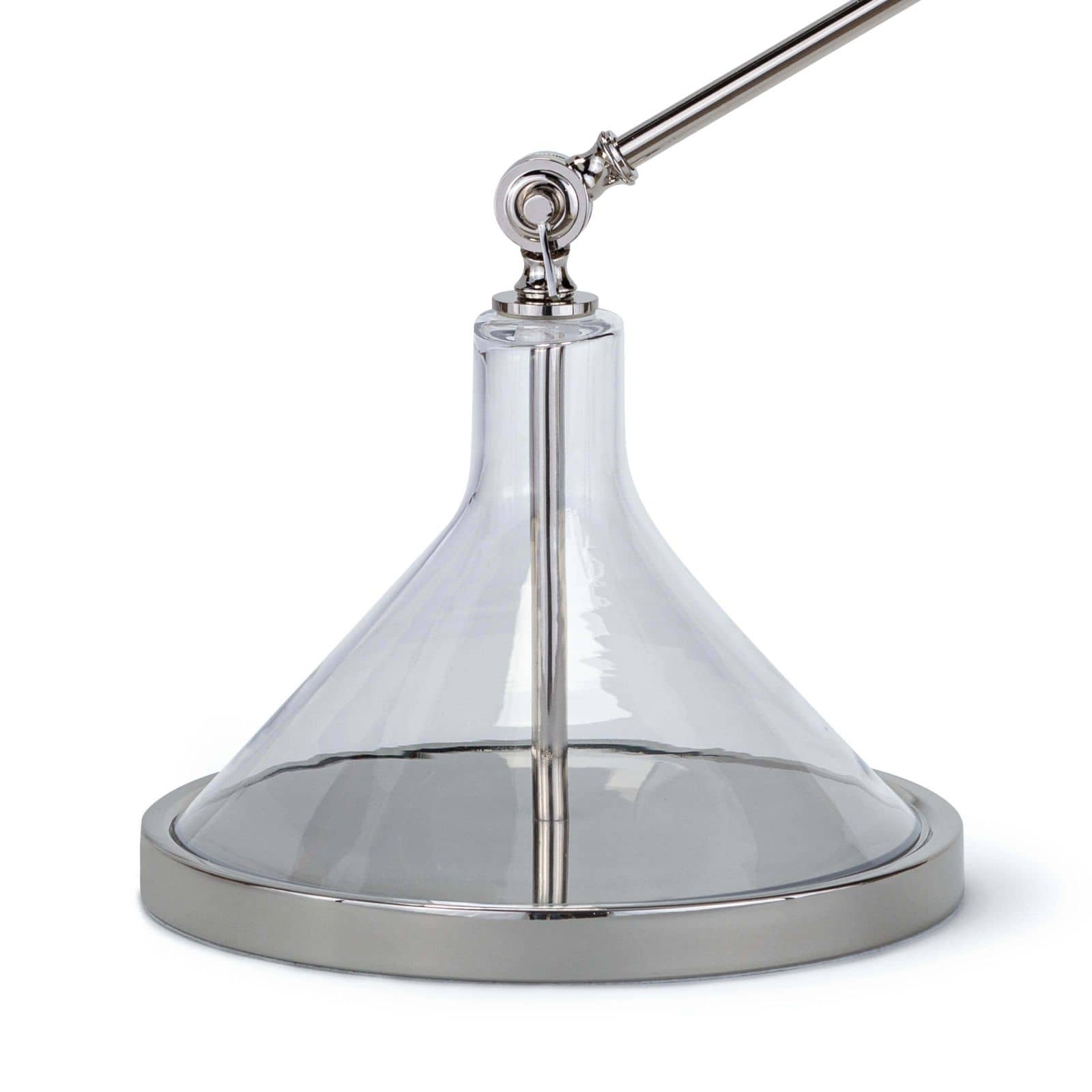 Crafted with precision, the Ibis Task Lamp allows for versatile positioning, making it ideal for tasks such as reading and writing. Its sleek design, with a contemporary-meets-industrial feel, includes a swiveling white metal beaker shade and a complementary glass beaker base.