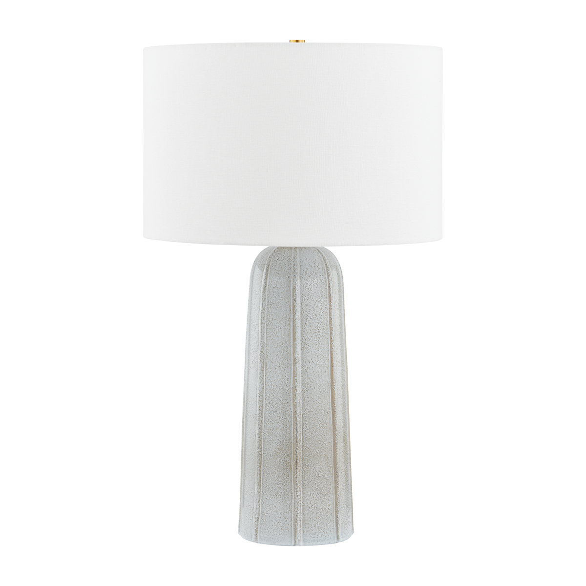 The Maren lamp celebrates the beauty of nature by blending rustic and refined elements. The reactive ash ceramic body, reminiscent of a sandstorm, features a raw, textural pattern. In contrast, the white linen shade floats like a delicate cloud. A touch of Aged Brass at the neck provides a flawless finish.