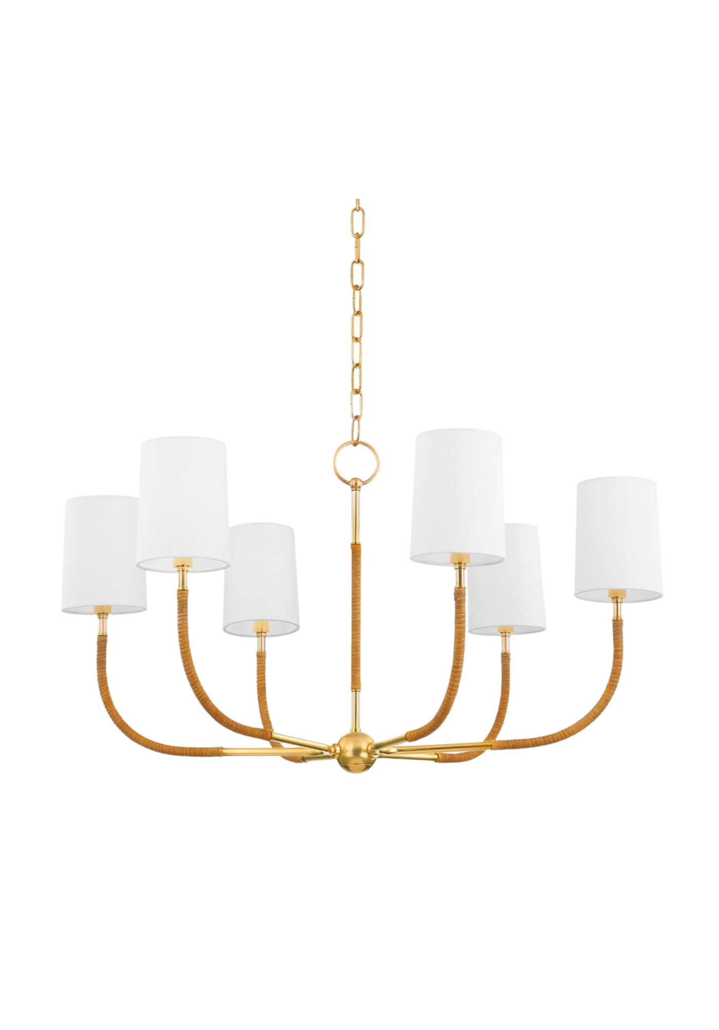 A classic silhouette with an organic twist, the Alaina Chandelier combines the best of both worlds. Sparkling Aged Brass arms and white linen shades are accented with delicate natural rattan wrapping, giving this chandelier a soft and luxurious feel.