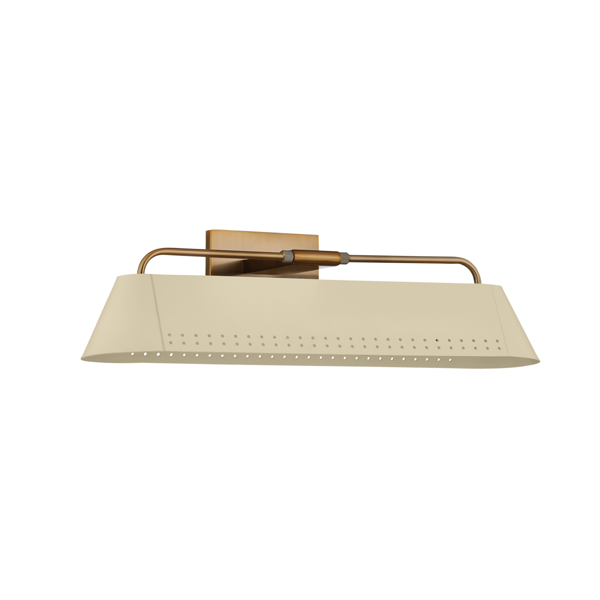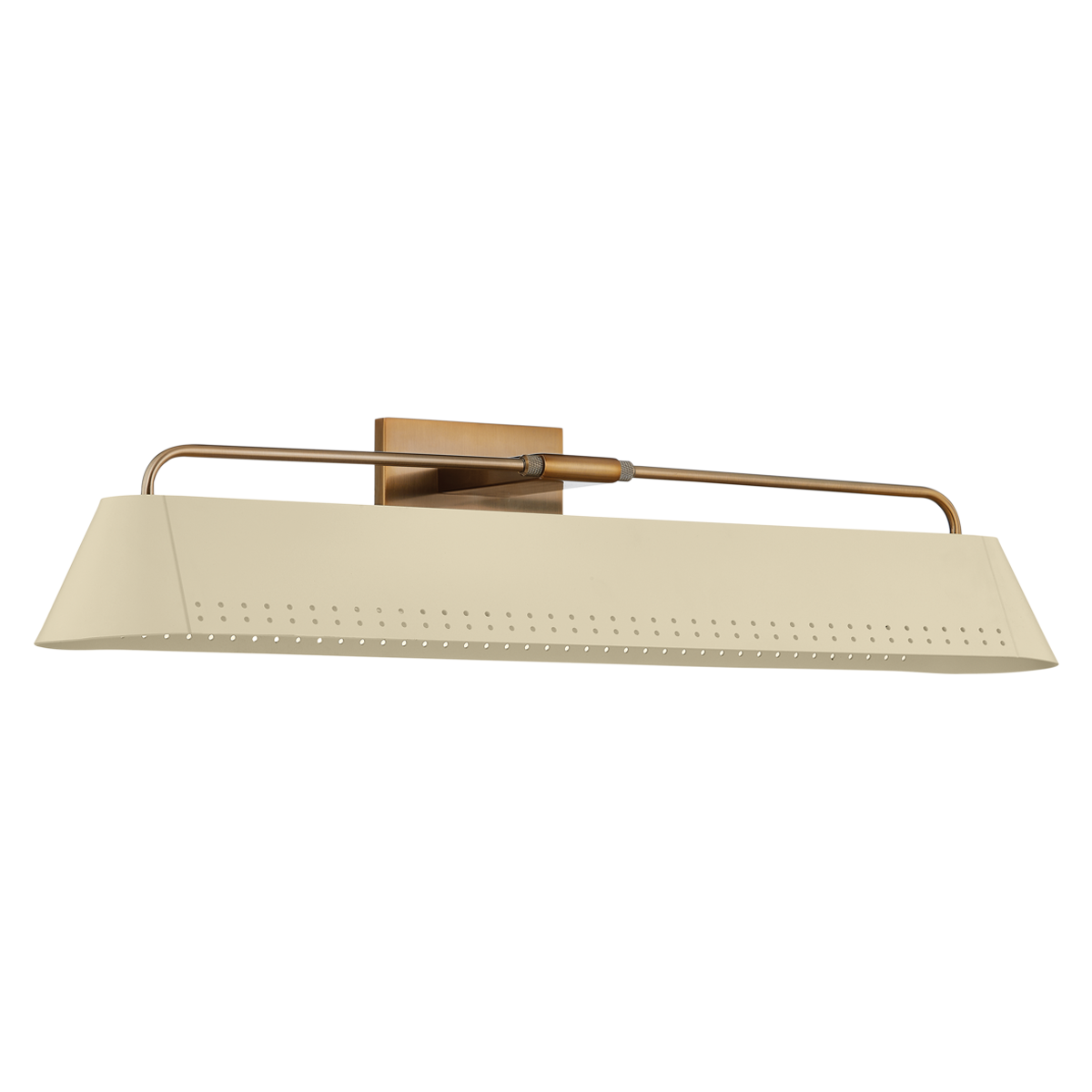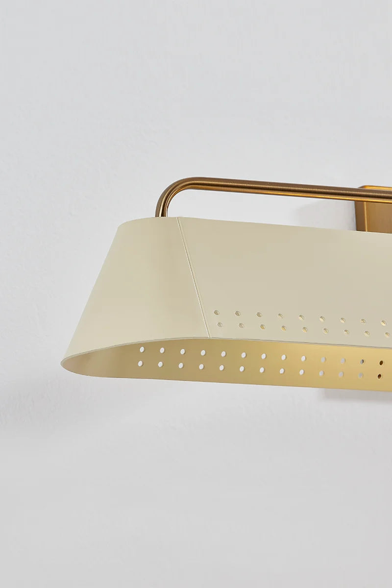 Brynn offers a stylish lighting solution for walls or pictures in a sleek tapered racetrack shape. The Soft Sand shade features small perforations for enhanced lighting coverage and a touch of decoration. Available in two sizes with a Patina Brass finish.