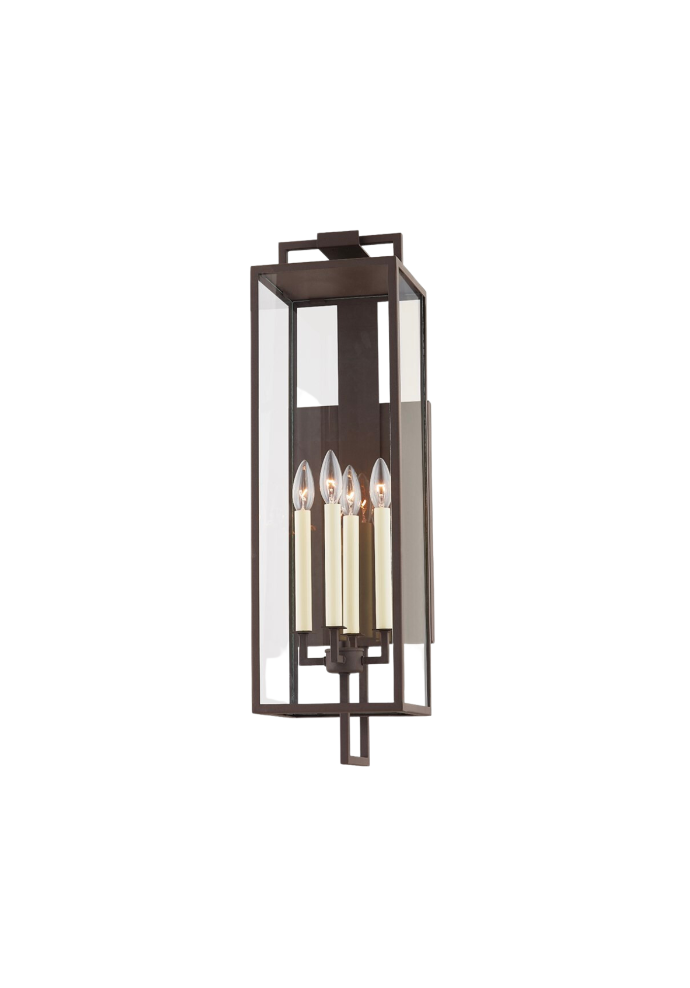 Enhance your outdoor space with the Publius Outdoor Sconce. Its slender metal framework and large panels of clear glass create a modern, stately look that is further elevated by its classic candlestick bulbs. The texture bronze finishes bring an extra touch of elegance to your outdoor space!