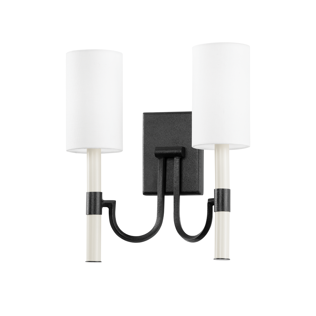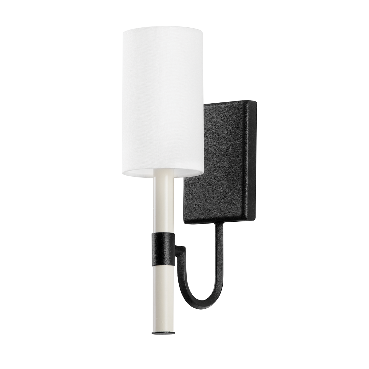 This sconce, defined by its elegant downward sweeping arm, extends into a single tube that holds a cream-colored candle sleeve, blending sophistication with simplicity. The Forged Iron finish adds a dramatic, textured appeal, perfect for enhancing the ambiance of any interior space.