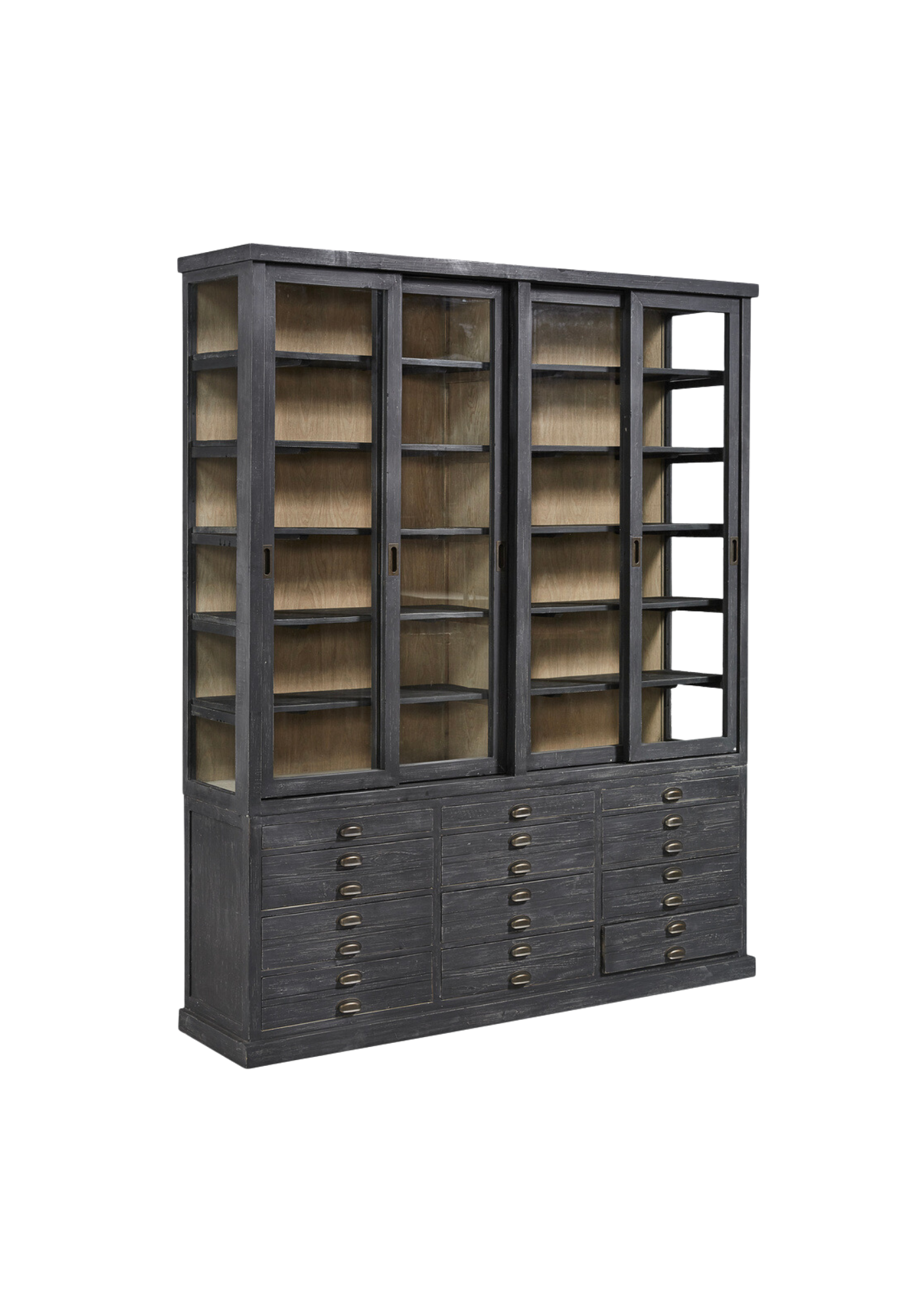 A stunning statement piece, this majestic cabinet offers plenty of display shelves behind sliding doors, as well as a twelve drawer base for all your storage needs. Crafted from reclaimed fir and finished in deep charcoal, it's beautifully highlighted with antique brass cup pulls that bring a bright touch.